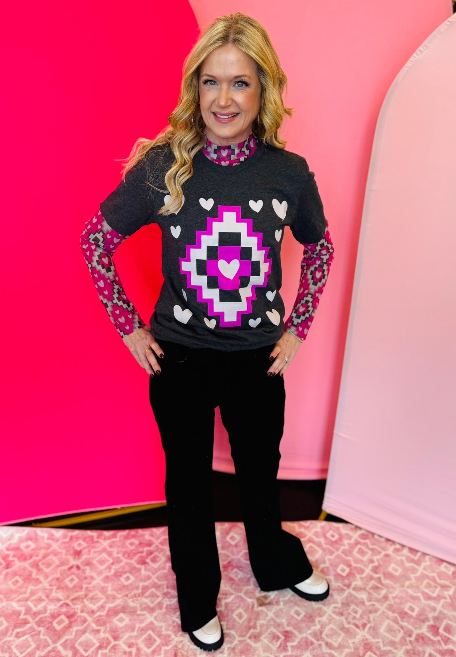 This adorable Struck By Cupid Tee is both cute and comfortable, allowing you to stay stylish without sacrificing comfort. Its matching mesh adds an extra touch of charm.