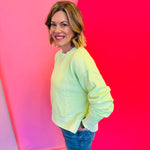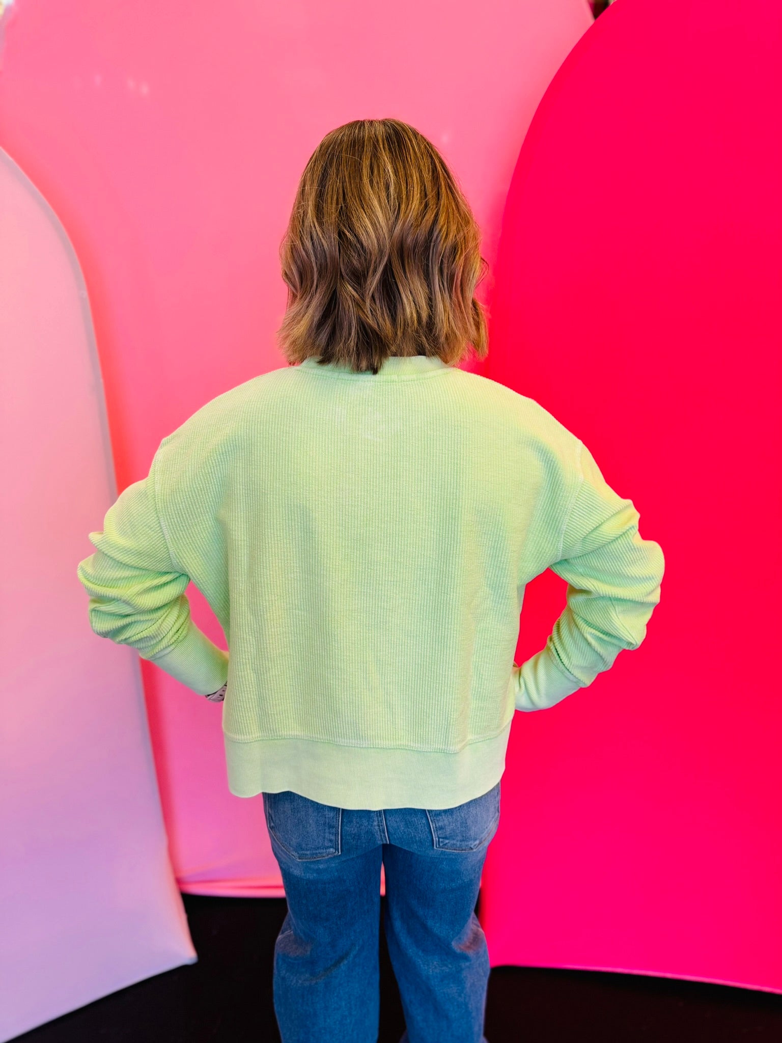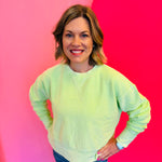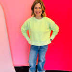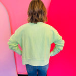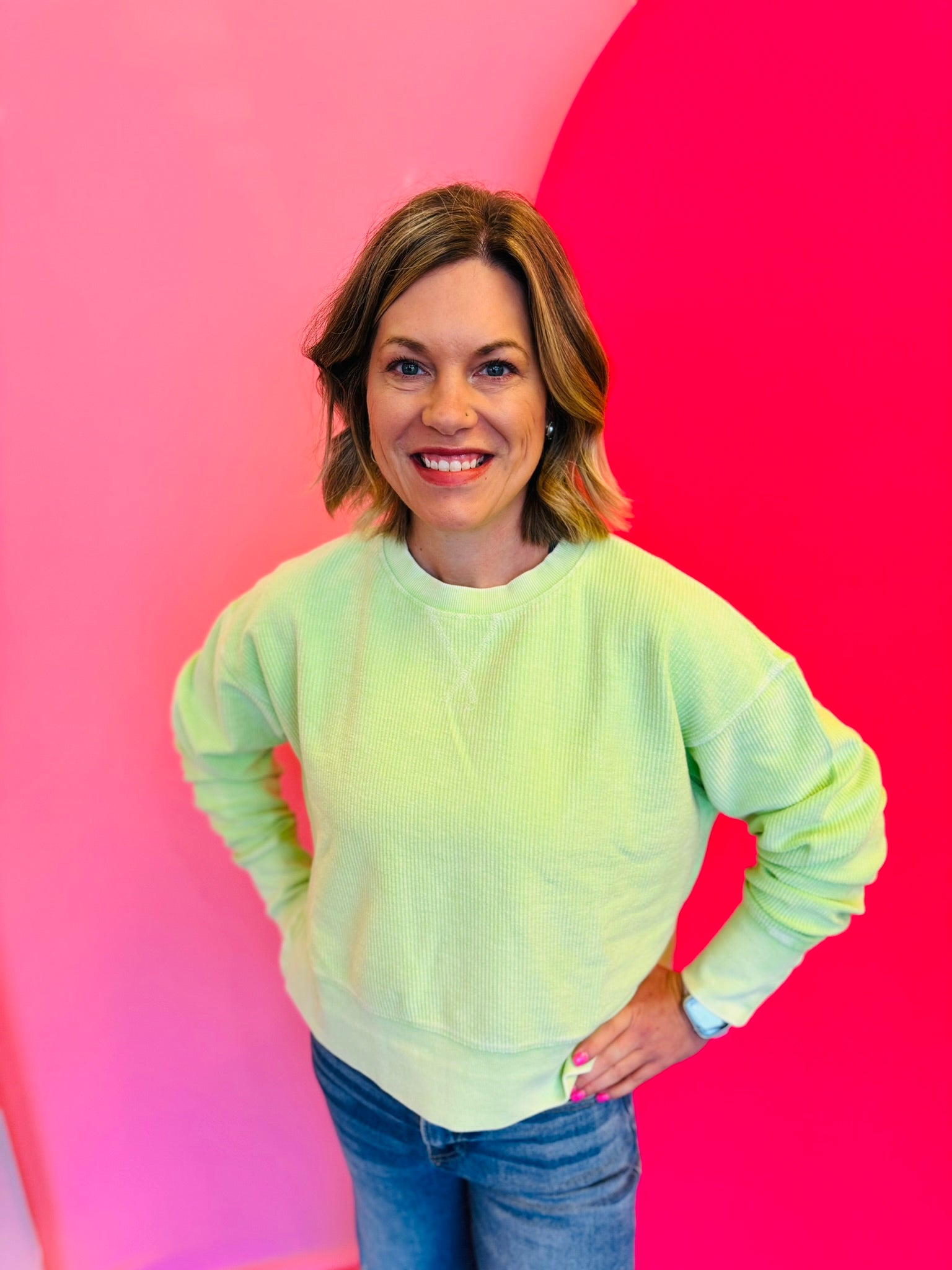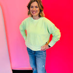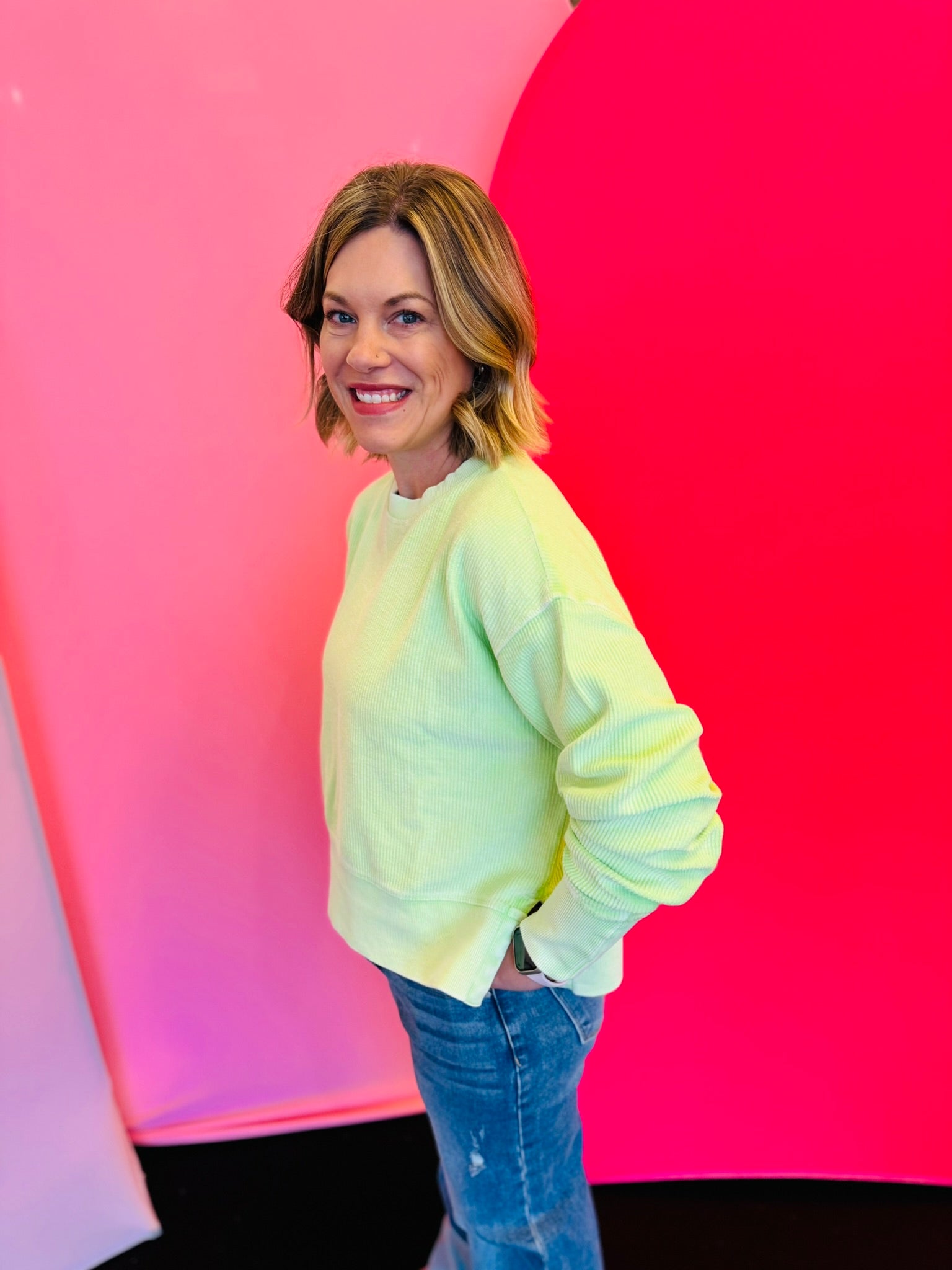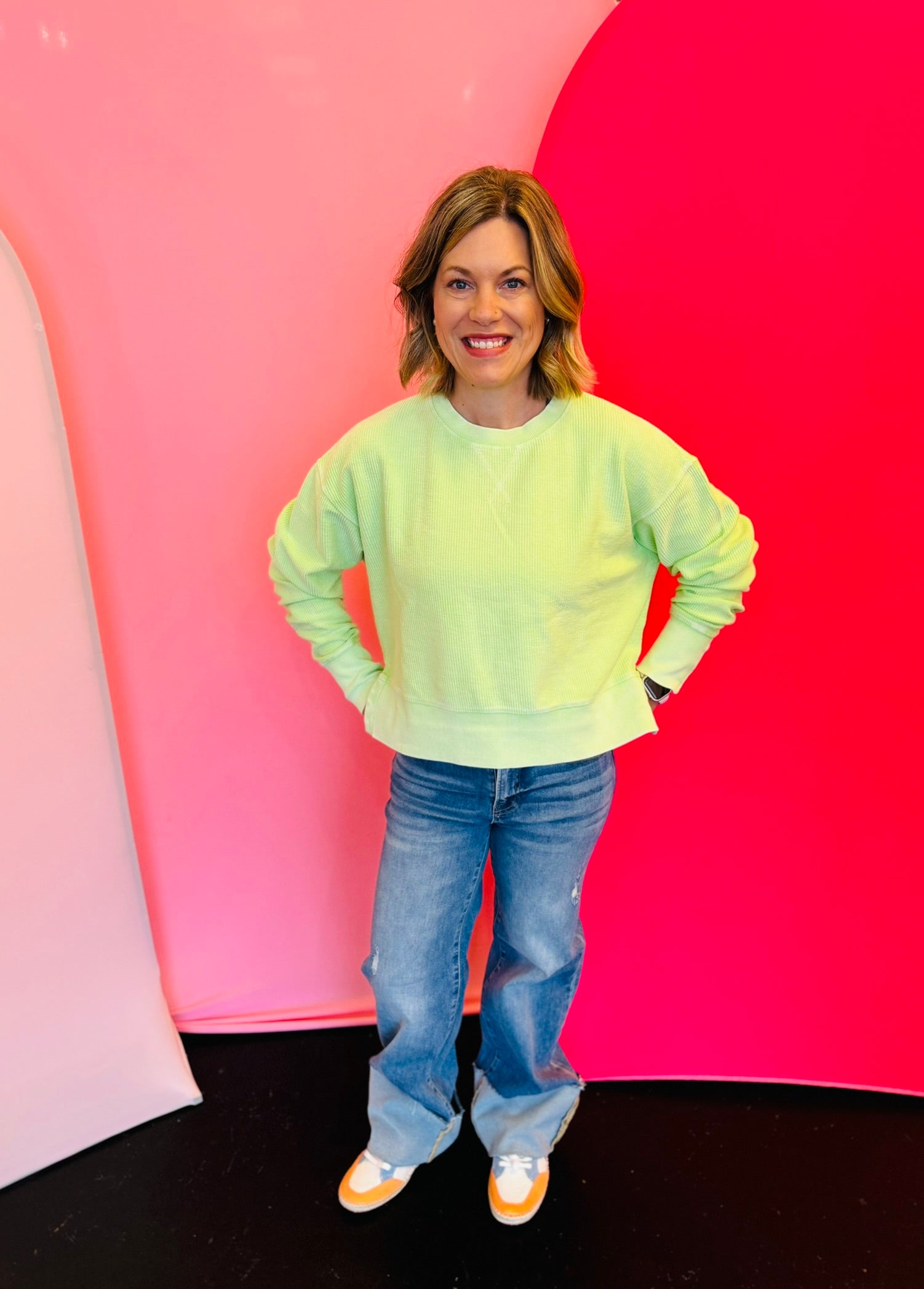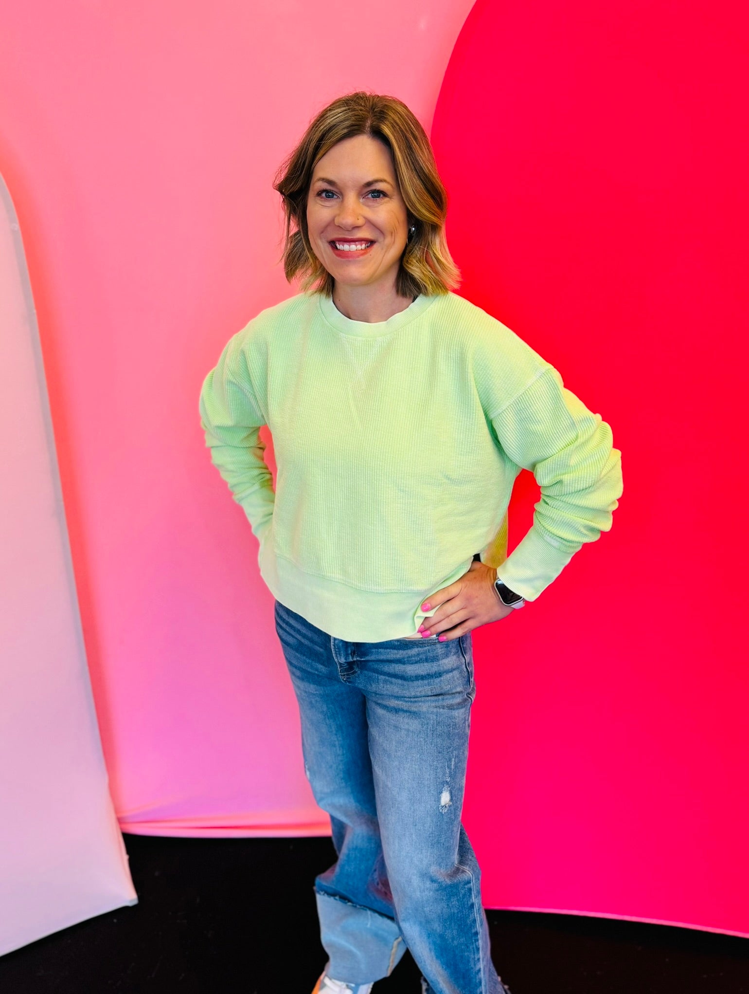 Our Summer Green Corded Crew is the perfect addition to your summer wardrobe. Made with lightweight fabric, this mom crop length sweatshirt has a unique corded texture and features a trendy side slit. Perfect for staying stylish and comfortable all season long!