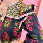 Discover bohemian charm with a polished edge in our Black Multi-Print Ruffle Puff Sleeve Top. This chic black blouse is adorned with vibrant red and gold floral prints, creating a striking and luxurious aesthetic. The flutter ruffle shoulders add a touch of feminine grace, while the long puff sleeves enhance its sophisticated silhouette. A contrasting striped V-neck band provides a modern twist, perfectly complementing the intricate patterns. Unlined, woven, and non-sheer, this lightweight top ensures breathable comfort and a relaxed fit, making it an ideal choice for both casual outings and more refined gatherings.