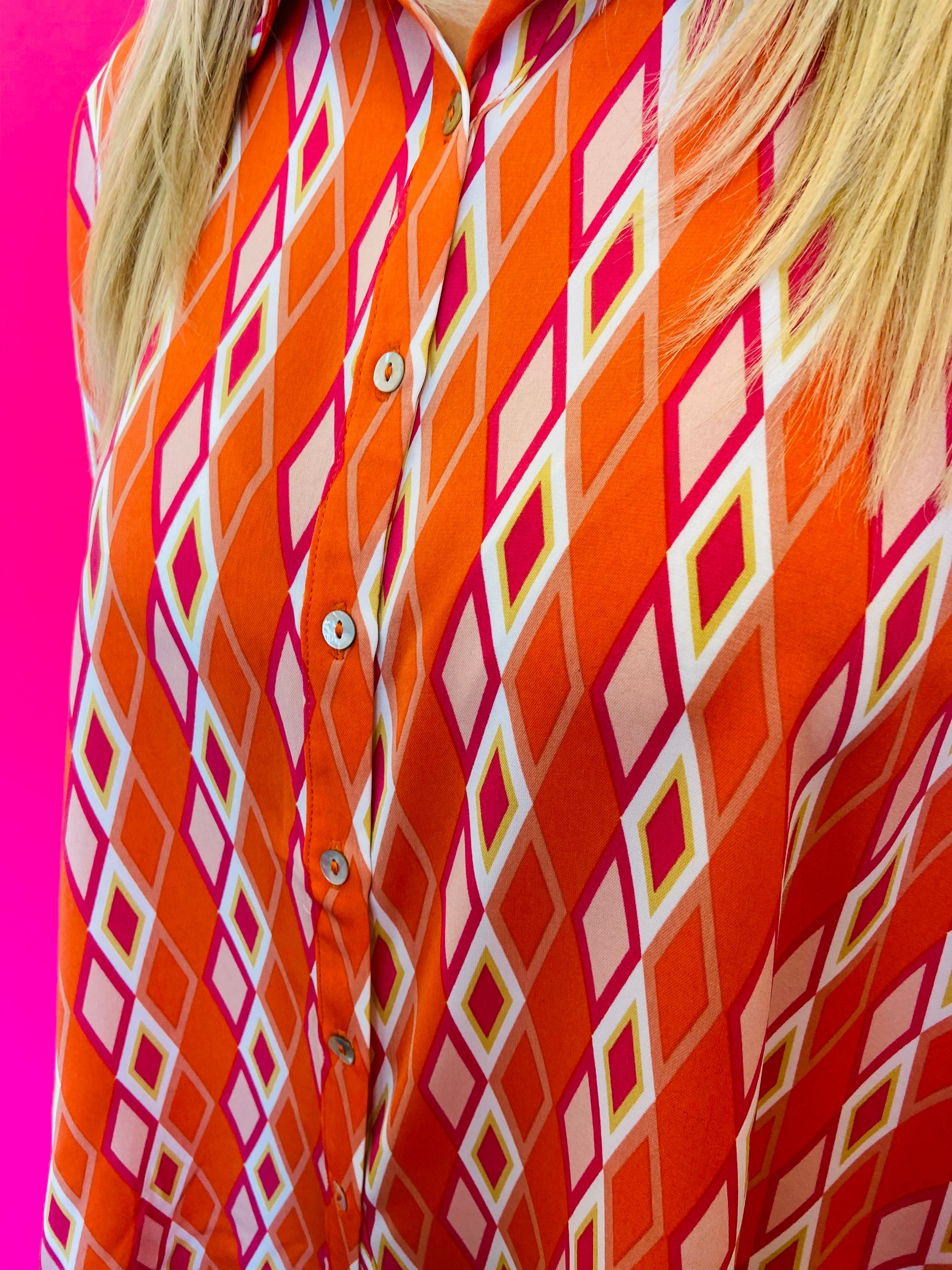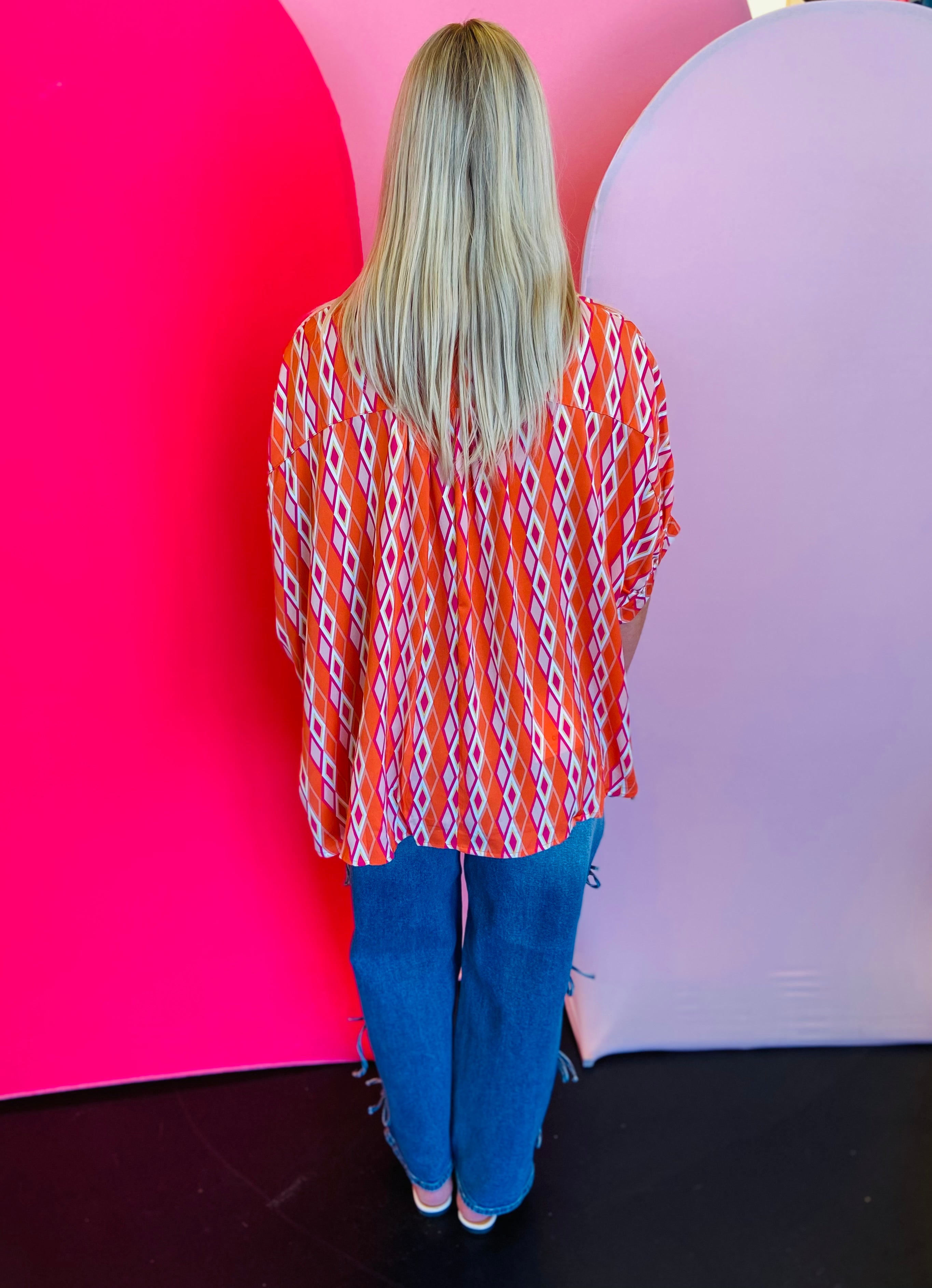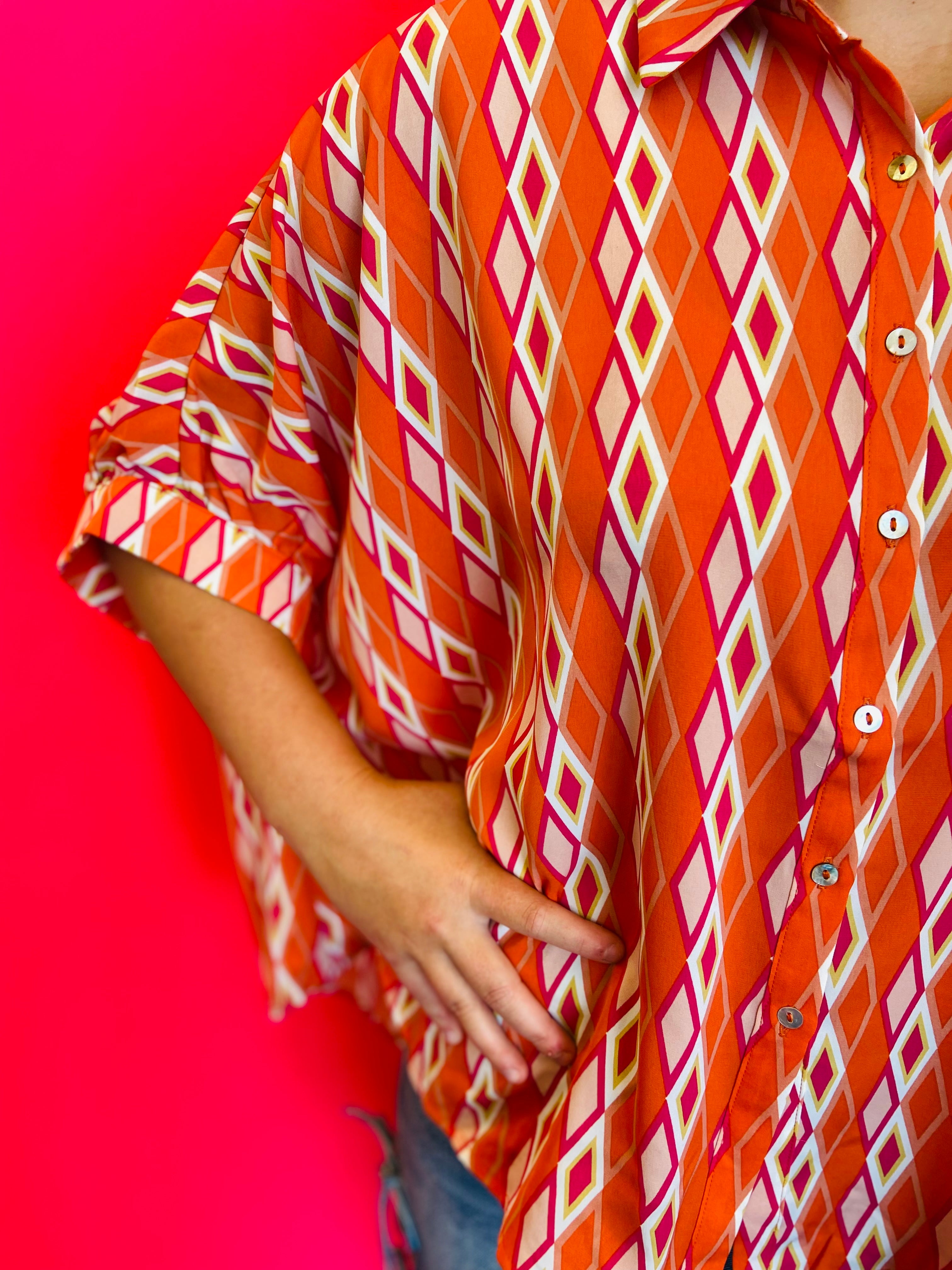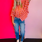 Add a burst of color and sophistication to your wardrobe with our Tangerine Print Dolman Sleeve Top. Featuring an eye-catching print and elevated design details, this blouse blends elegance with modern flair. The lightweight, silky fabric drapes beautifully, making it the perfect statement piece for both work and weekend wear.