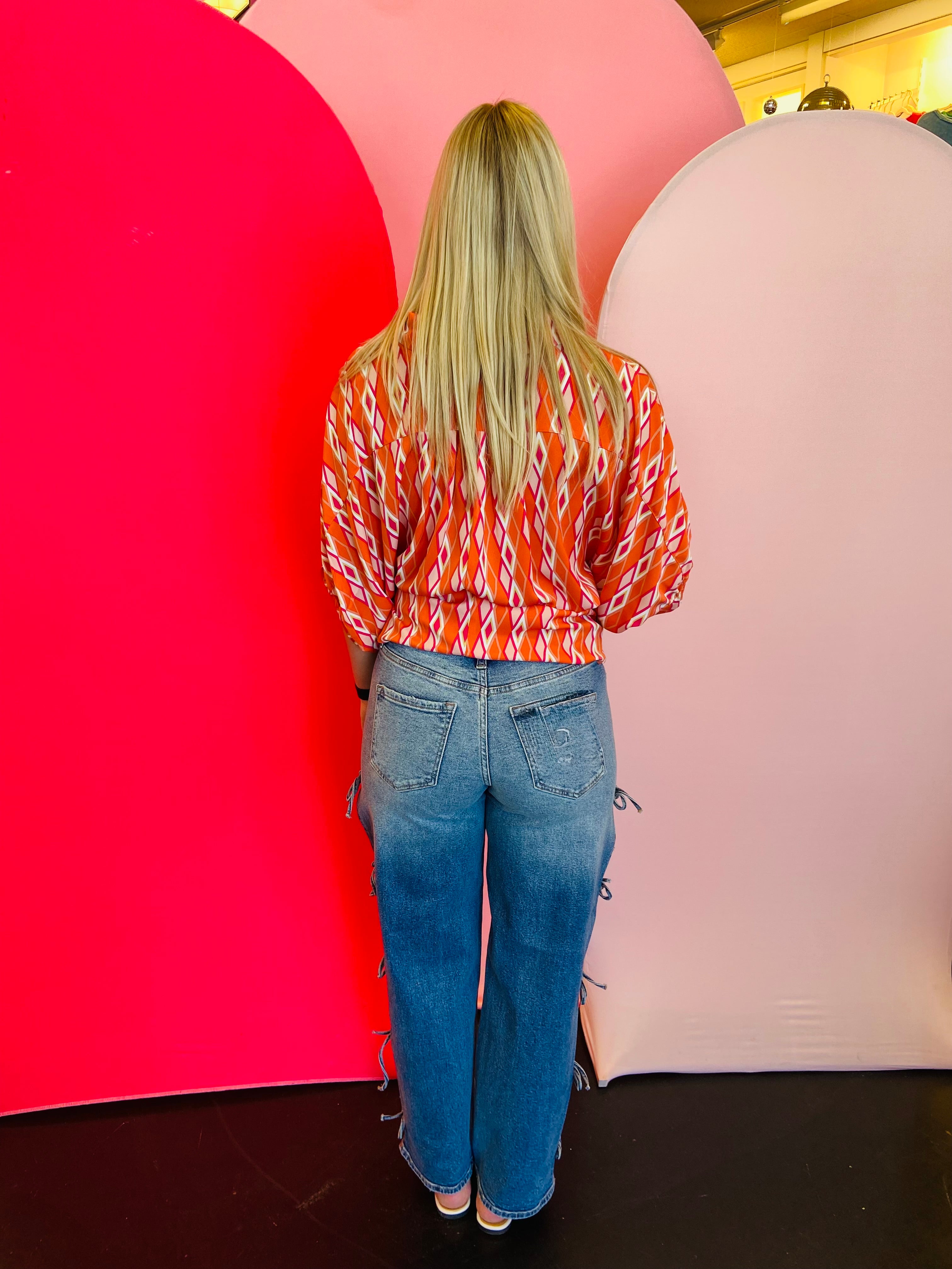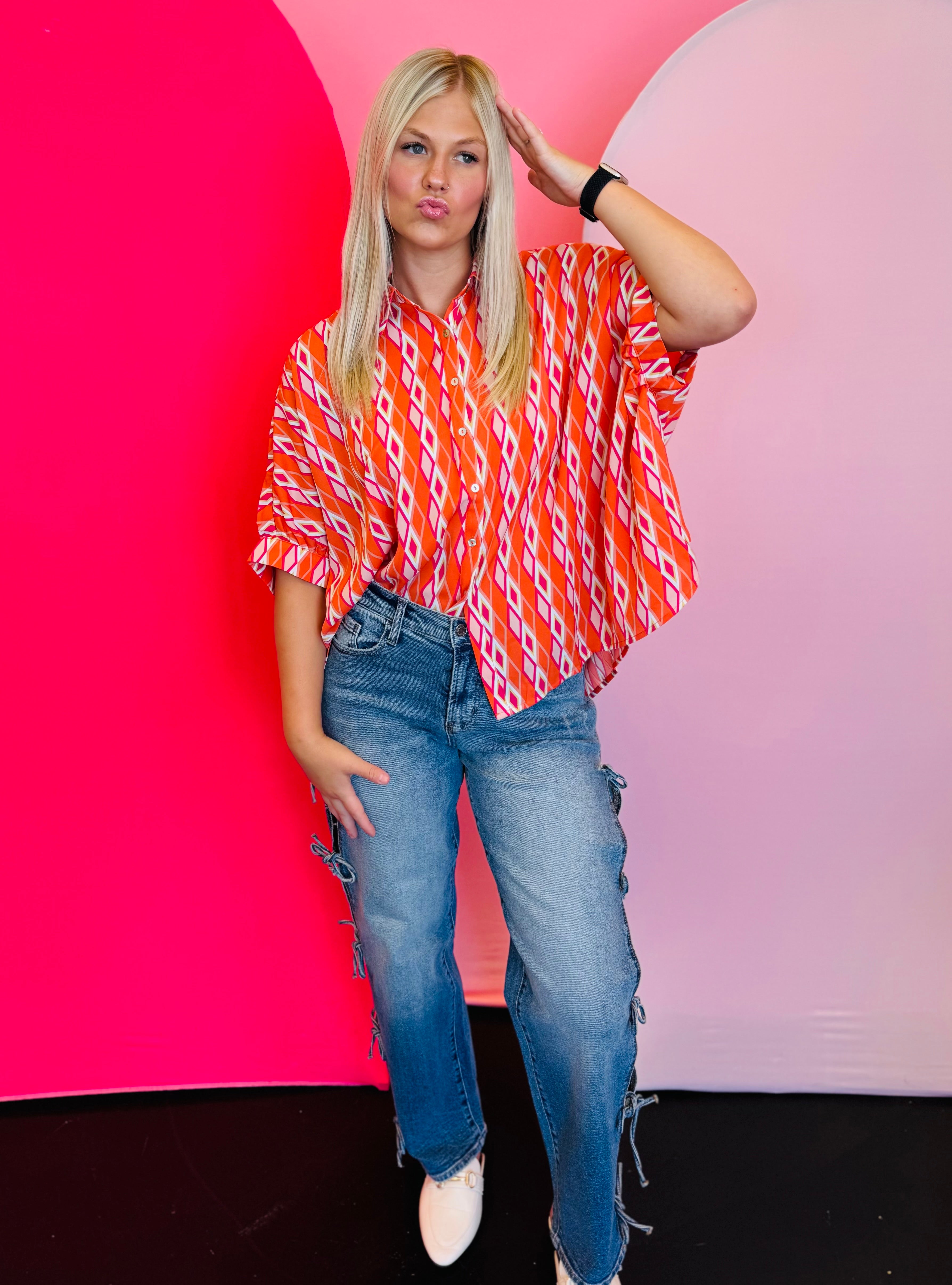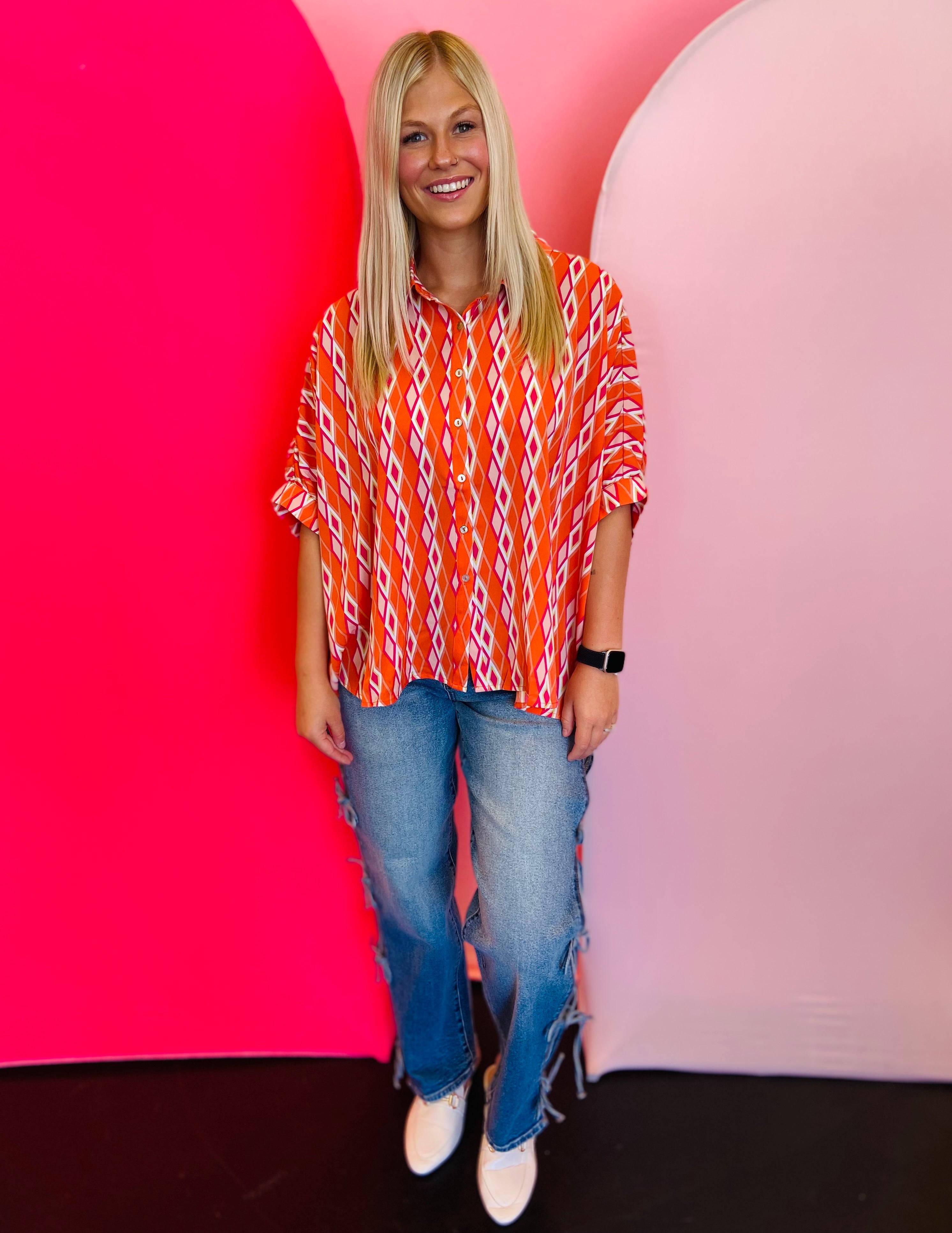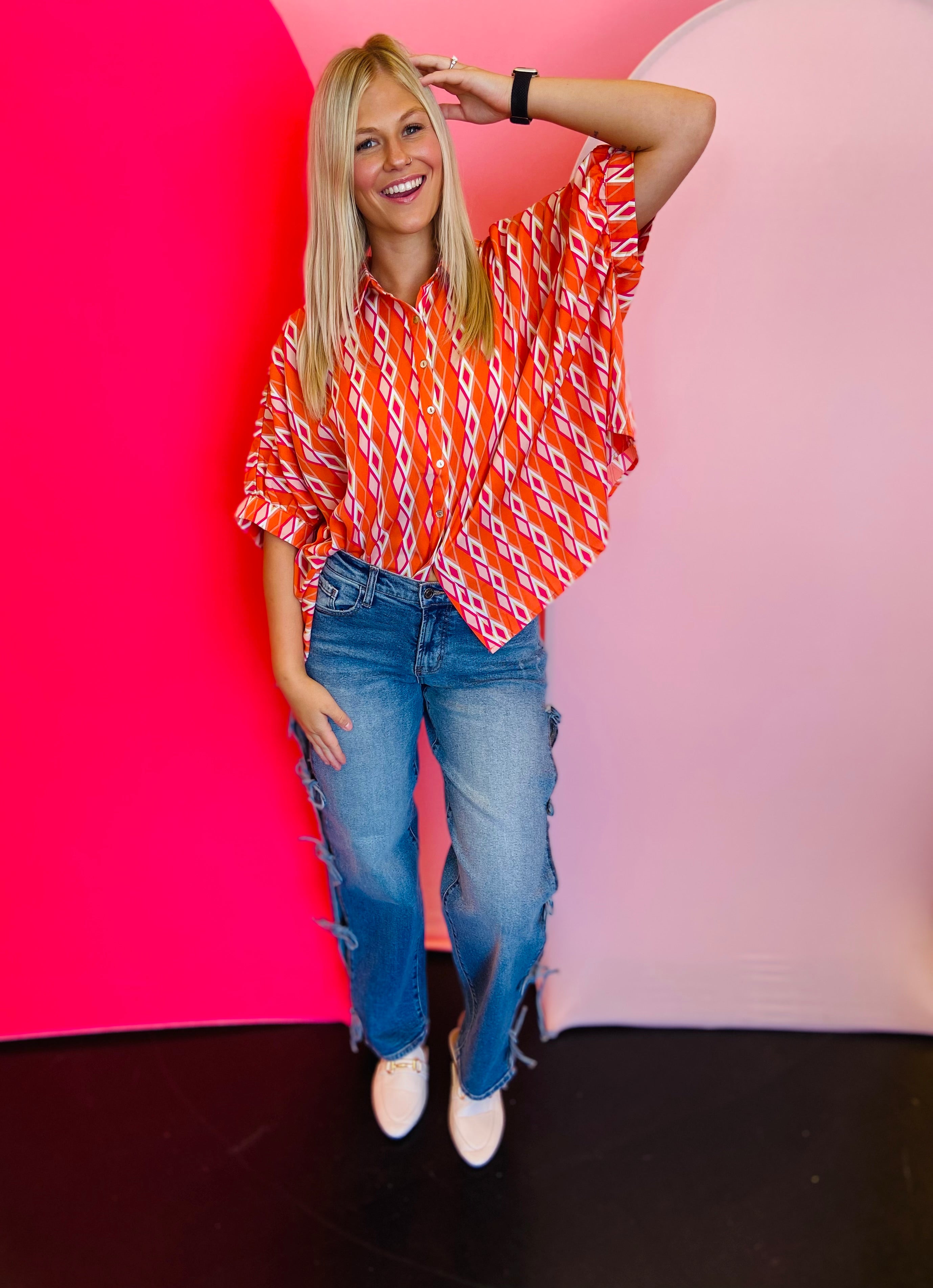 Add a burst of color and sophistication to your wardrobe with our Tangerine Print Dolman Sleeve Top. Featuring an eye-catching print and elevated design details, this blouse blends elegance with modern flair. The lightweight, silky fabric drapes beautifully, making it the perfect statement piece for both work and weekend wear.