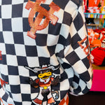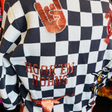 Arm view of Queen of Sparkles UT orange and black checkered cardigan with sequin and beading and rhinestone buttons.
