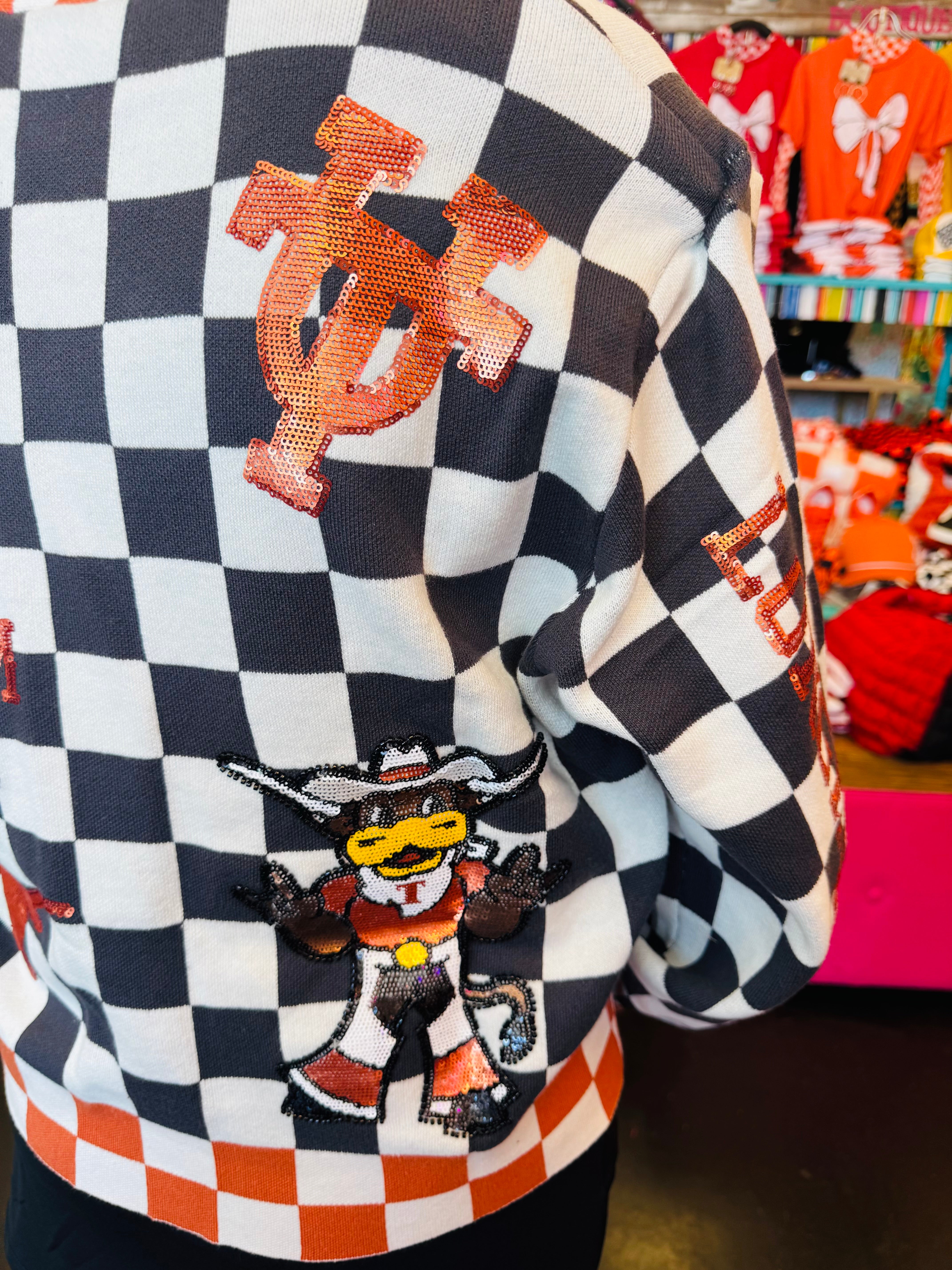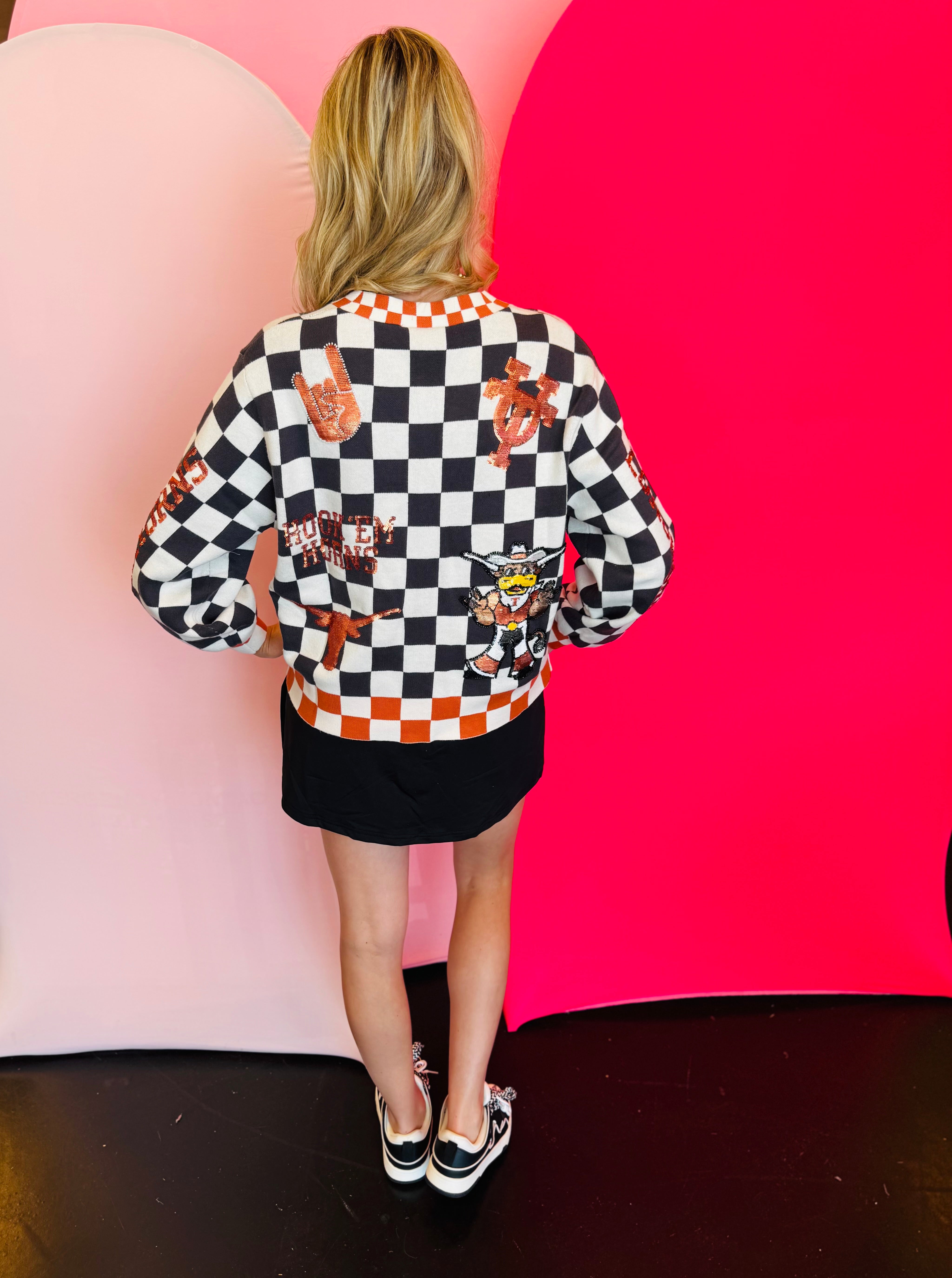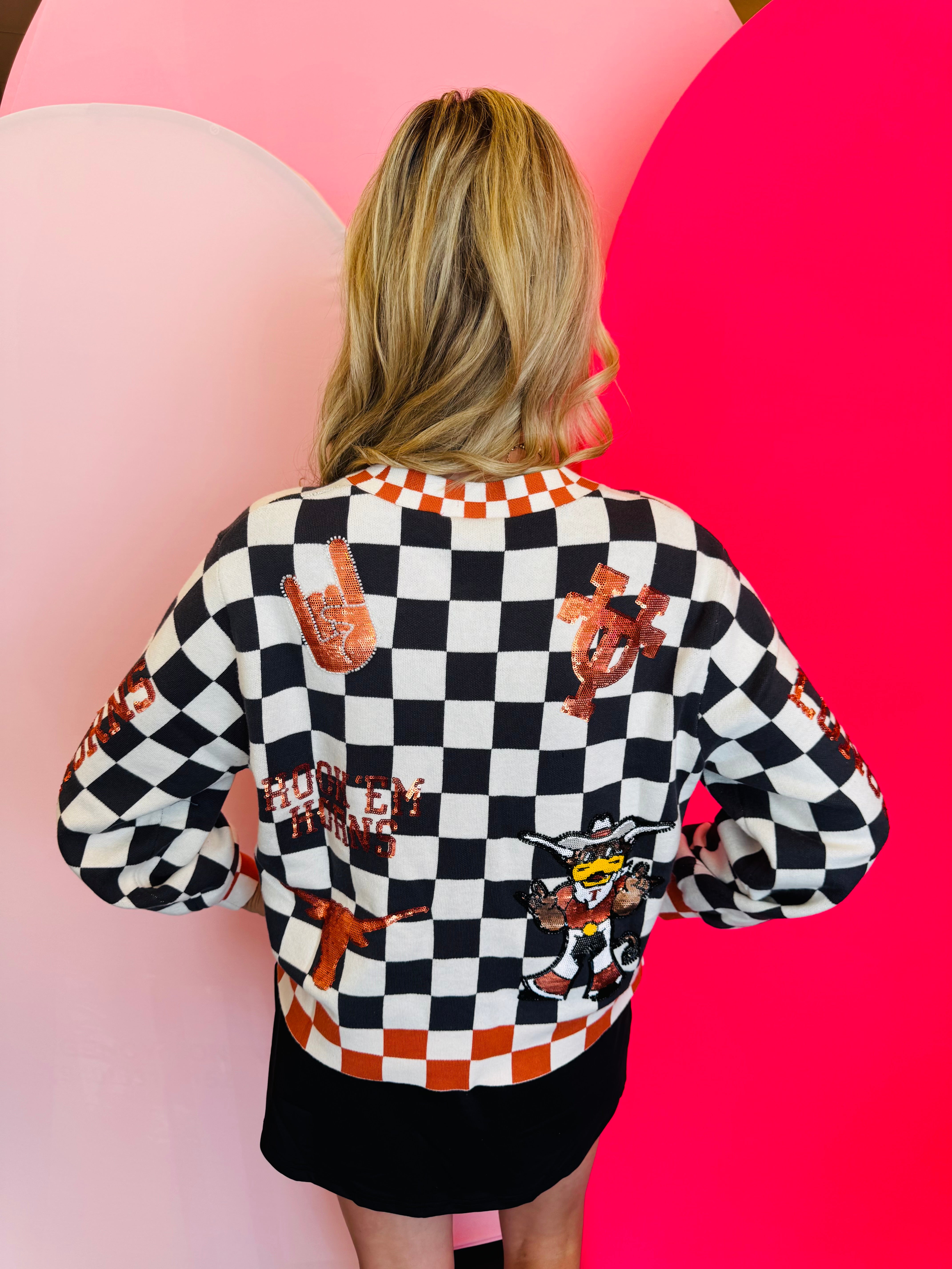Back side of Queen Of Sparkles checkered University Of Texas  game day sequin cardigan.