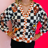 The Queen of Sparkles Texas Checkered Team Icons Cardigan brings spirited style and bold sparkle to your look. With burnt orange accents, sequin icons, and intricate details, this oversized cardigan is perfect for showing your UT pride in standout fashion.