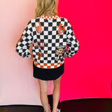 Back view of Queen of Sparkles UT orange and black checkered cardigan with sequin and beading and rhinestone buttons.
