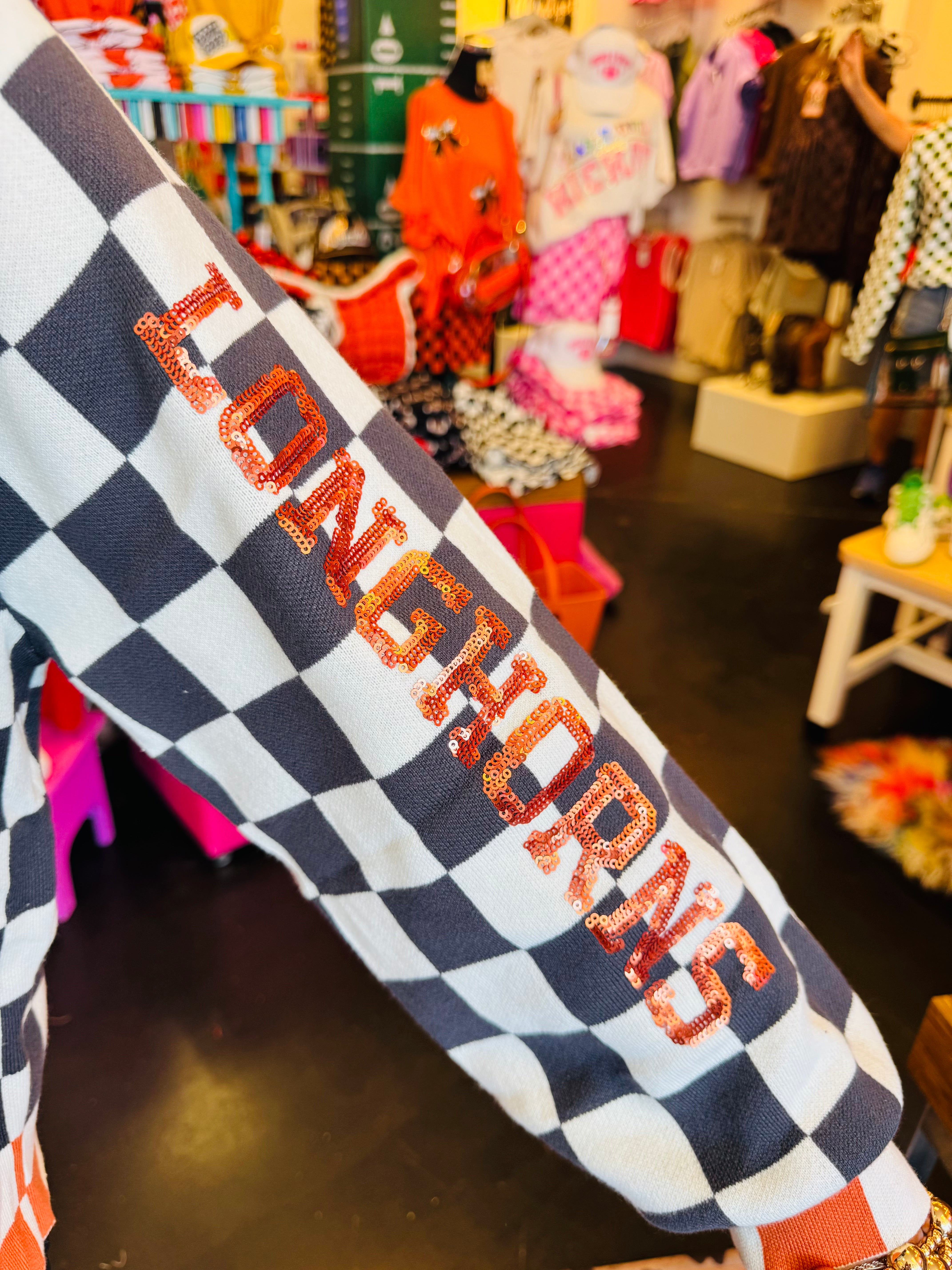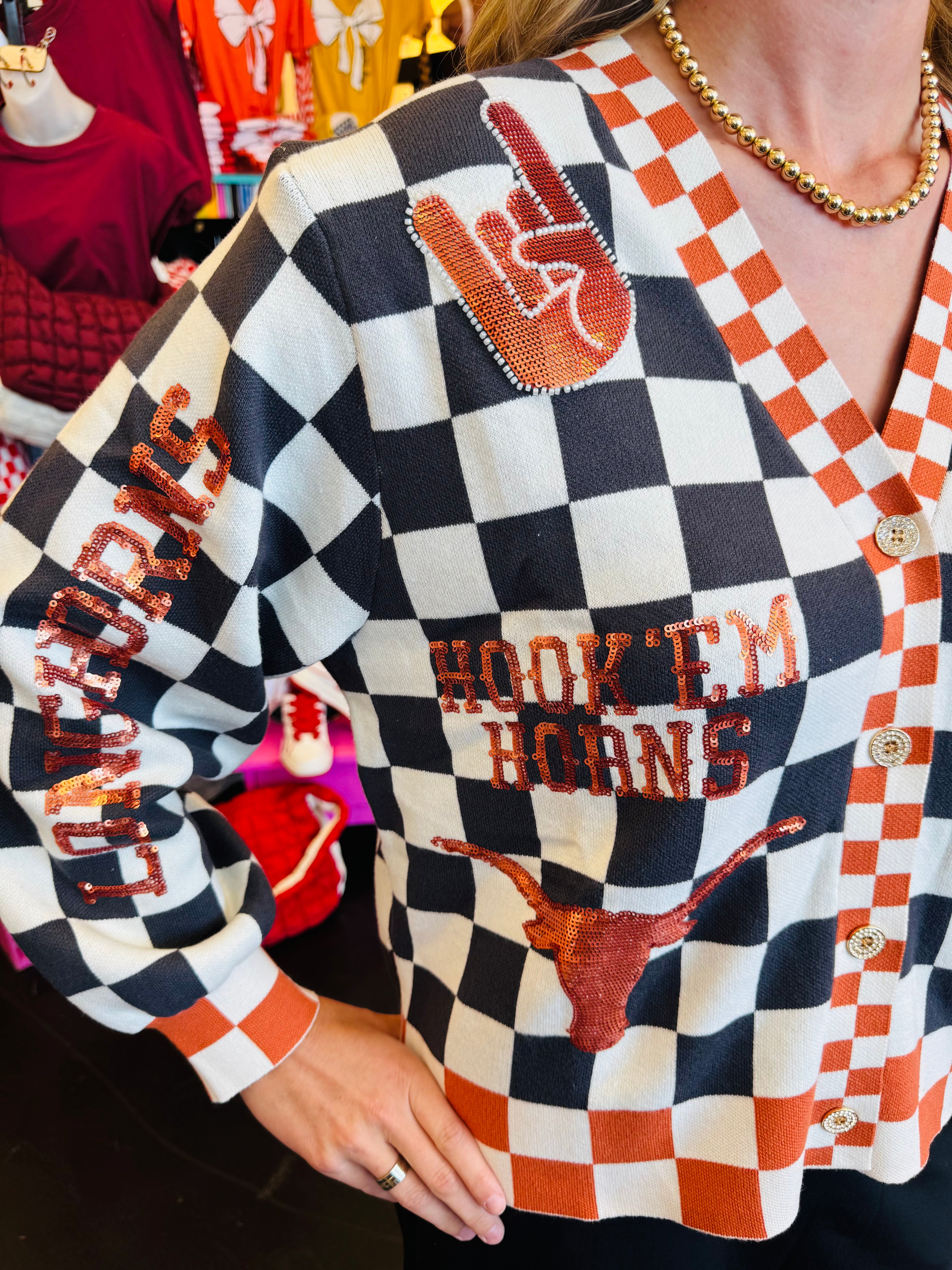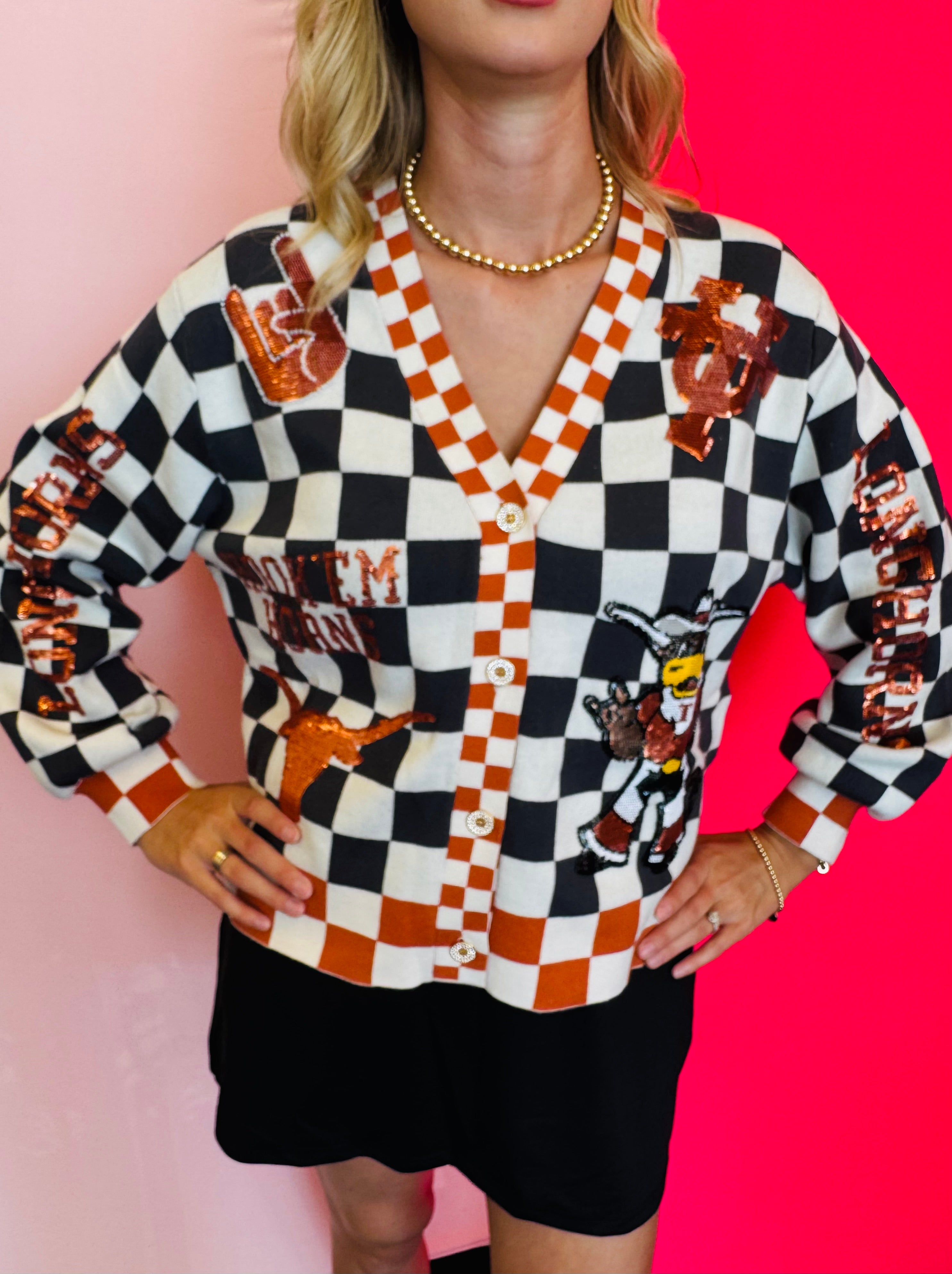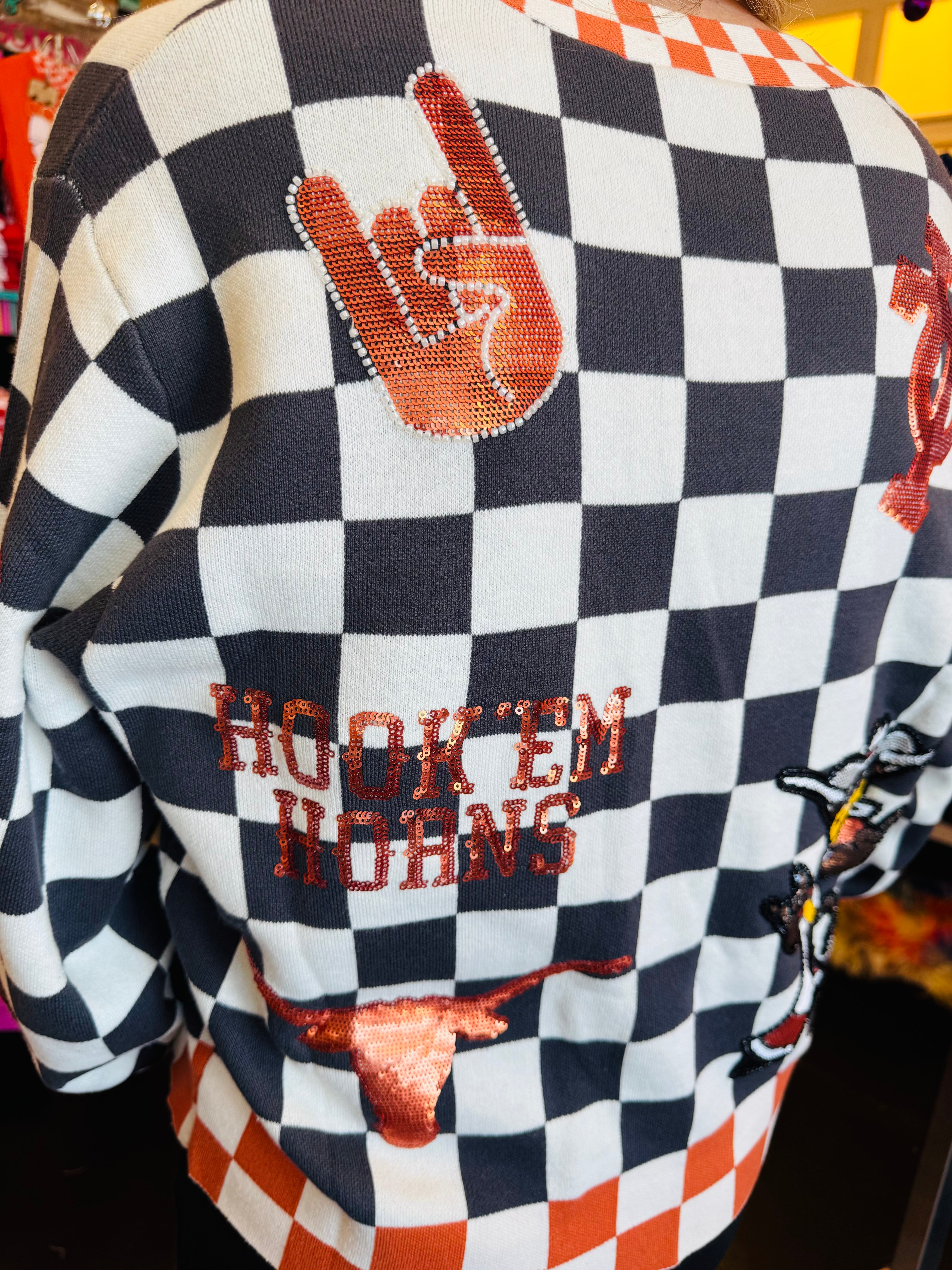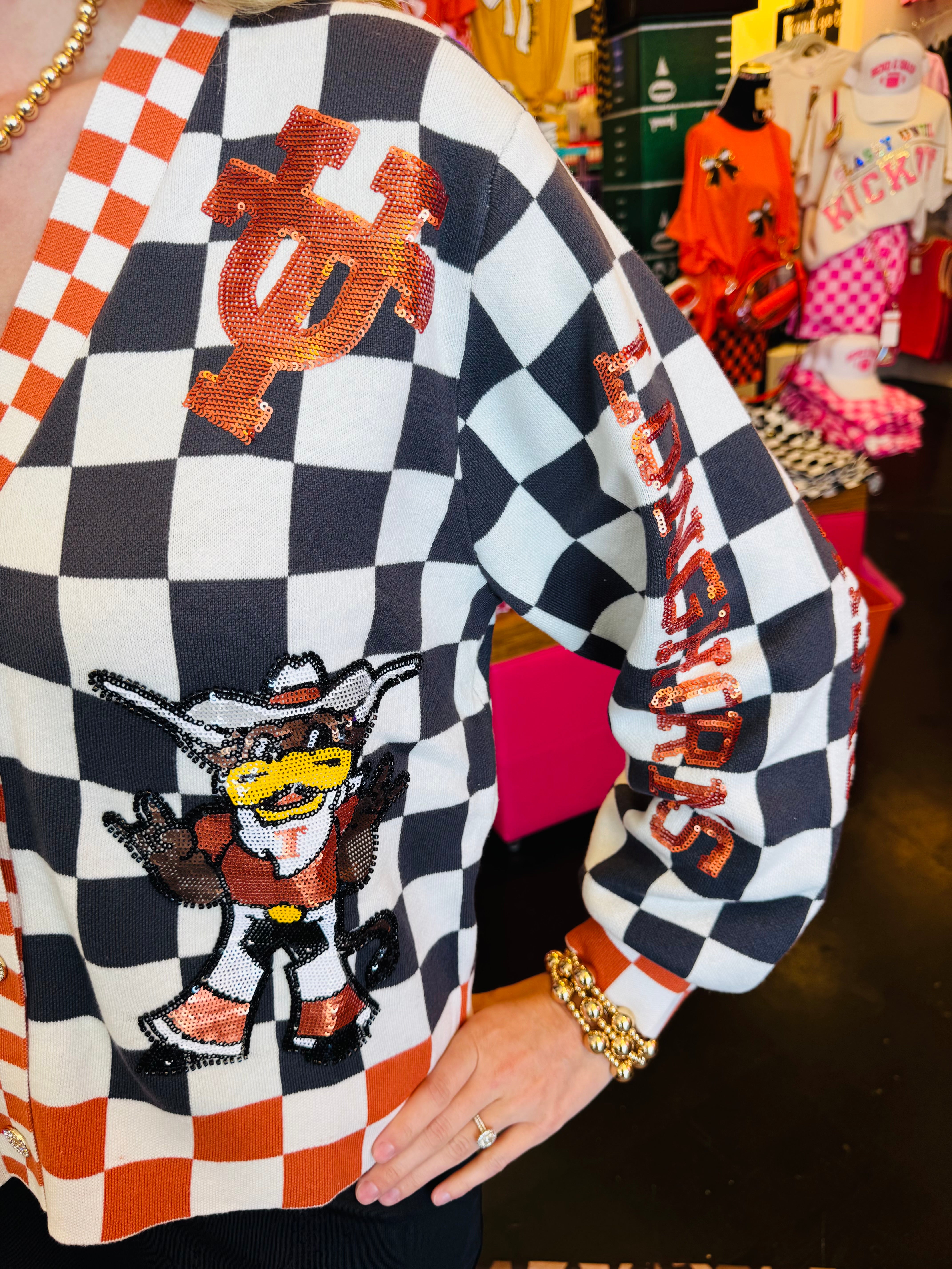 Queen Of Sparkles checkered University Of Texas  game day sequin cardigan.