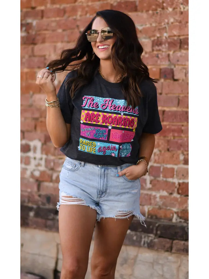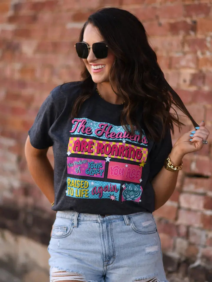Share a powerful message in style with The Heavens Are Roaring Tee. This classic charcoal tee is crafted from a soft and comfortable blend, making it perfect for everyday wear. It features a stunning, colorful graphic that reads, "The Heavens Are Roaring, Raised To Life Again." The design showcases a vibrant mix of fonts and playful pops of pink, blue, and yellow, creating an eye-catching and inspiring look. It’s a beautiful way to wear your faith and spread a message of hope.