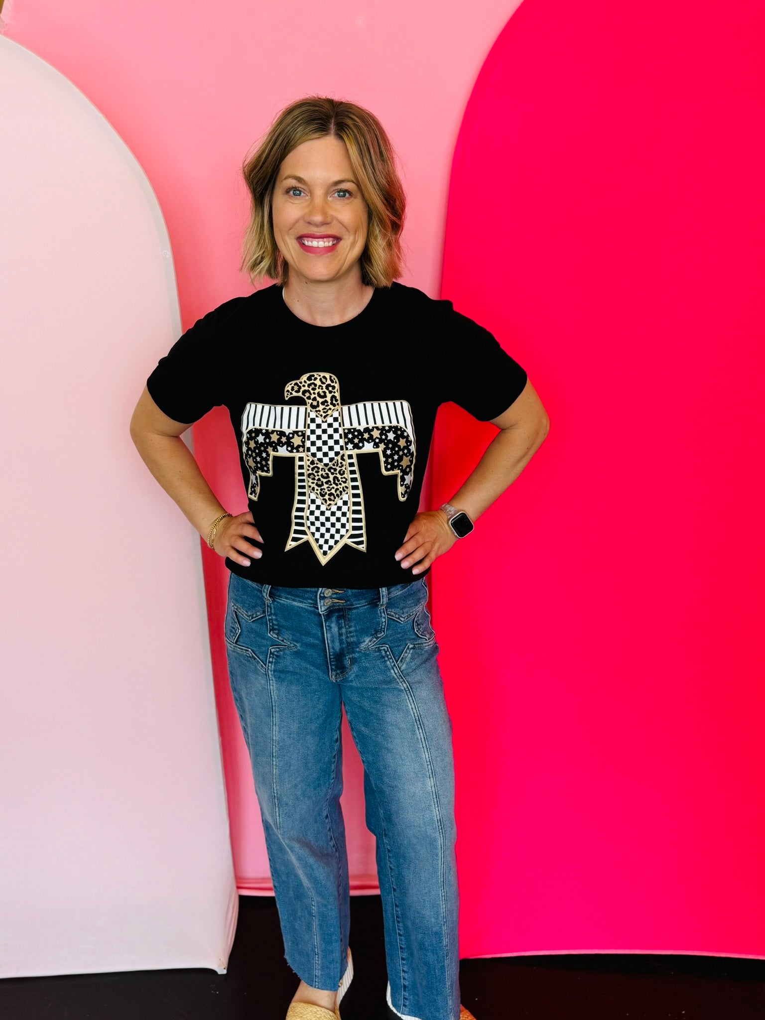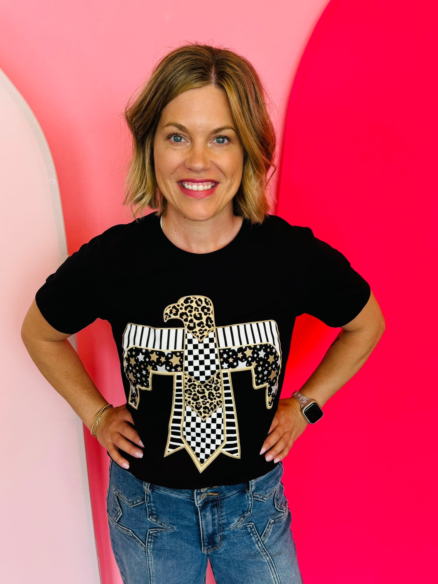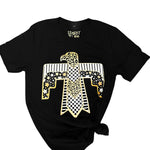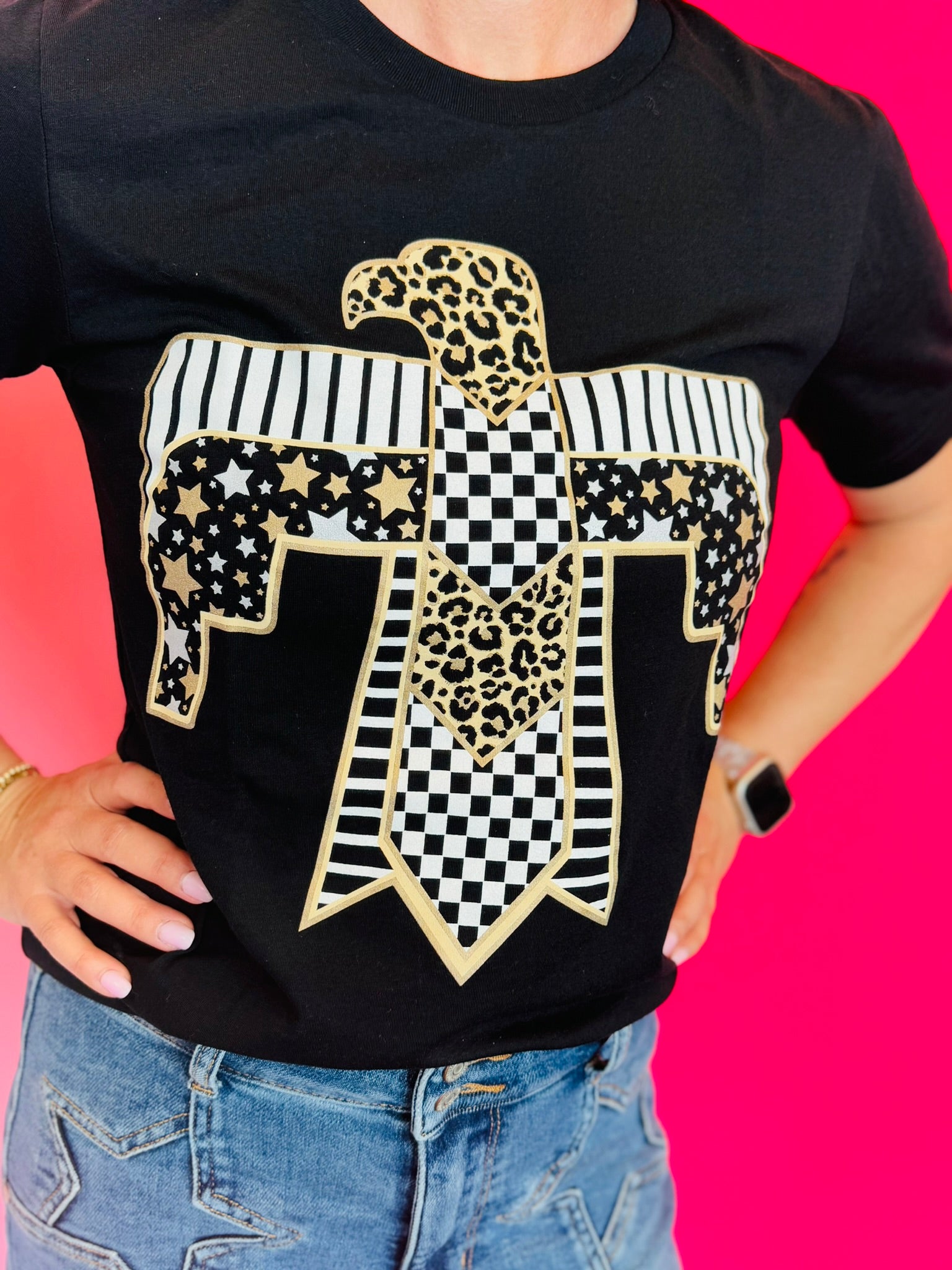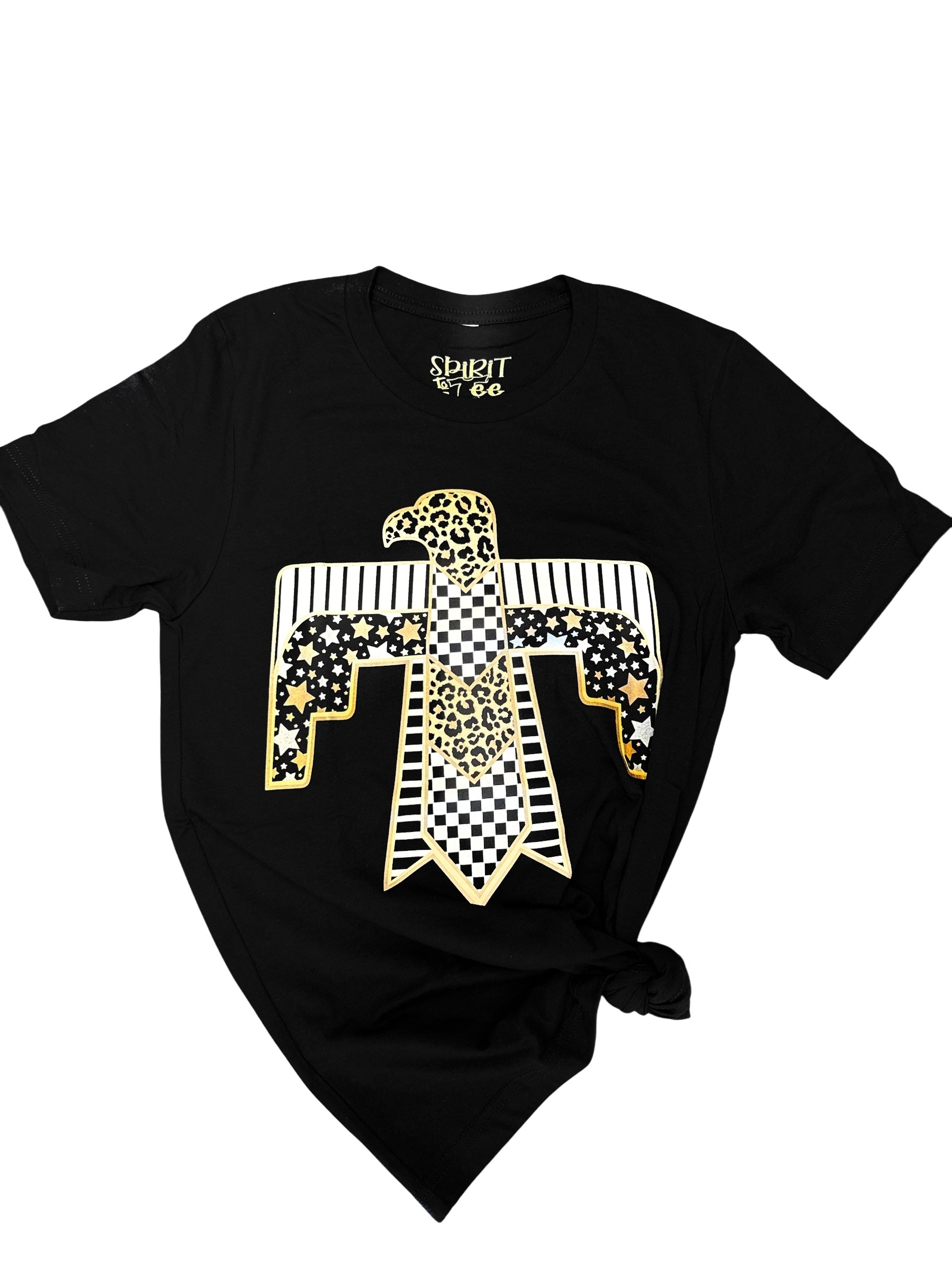 Stand out from the crowd with our Thunderbird Leopard Tee! Featuring a fierce eagle design in black and gold, with a mix of leopard print and stars, this black tee is for those who want to make a statement. Don't just wear clothes, express your individuality with this fearless and unique piece.