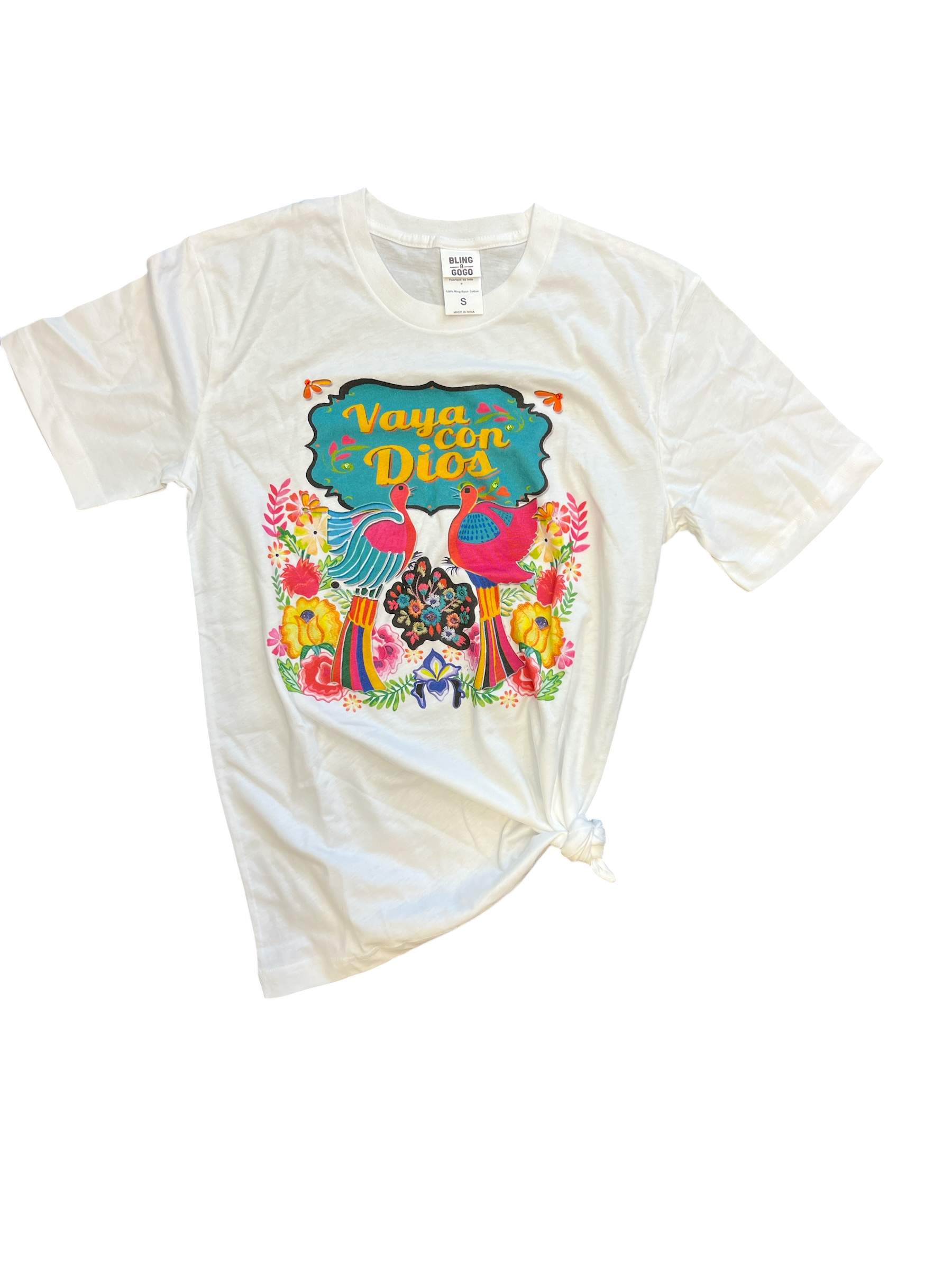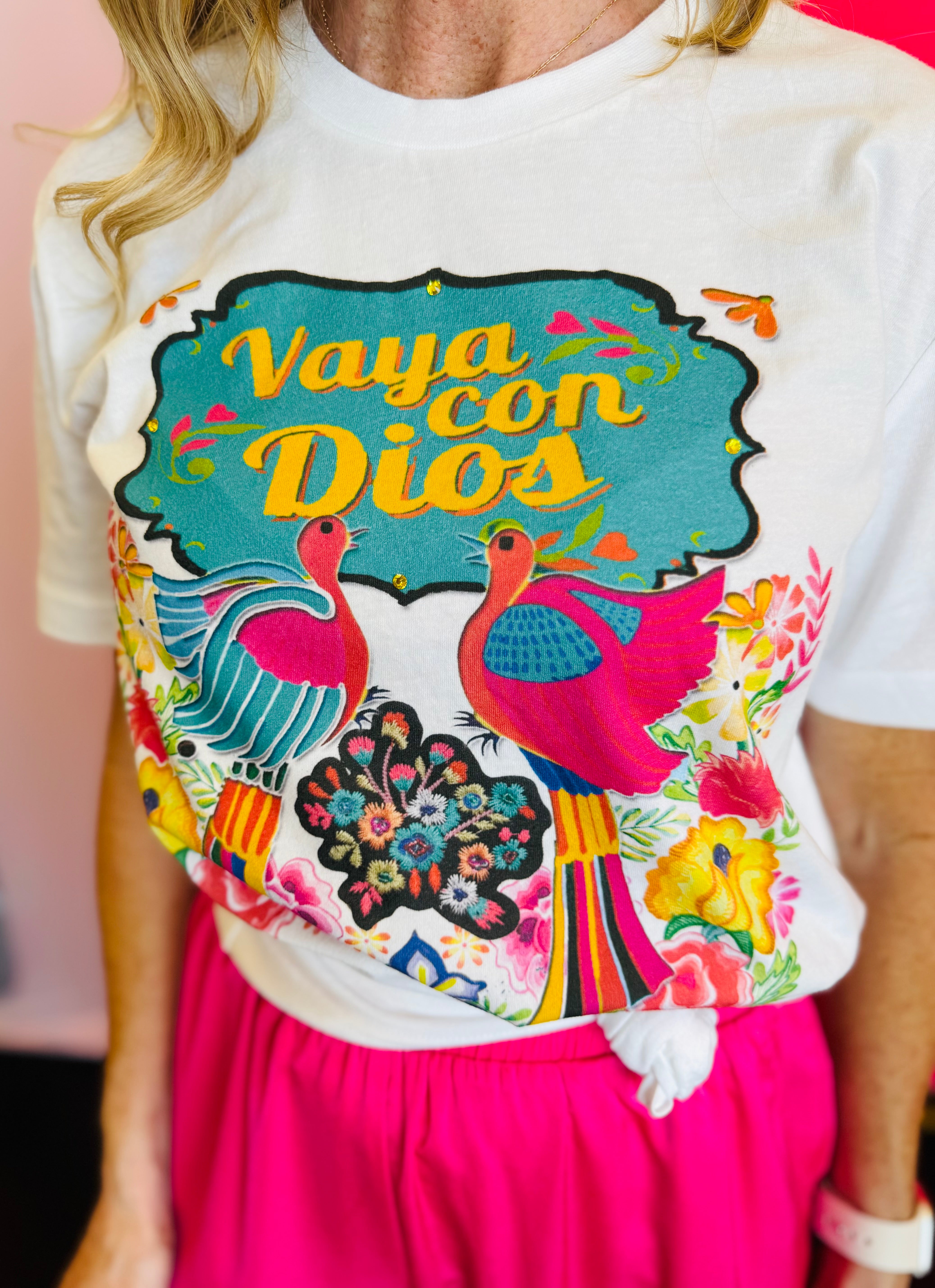 Brighten your day with the Vaya Con Dios Tee, featuring a playful burst of colorful flowers that bring joy wherever you go. This lively design adds a fun, rhinestone blingy cheerful vibe to your wardrobe, perfect for spreading good vibes and positive energy. This white tee has a special translated meaning, “Go With God.”