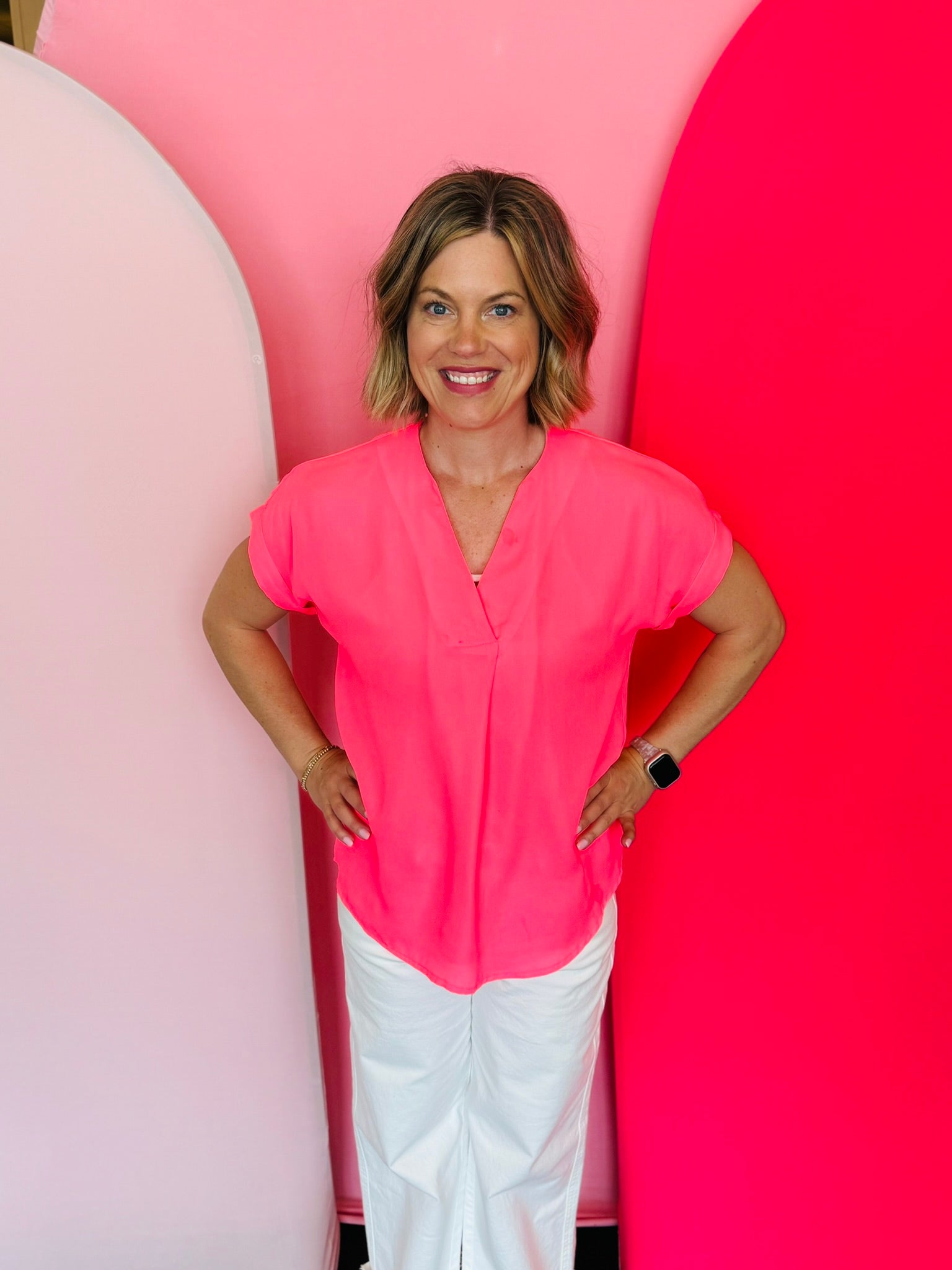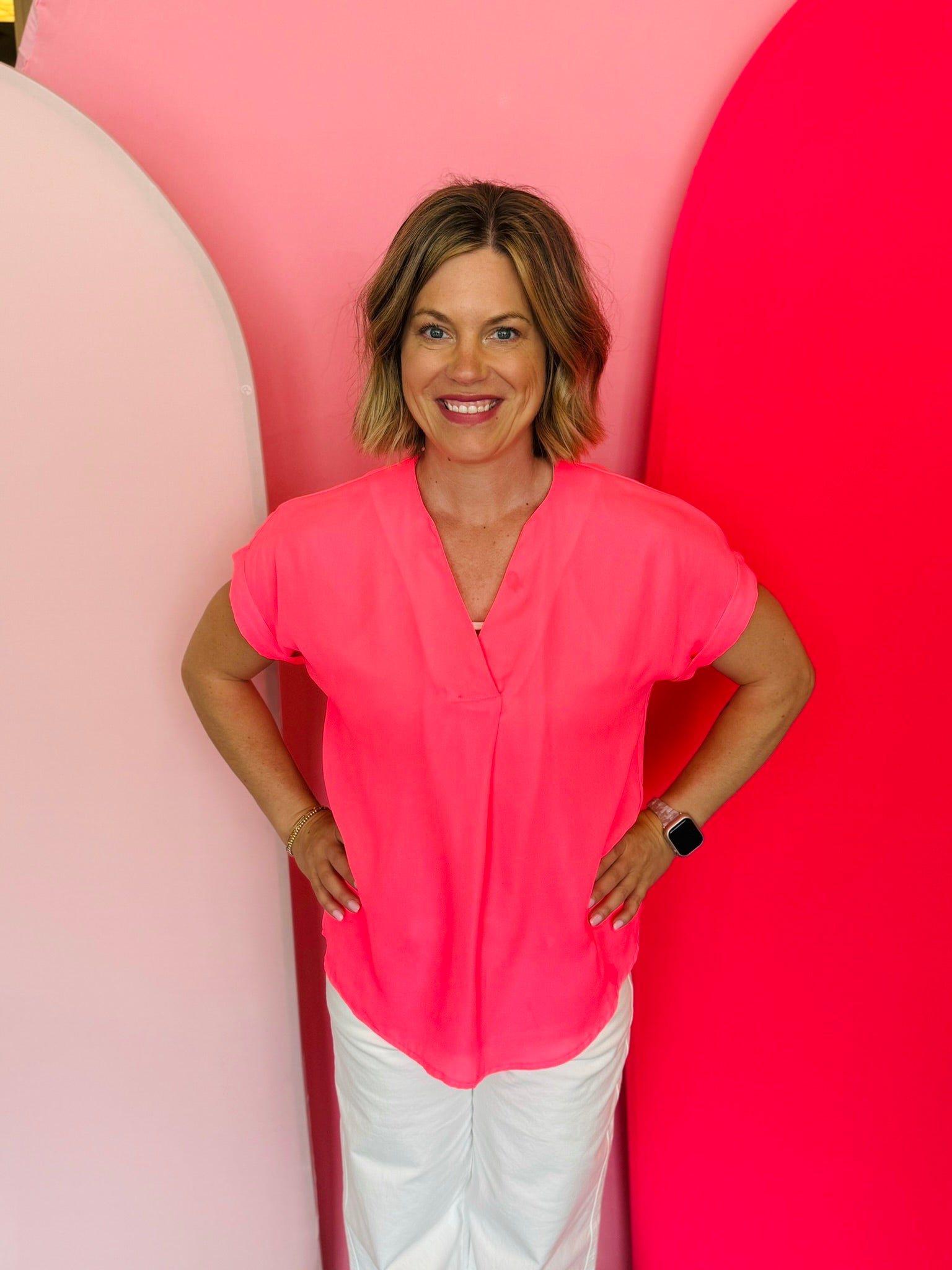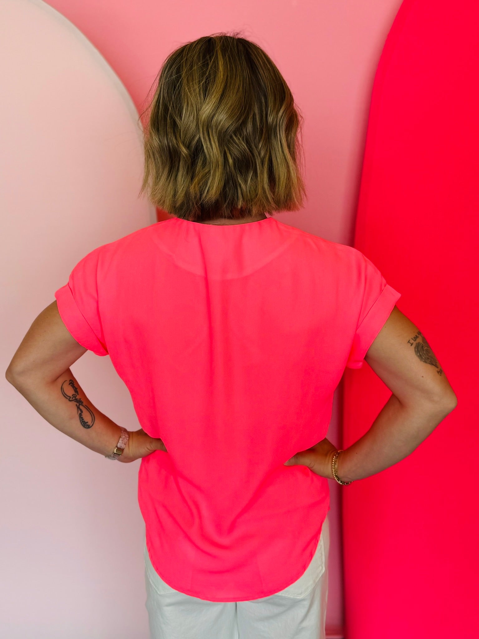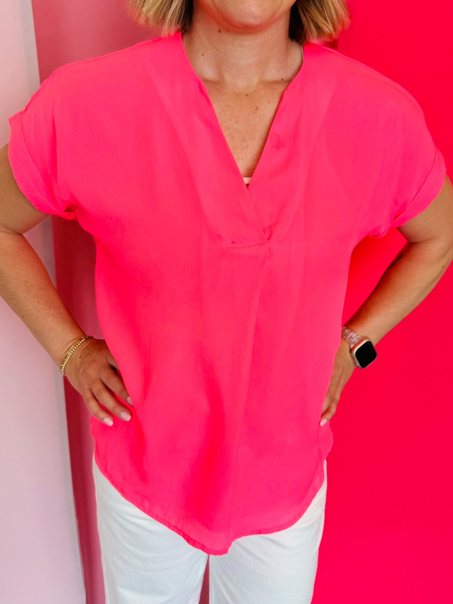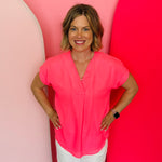 Introducing the Whitney Neon Pink Woven Blouse - the perfect blend of timeless style and luxurious comfort. Crafted from a lightweight, soft woven fabric, this blouse features a modern v-neckline and cuffed short sleeves for an effortlessly chic look. Elevate your wardrobe with this wardrobe essential today! Pair with our Under The Sun Skort for an on point outfit!