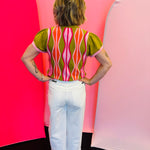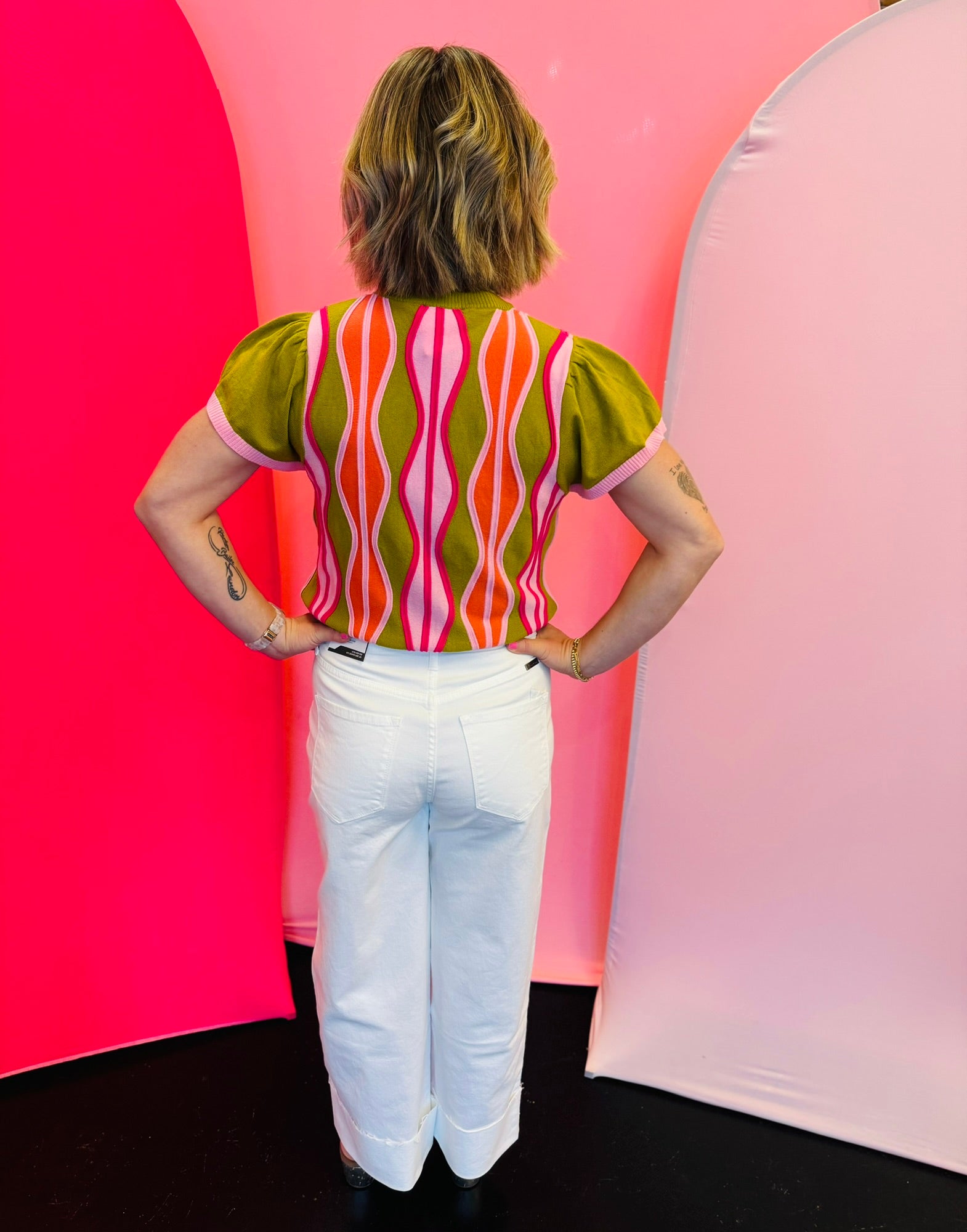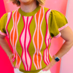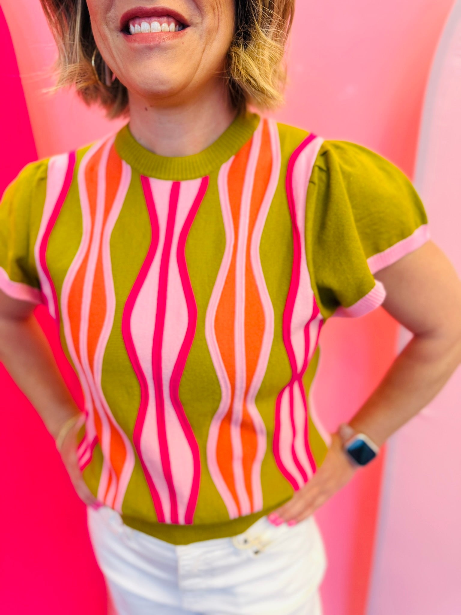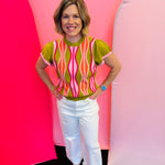 Introducing our Chartreuse Waves Knit Top, from one of our favorite brands. This light weight sweater boasts a vibrant pink, orange, and fuchsia wavy design, adding a touch of luxury to your wardrobe. The banded hemline adds a flattering touch to this exclusive piece. Elevate your style with this tasteful and elegant top.