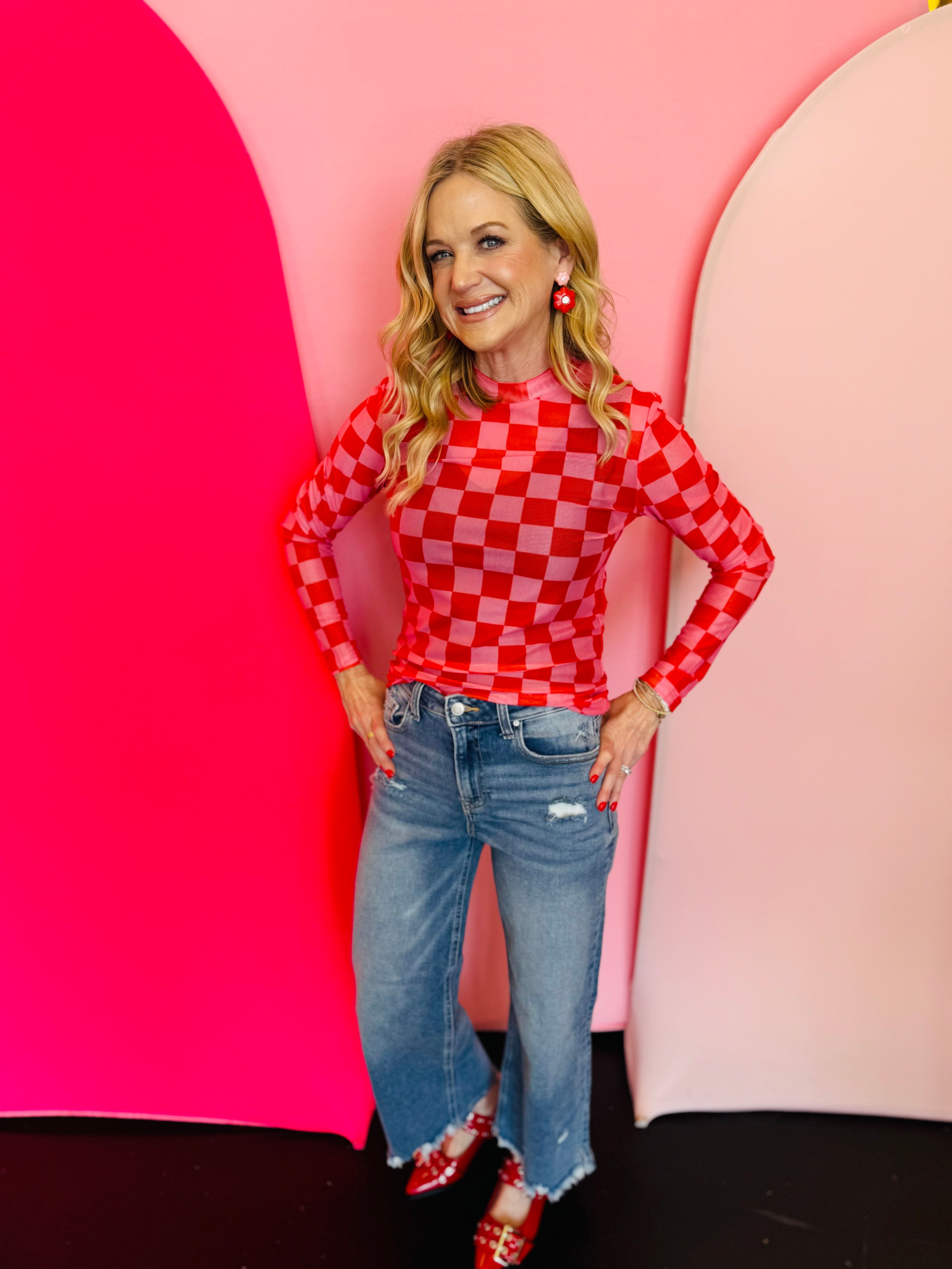 Pink & Red Check Mesh Top