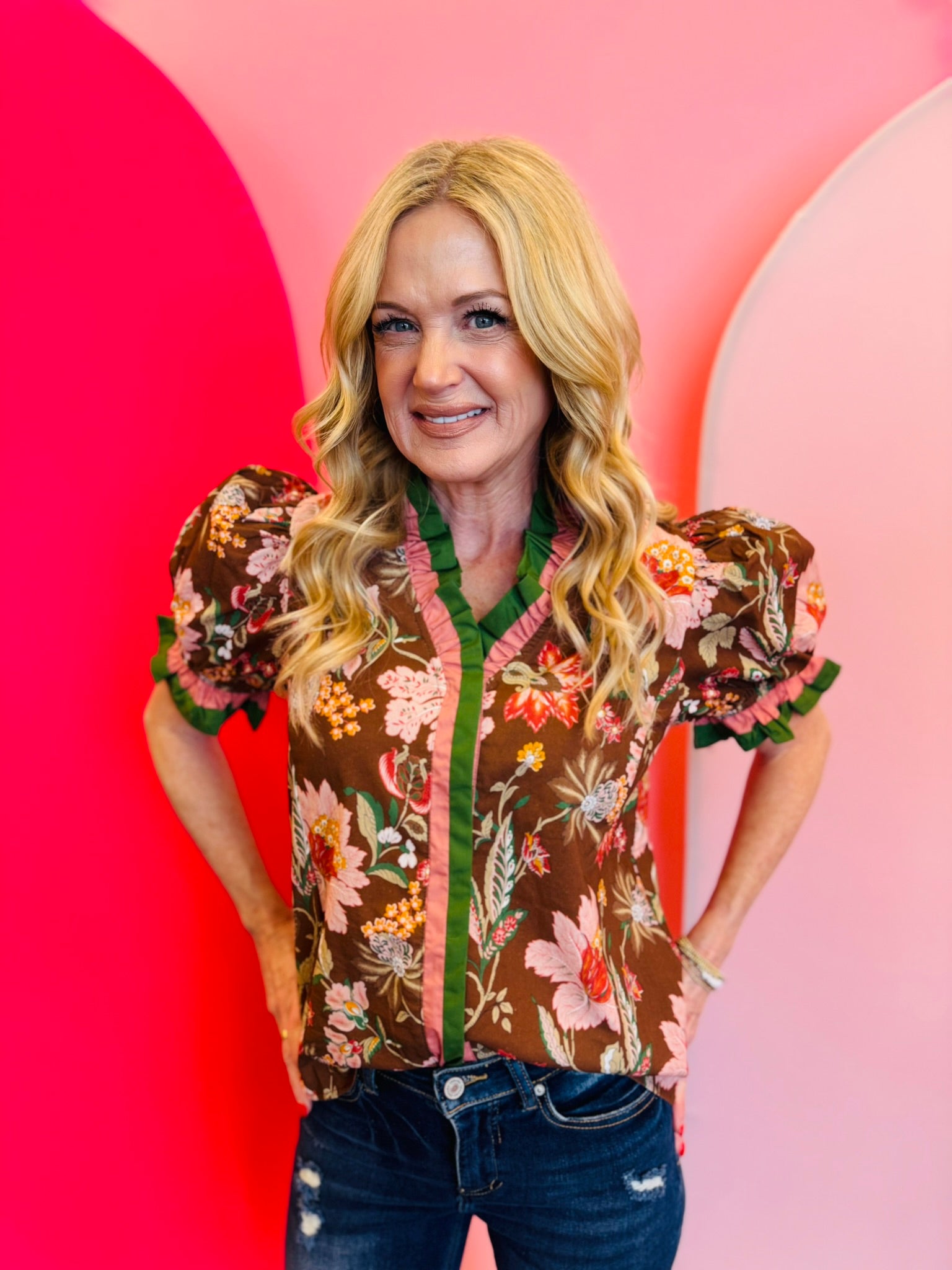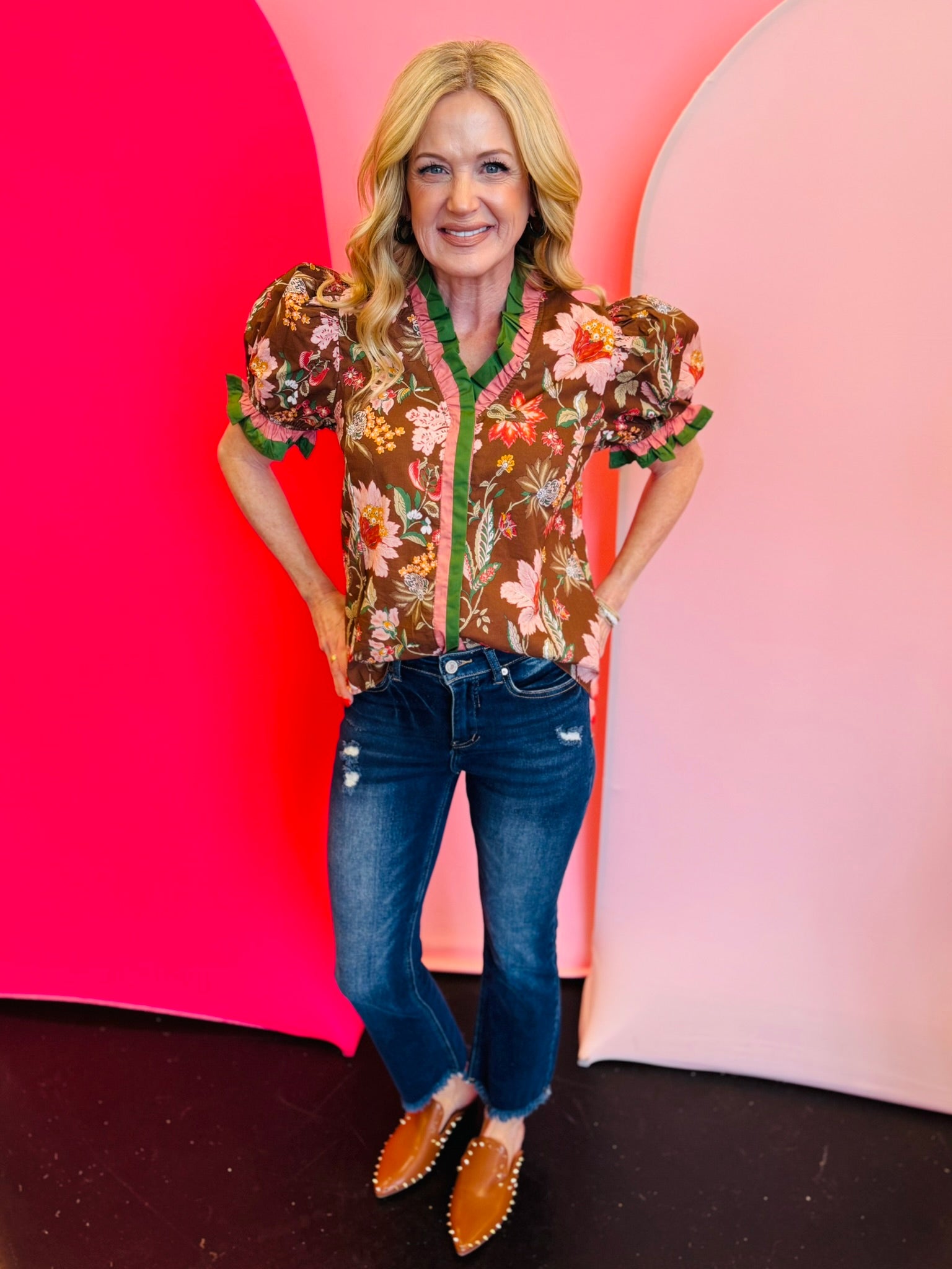 Brown Floral Print Puff Sleeve Top