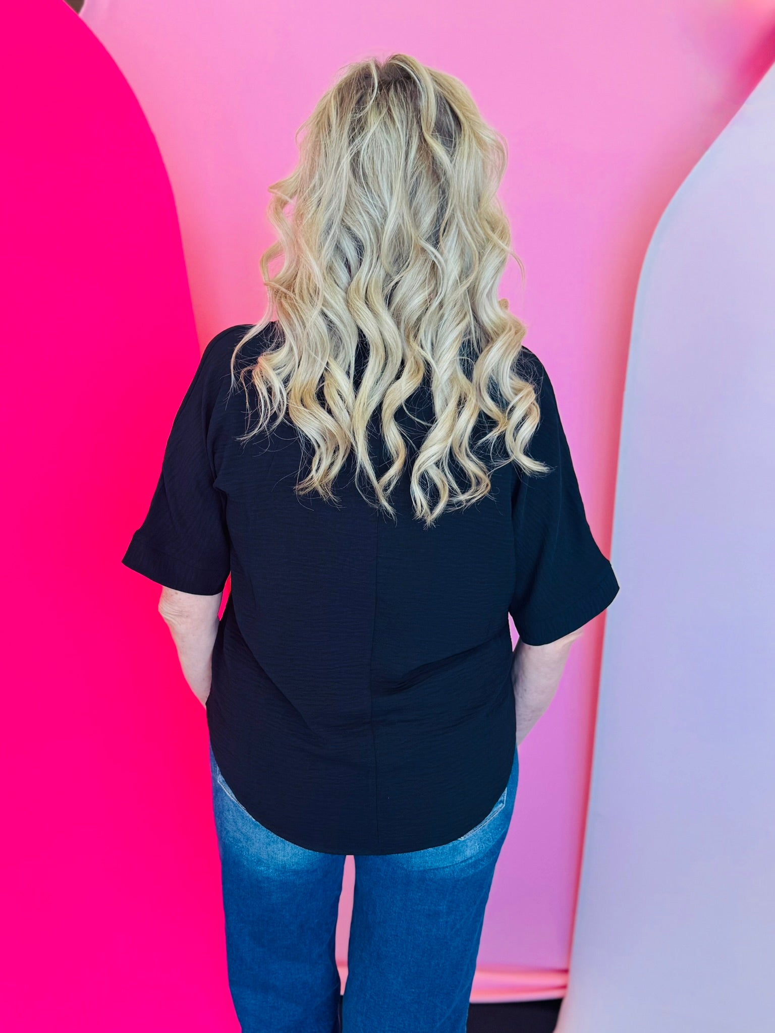 Short sleeves provide comfortable, easy movement, while the wrinkle-resistant fabric makes this top a go-to for workdays, travel, or casual outings. The classic black color adds endless versatility, allowing you to pair it with denim, tailored pants, skirts, or patterned pieces for chic, put-together style. Whether you’re dressing up or keeping it simple, this top offers understated elegance with maximum wearability.