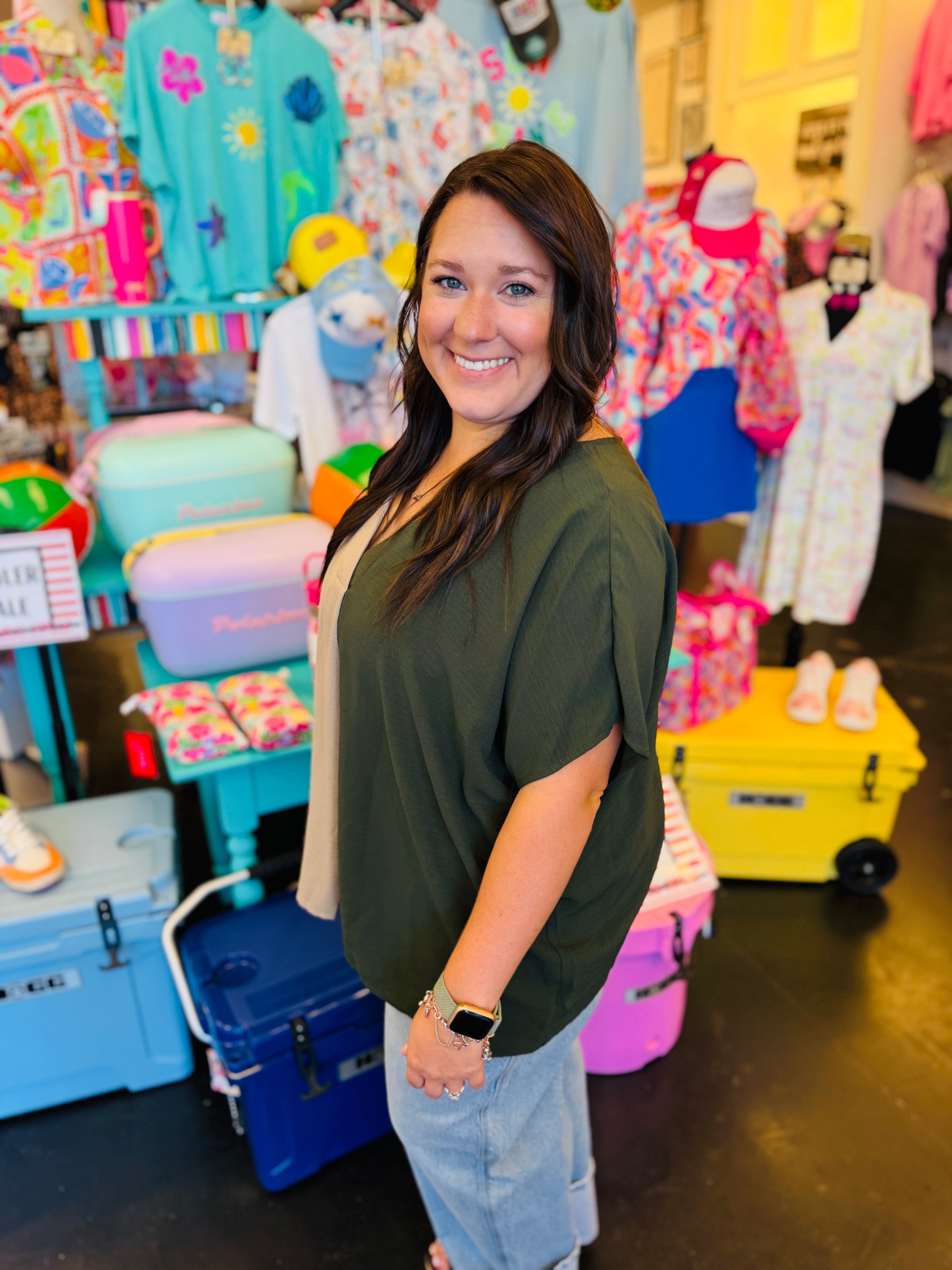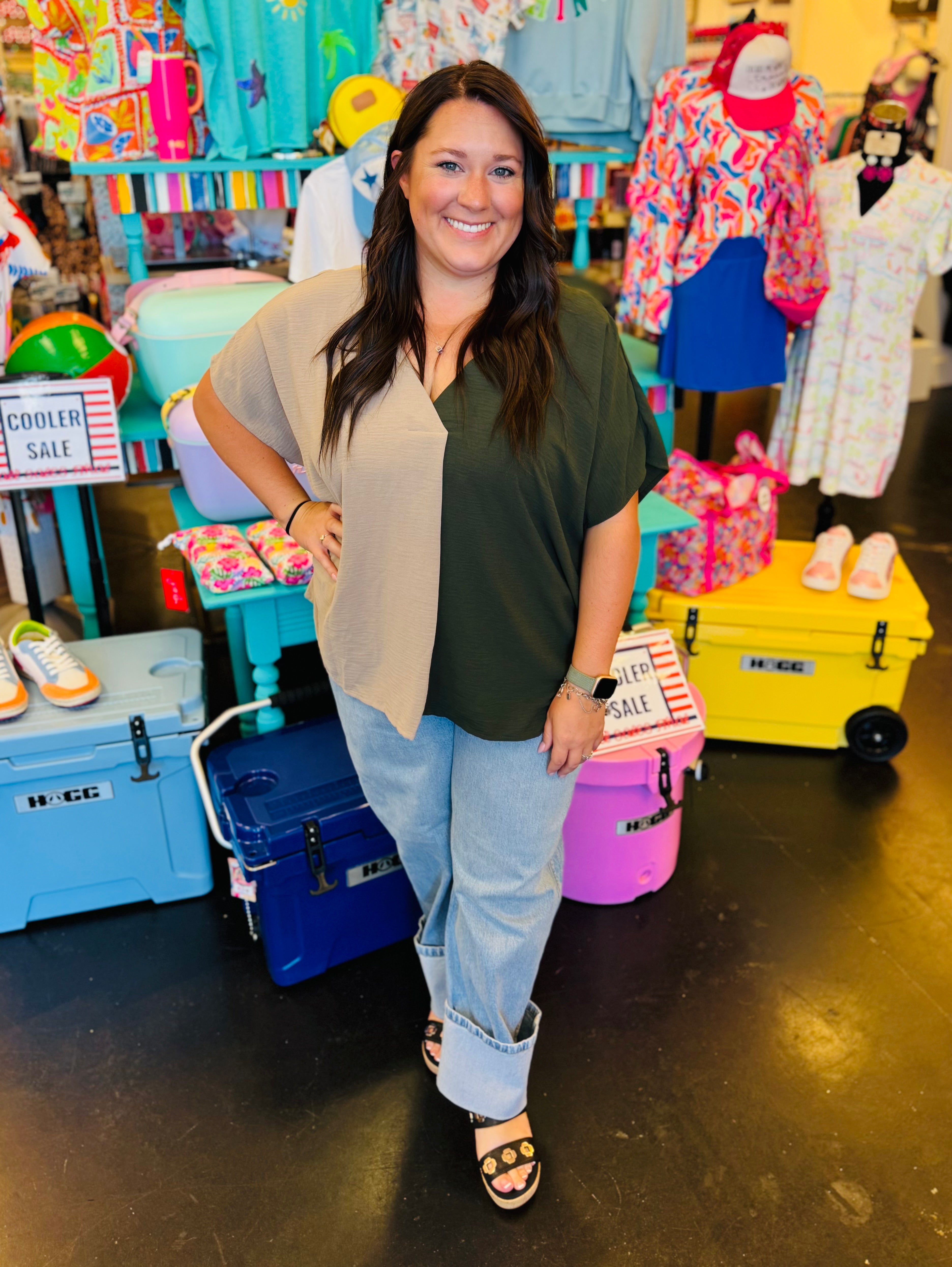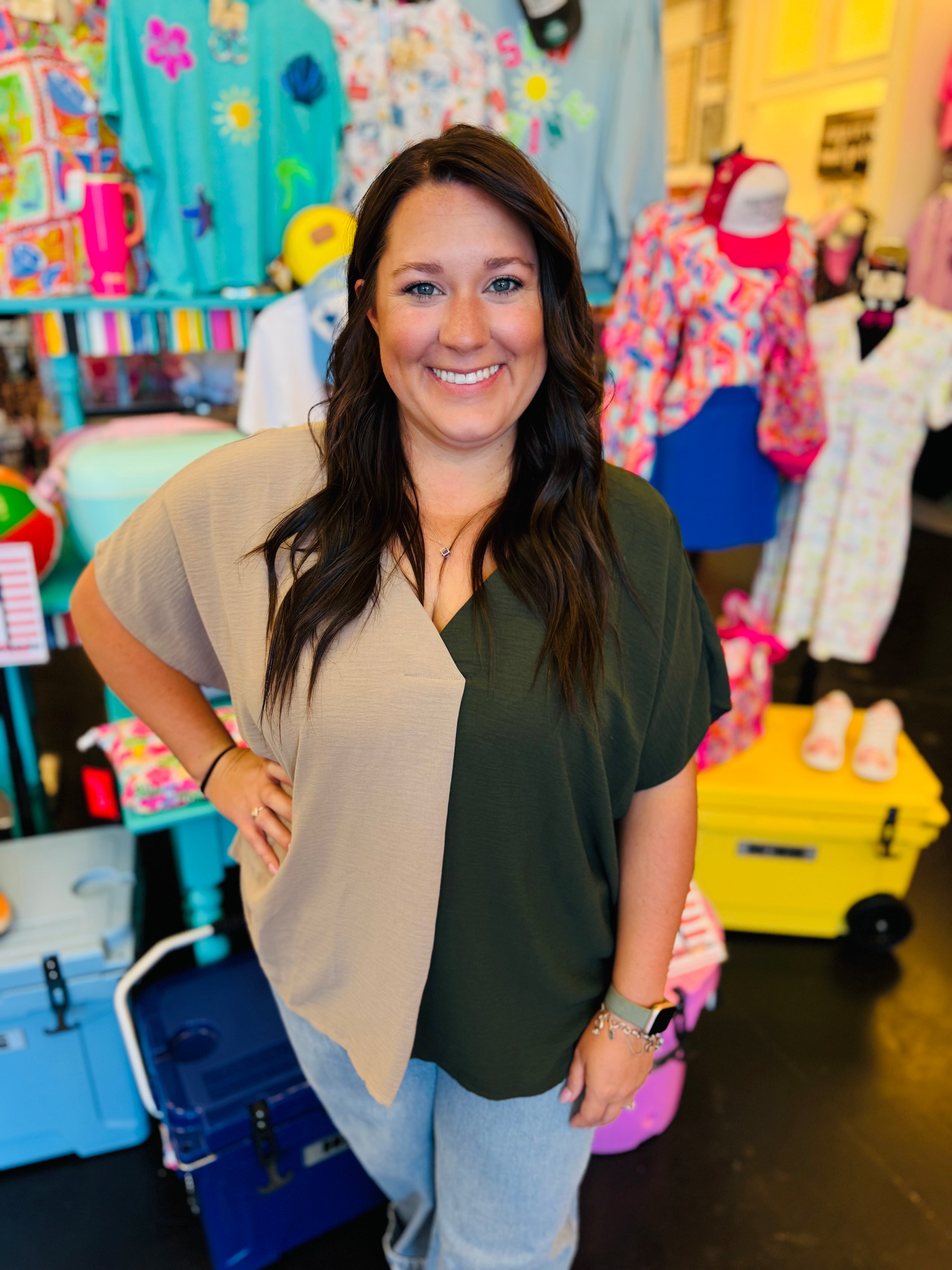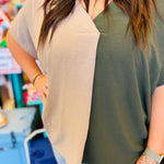 Add an earthy twist to your everyday style with the Coco/Olive Colorblock V-Neck Top! Featuring a chic combination of warm cocoa and rich olive tones, this short-sleeve top offers the perfect blend of casual comfort and eye-catching detail. The classic V-neckline flatters every silhouette, while the lightweight, breathable fabric ensures all-day comfort.