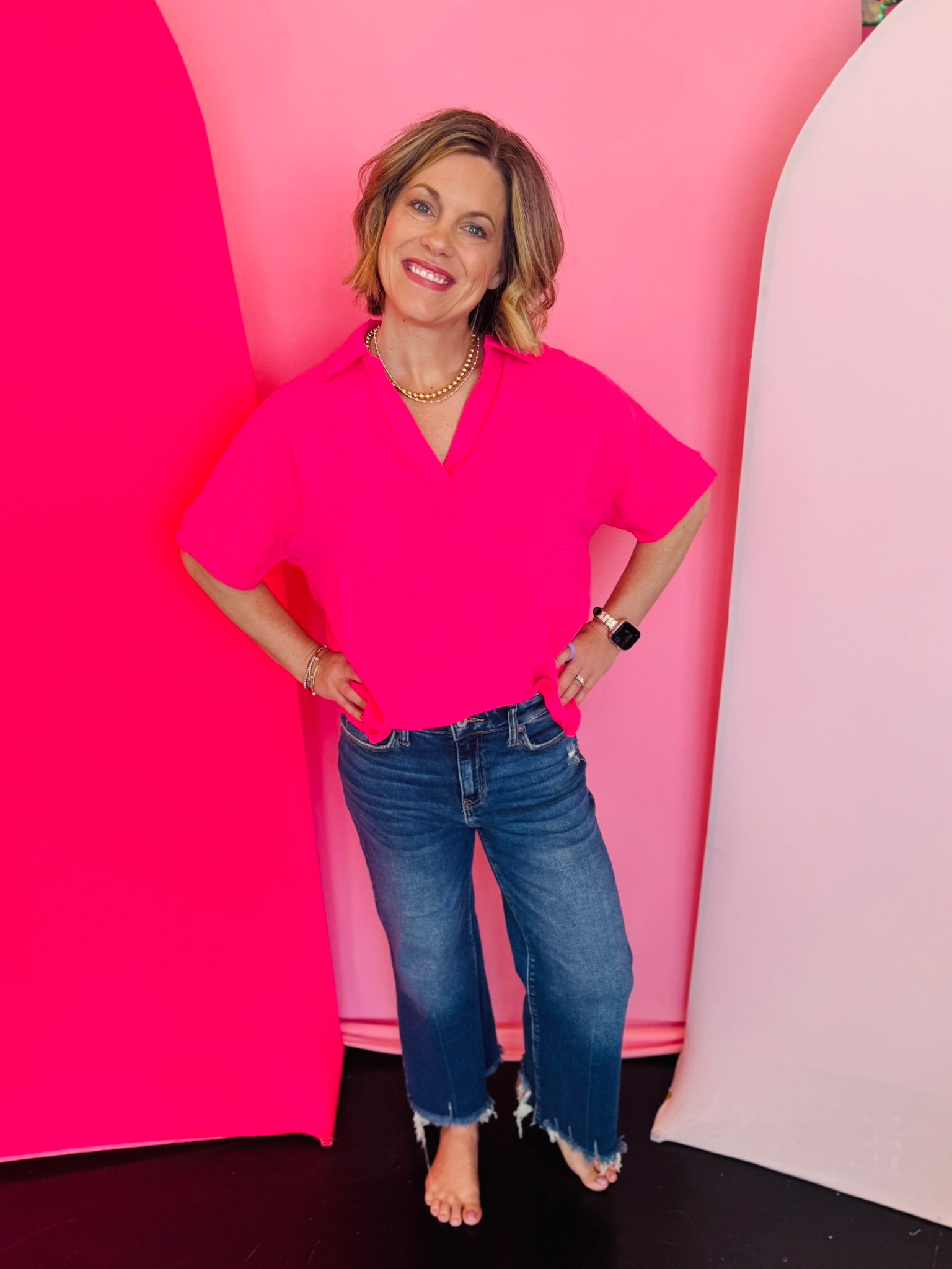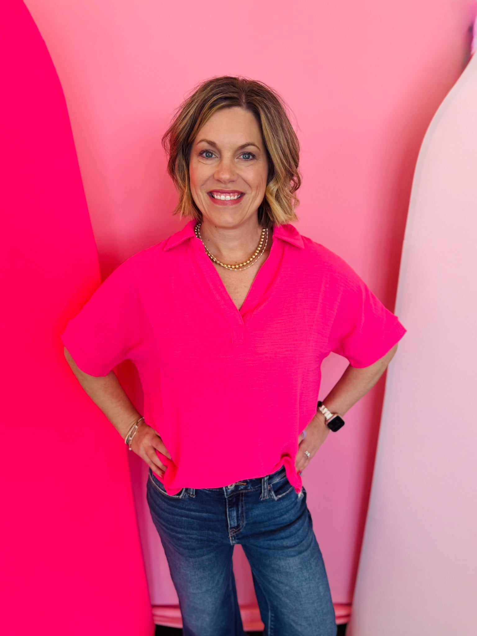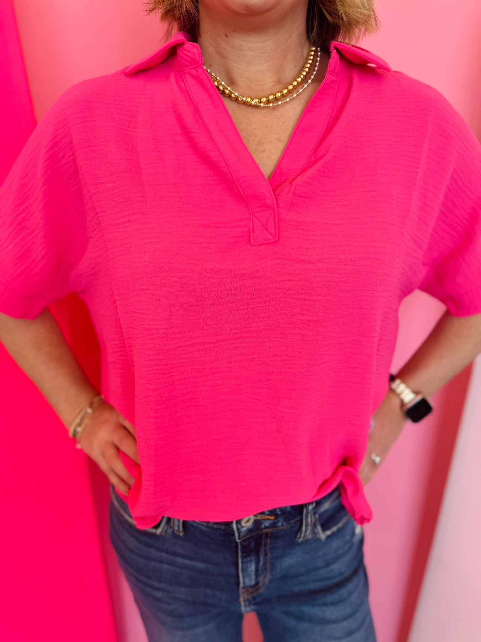 Brighten your wardrobe with the bold and cheerful Fuchsia Collared Top, a vibrant essential designed for effortless everyday style. Made from lightweight woven airflow fabric, this top offers a smooth, breathable drape that keeps you cool and comfortable from morning to night. The soft collared neckline flows into a relaxed split V-front, creating a flattering silhouette that strikes the perfect balance between polished and easygoing.