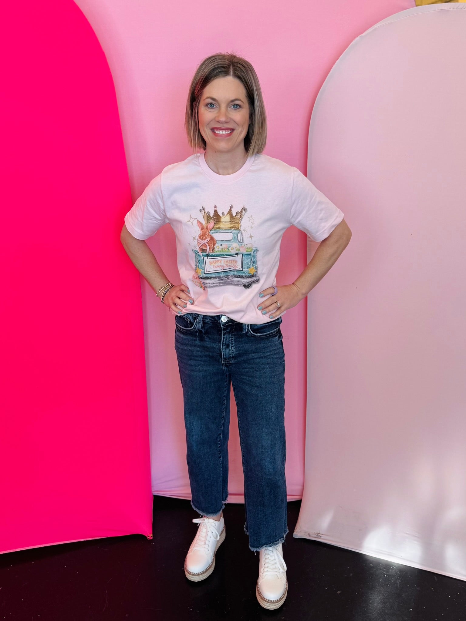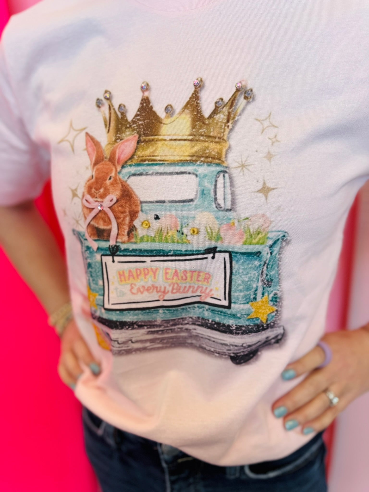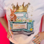 Easter graphic tee with turquoise vintage truck, florals, eggs, and crowned bunny with bling accents