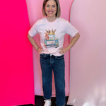 Designed on a comfortable tee, this shirt features a vintage turquoise pickup truck filled with bright spring florals and colorful Easter eggs. A sweet bunny wearing a crown adds a playful, whimsical touch, while subtle bling accents give the design a little sparkle that makes it stand out.