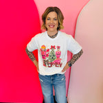 White tee with bright pink nutcrackers and Christmas tree graphic