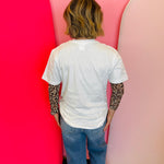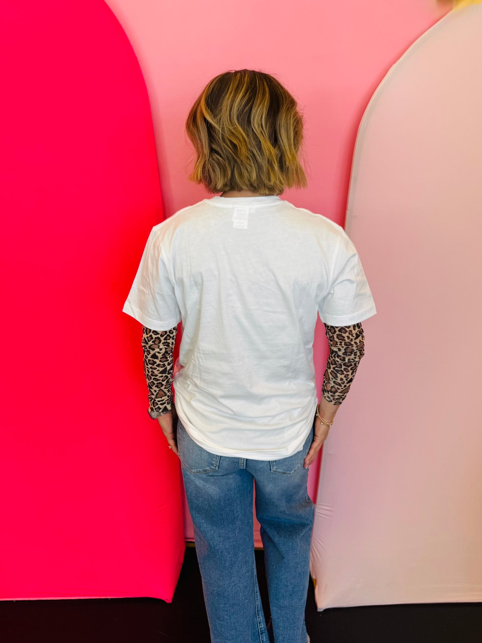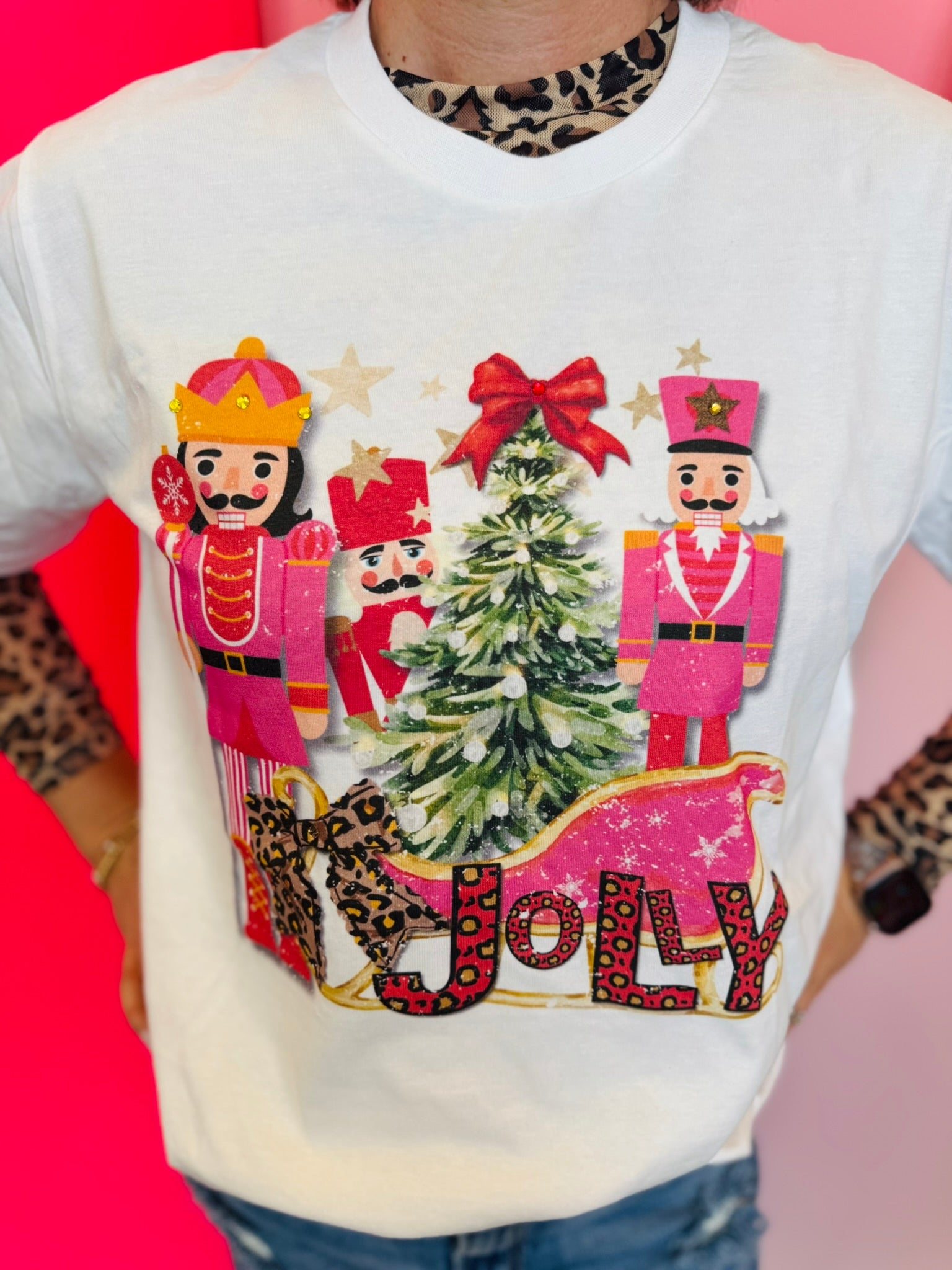 Add sparkle and festive flair to your wardrobe with the Holly Jolly Nutcrackers Bling Tee. Made from 100% soft cotton, this holiday-ready white tee features a bright and cheerful design showcasing pink nutcrackers and a charming Christmas tree topped with a bold red bow. The playful “Jolly” graphic shines in vibrant red leopard print lettering, perfectly accented with a leopard bow for extra holiday glam. Comfortable and eye-catching, this tee pairs effortlessly with jeans, joggers, or a fun sequin skirt for a merry and stylish look that’s sure to spread cheer all season long.
