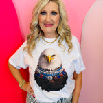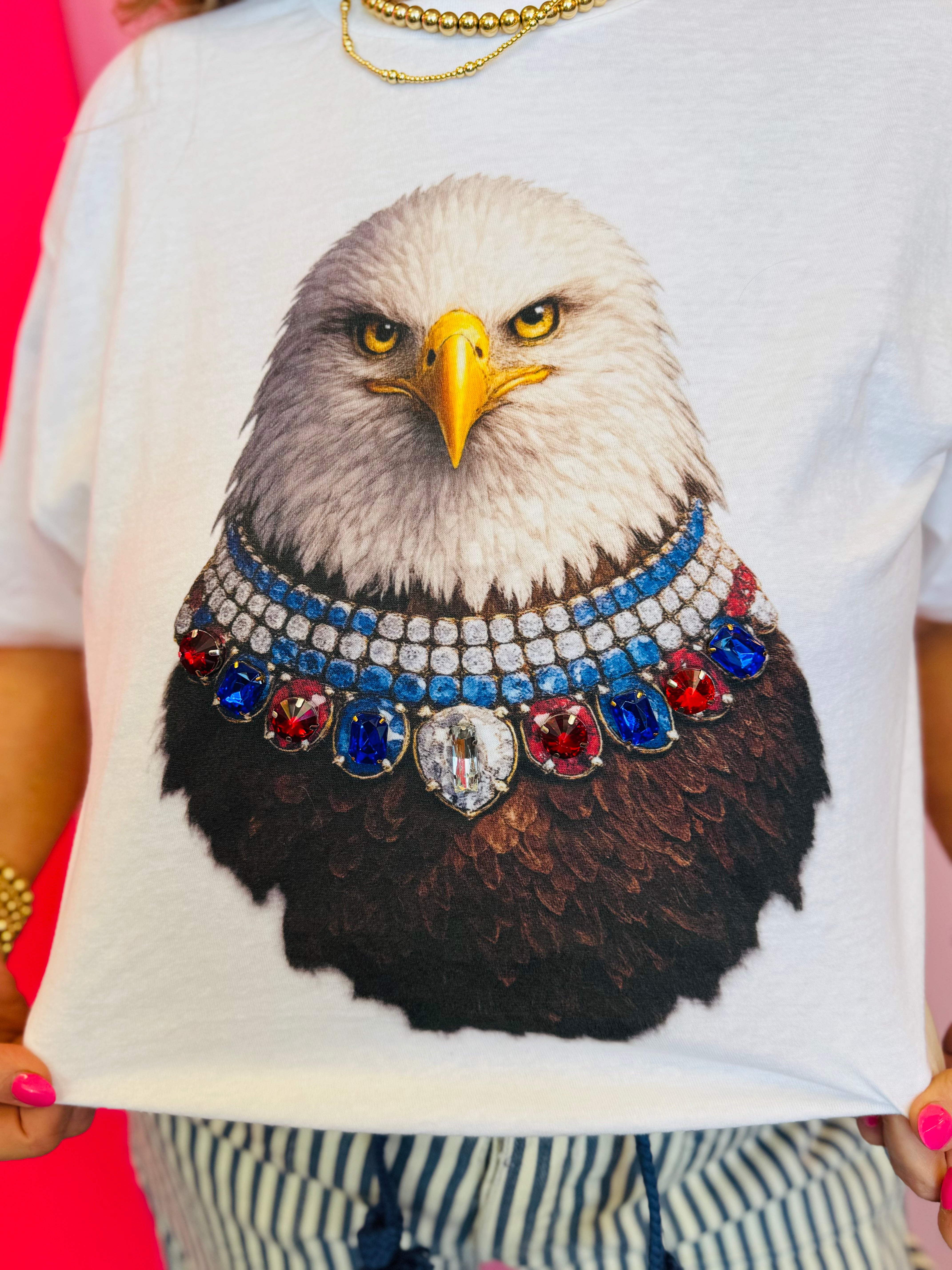 Featuring a majestic eagle design adorned with vibrant jewel-inspired accents, this tee brings a unique, elevated twist to classic Americana style. Set against a crisp white backdrop, the colorful detailing adds brightness and personality while maintaining a strong, striking look.