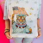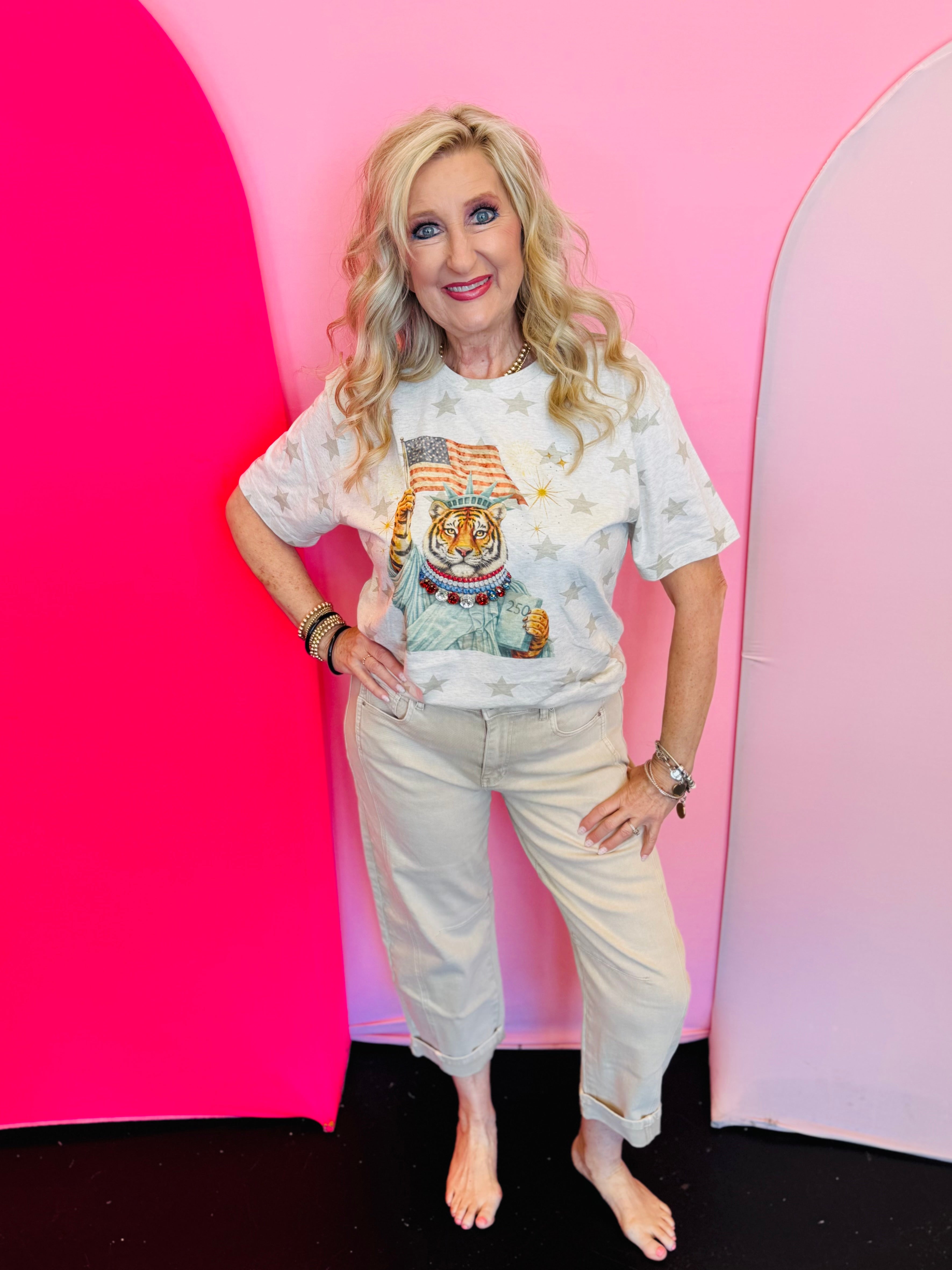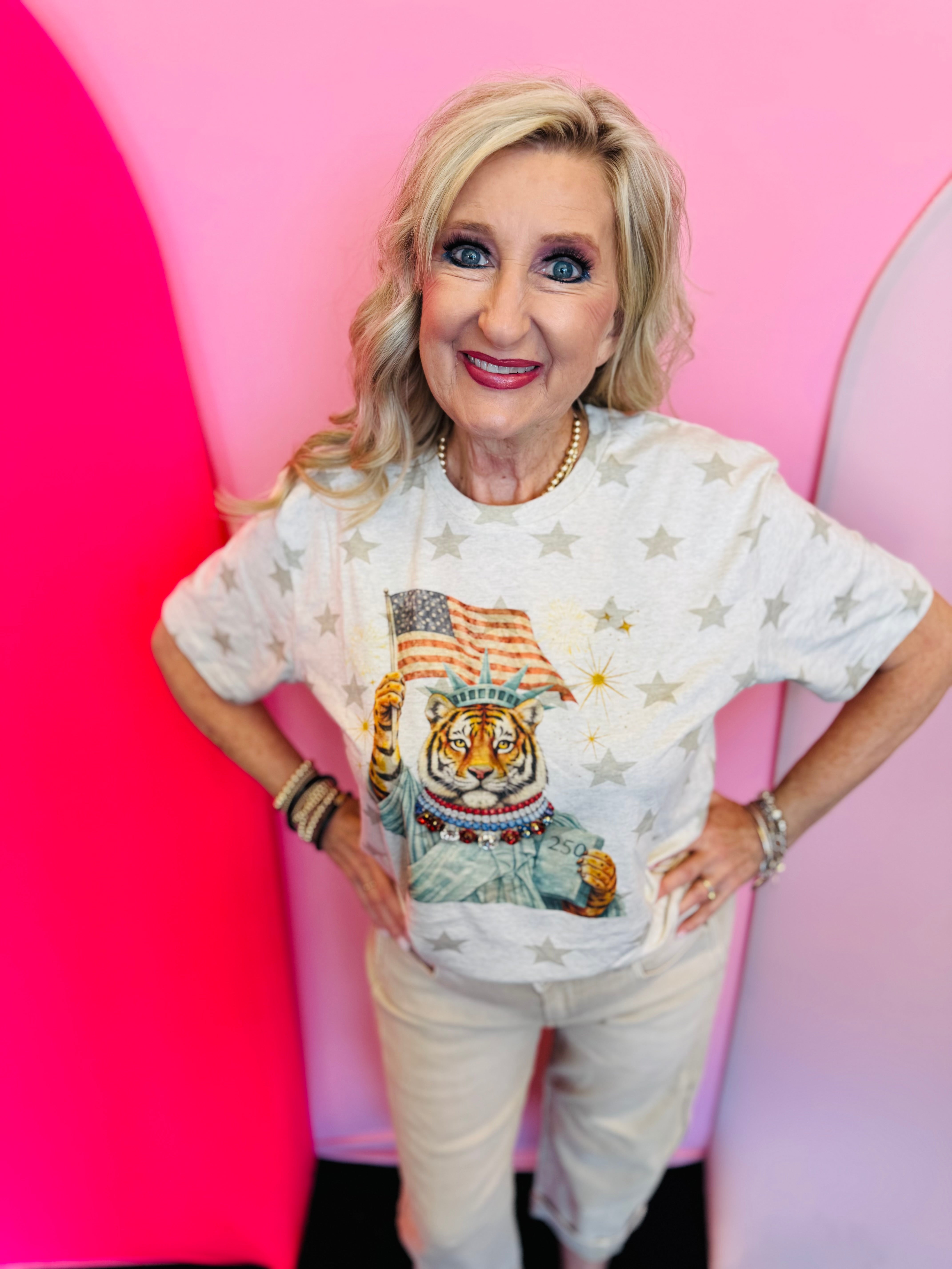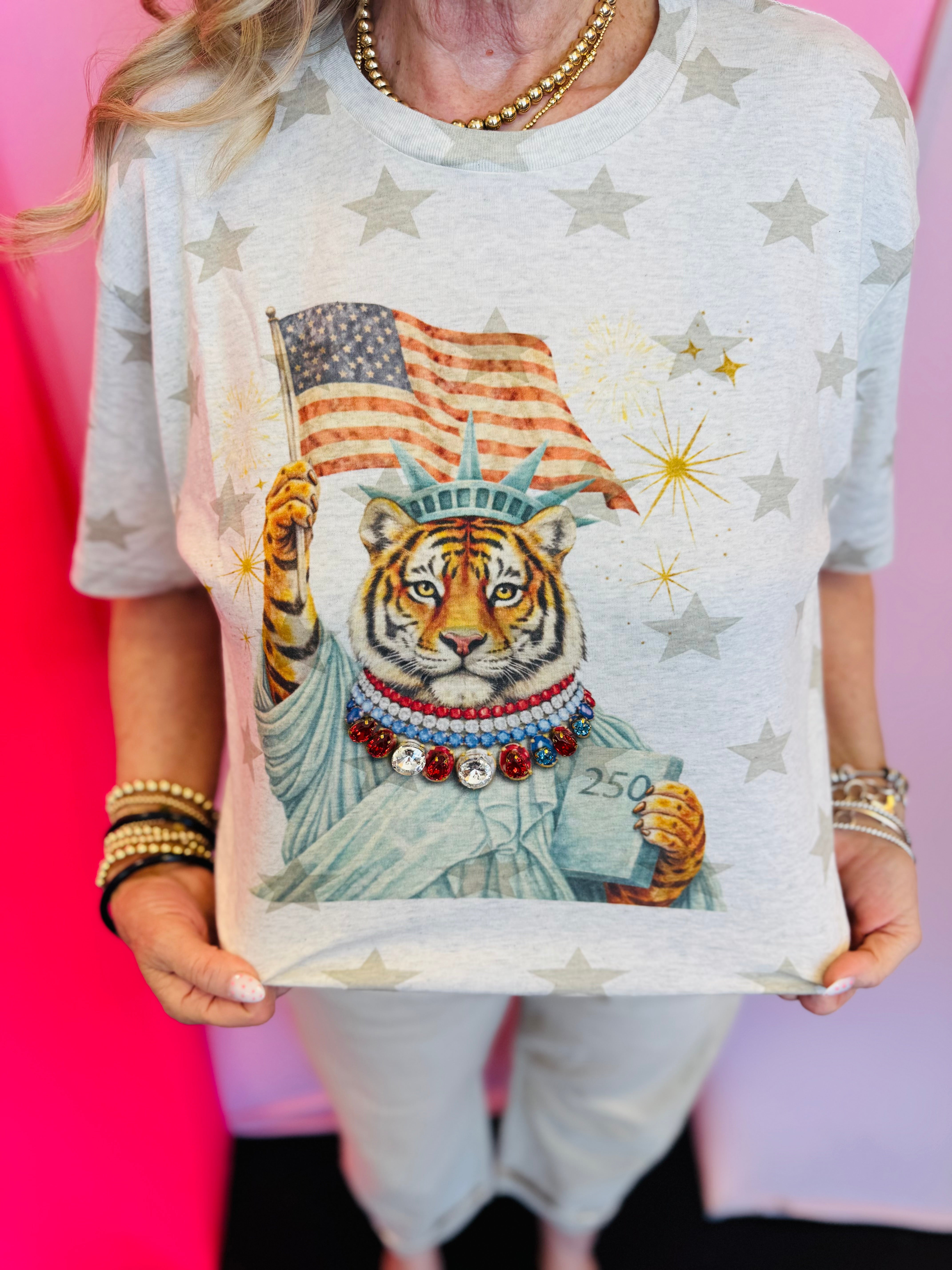 Celebrate bold style and American pride with our Jewel Collared Patriotic Tiger Tee, a standout piece from our signature Jewel Collared Tee Collection. This eye-catching design features a trendy tiger styled as the Statue of Liberty, proudly waving the American flag in honor of America’s 250-year celebration. The playful yet powerful graphic blends patriotic spirit with boutique-level flair, making it a true conversation piece.