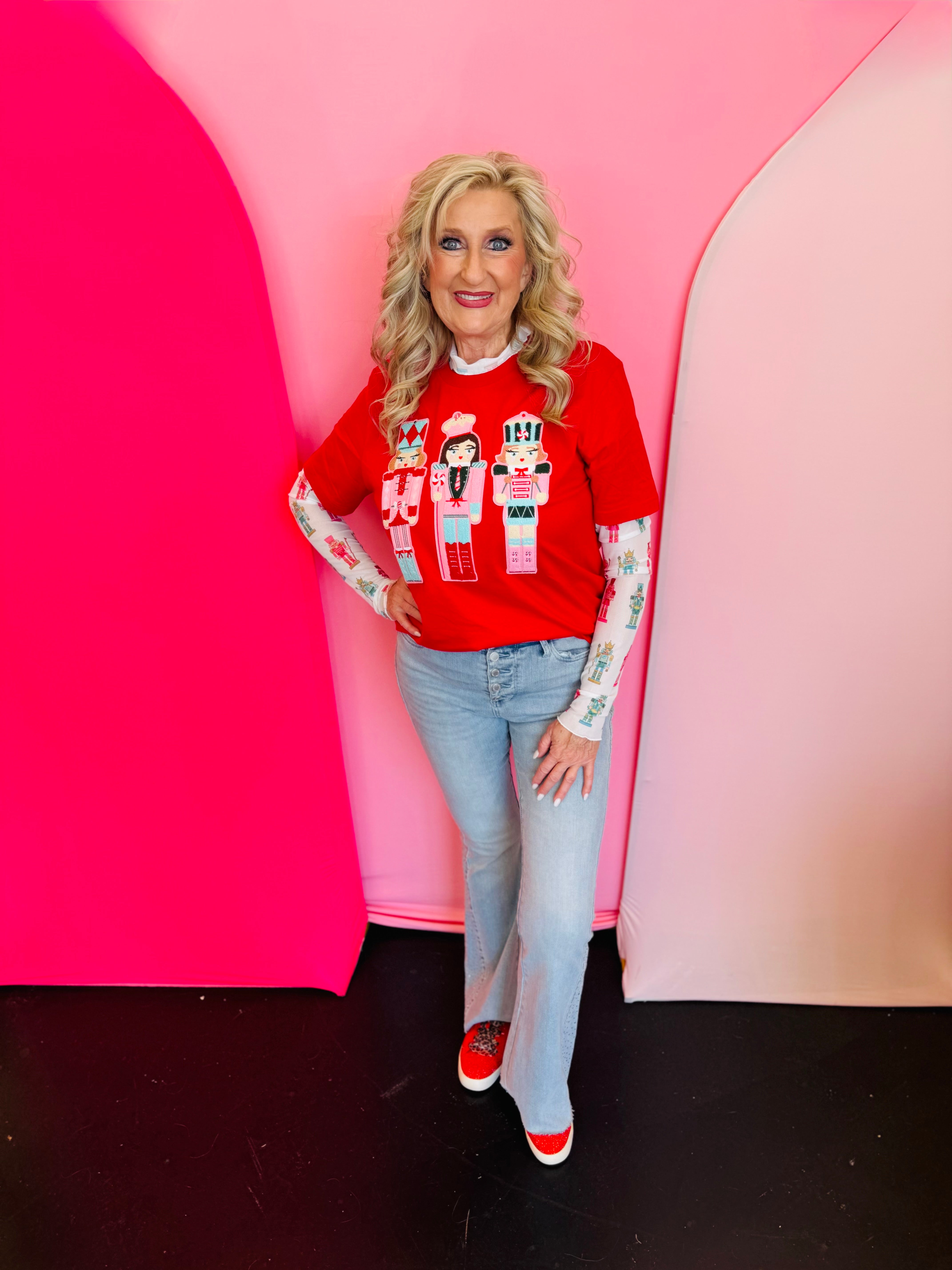 Red Christmas tee with three embroidered nutcracker girls in pink, red, mint, and white chenille patch design.