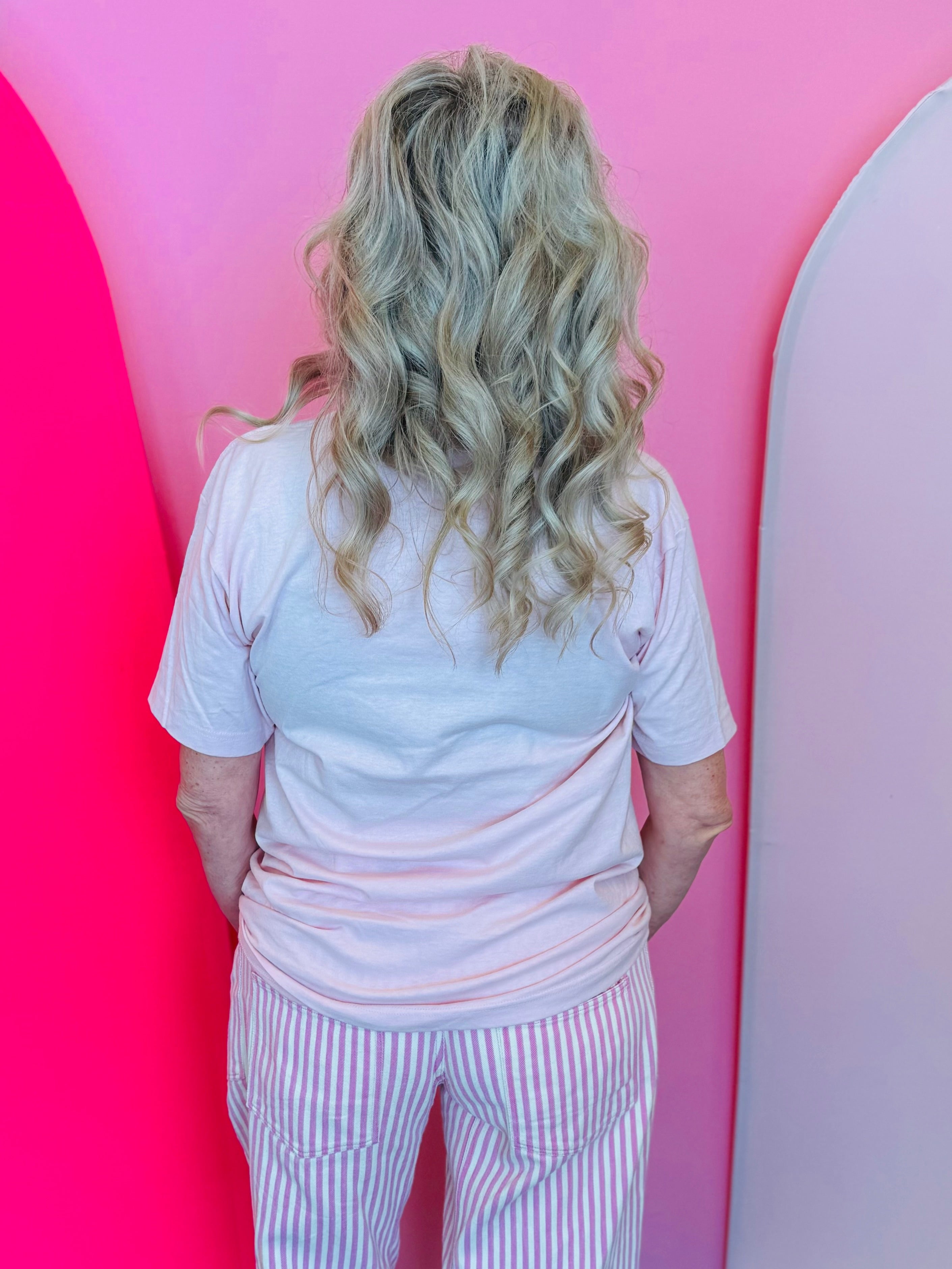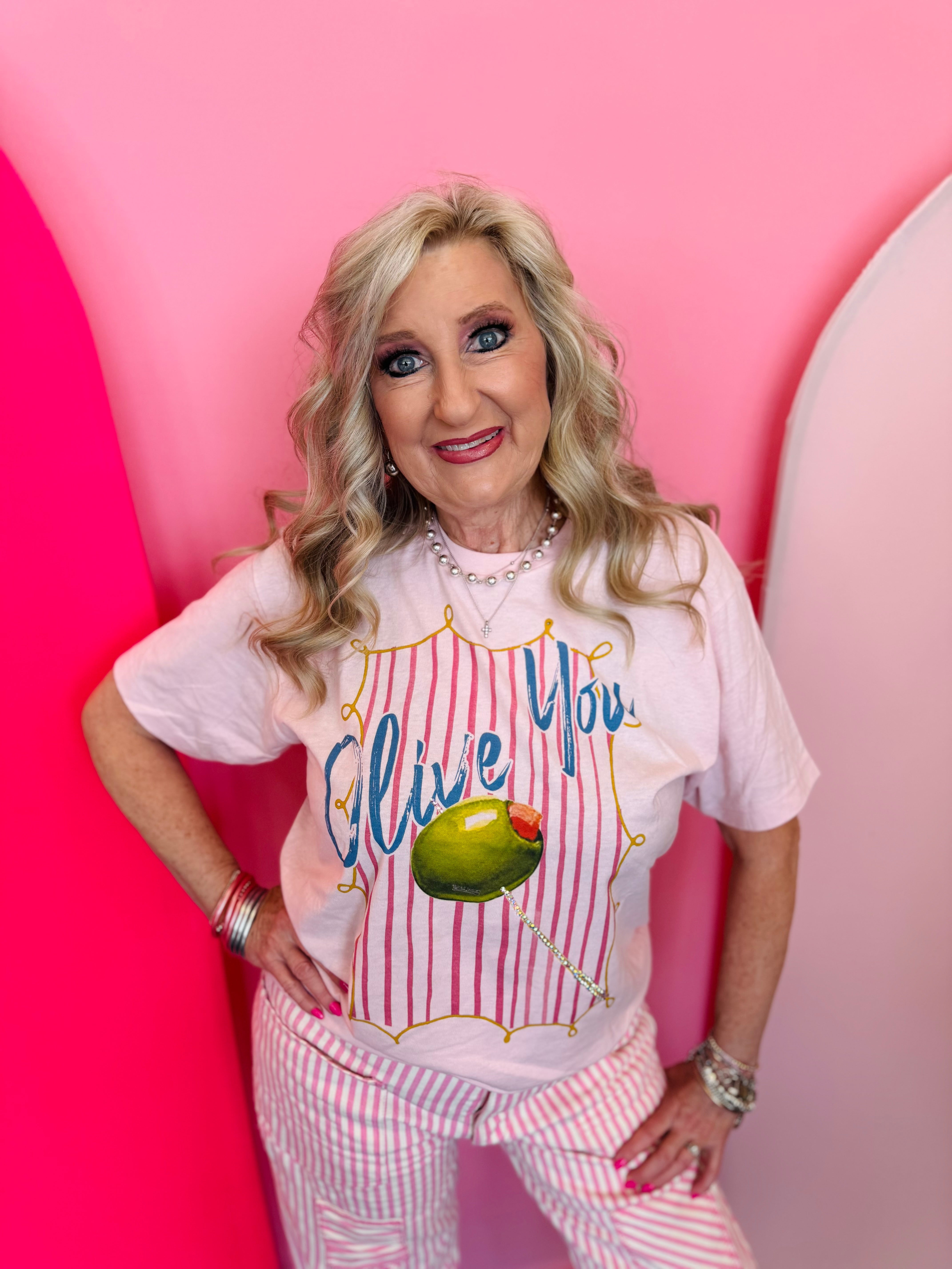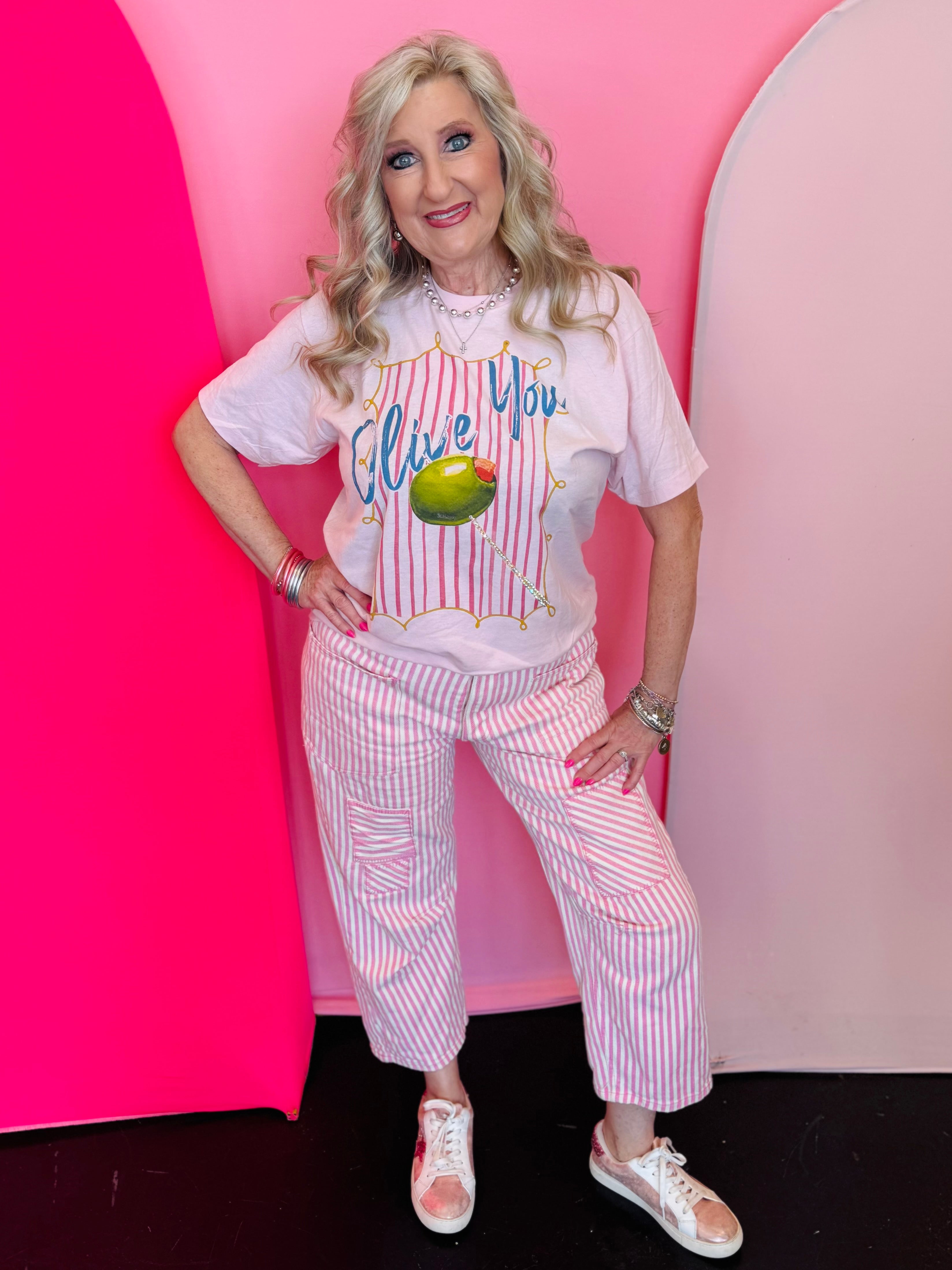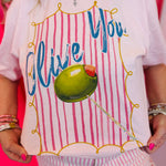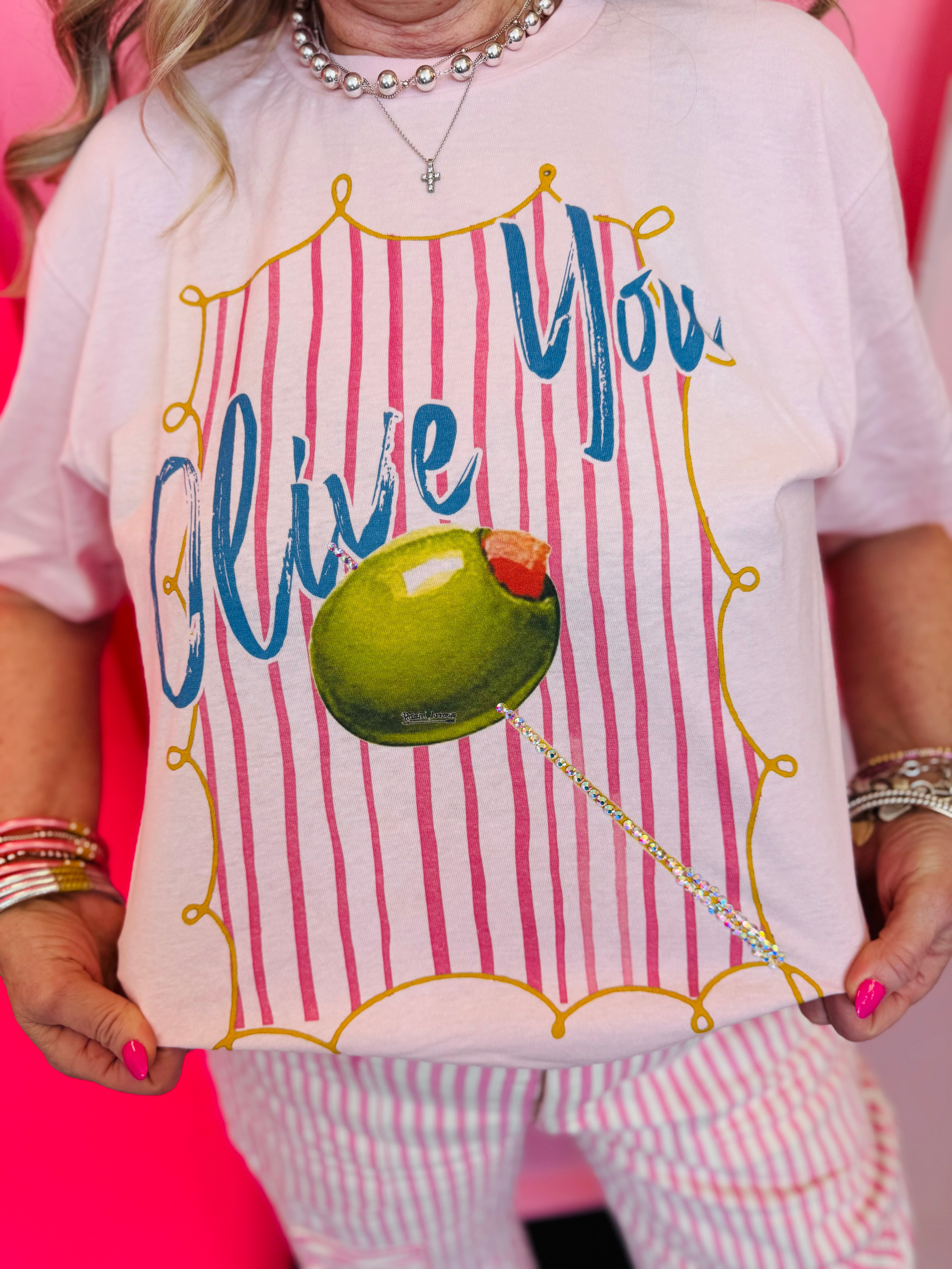 Designed with a soft pink base and vintage-style vertical stripes, this tee has a relaxed, retro feel that’s easy to wear and easy to style. The bold “Olive You” graphic across the front adds a fun, lighthearted touch, while crystal details on the olive design give it a hint of shimmer that makes it feel extra special.