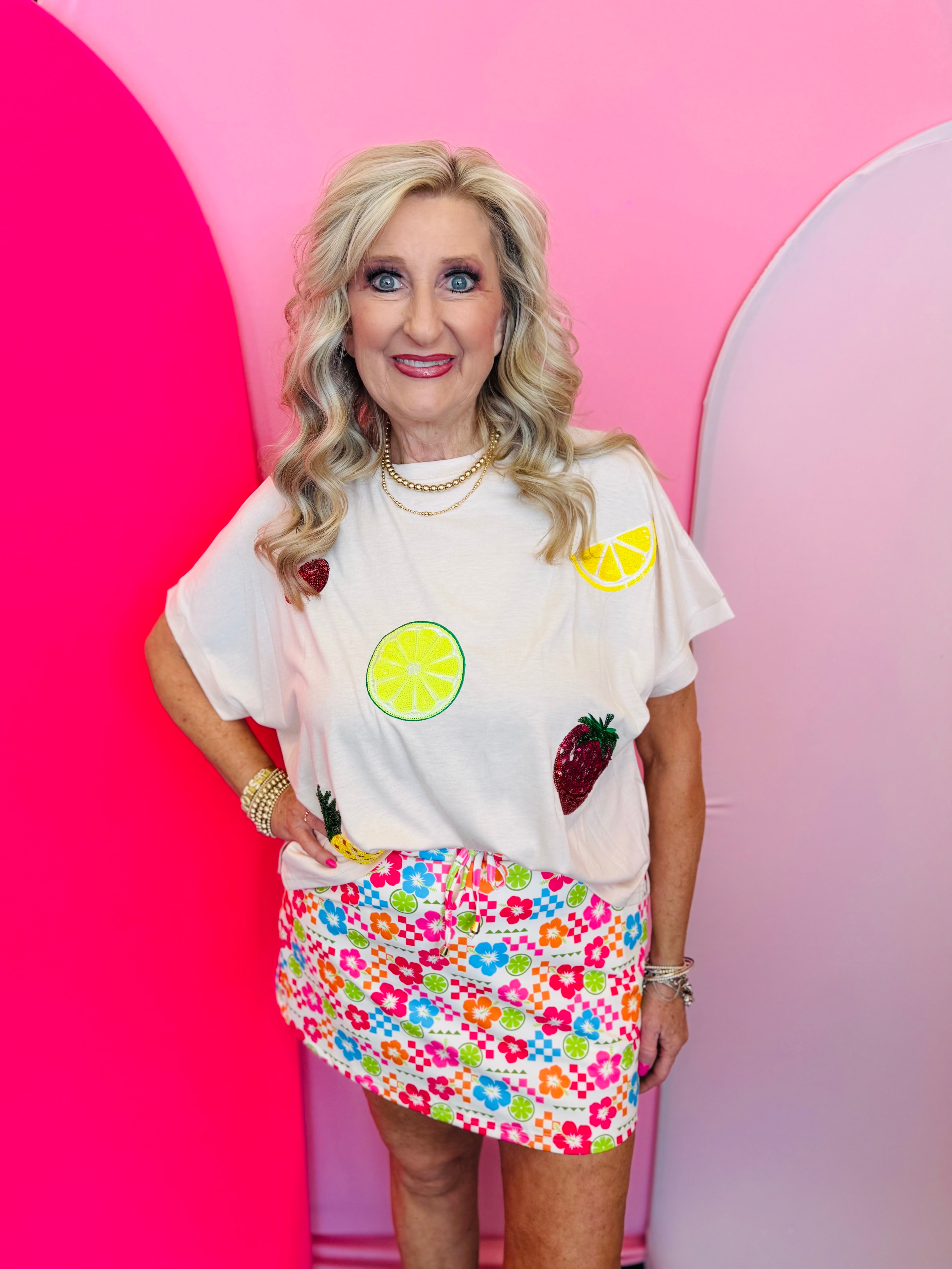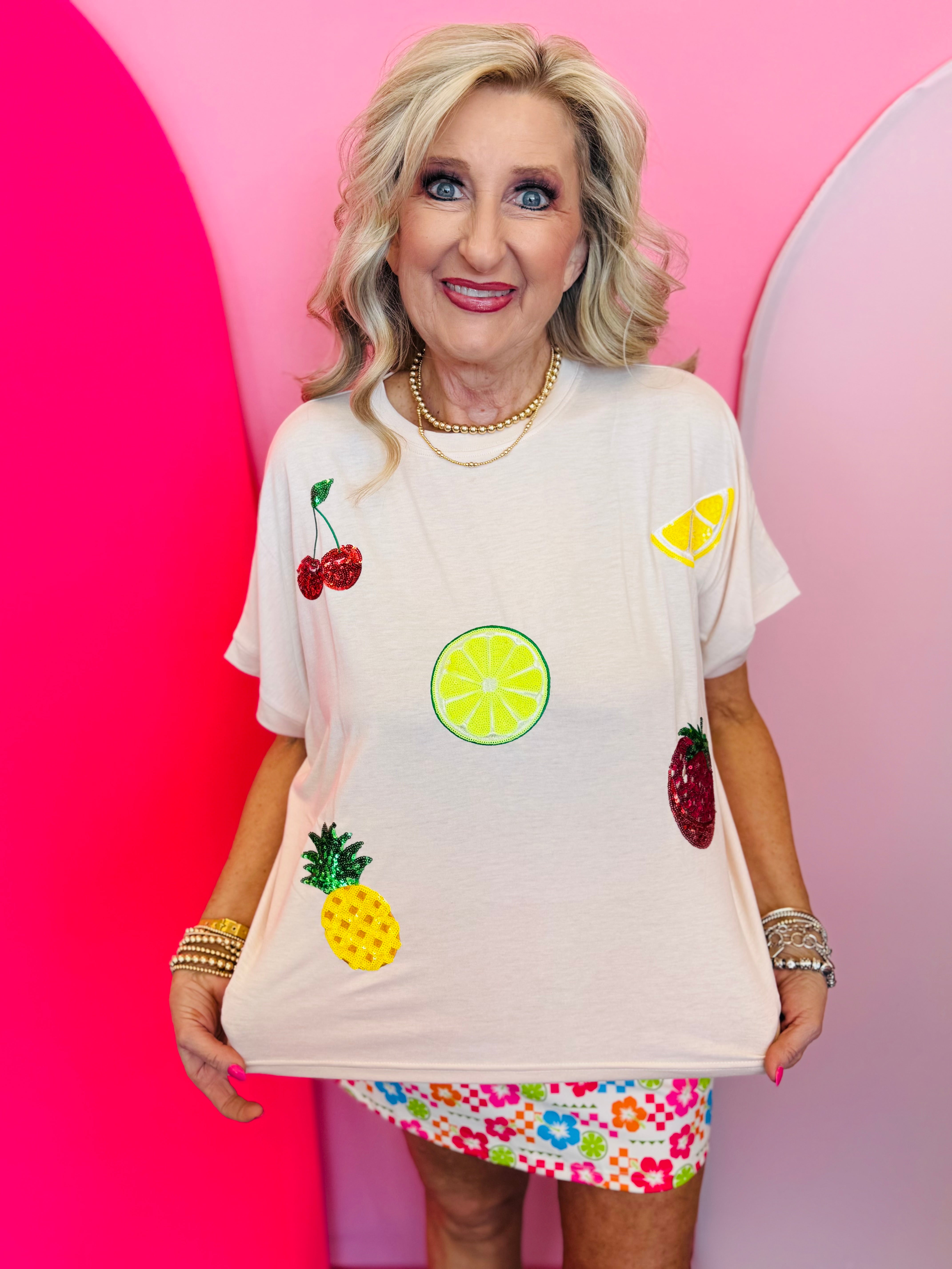 Featuring a vibrant tropical-inspired sequin fruit patch, this eye-catching top is designed for those who love fun, statement style. The shimmering detail adds texture and shine while keeping the look lighthearted and easy to wear. Perfect for sunny days, casual outings, vacations, or festive gatherings, this top instantly brightens your look.