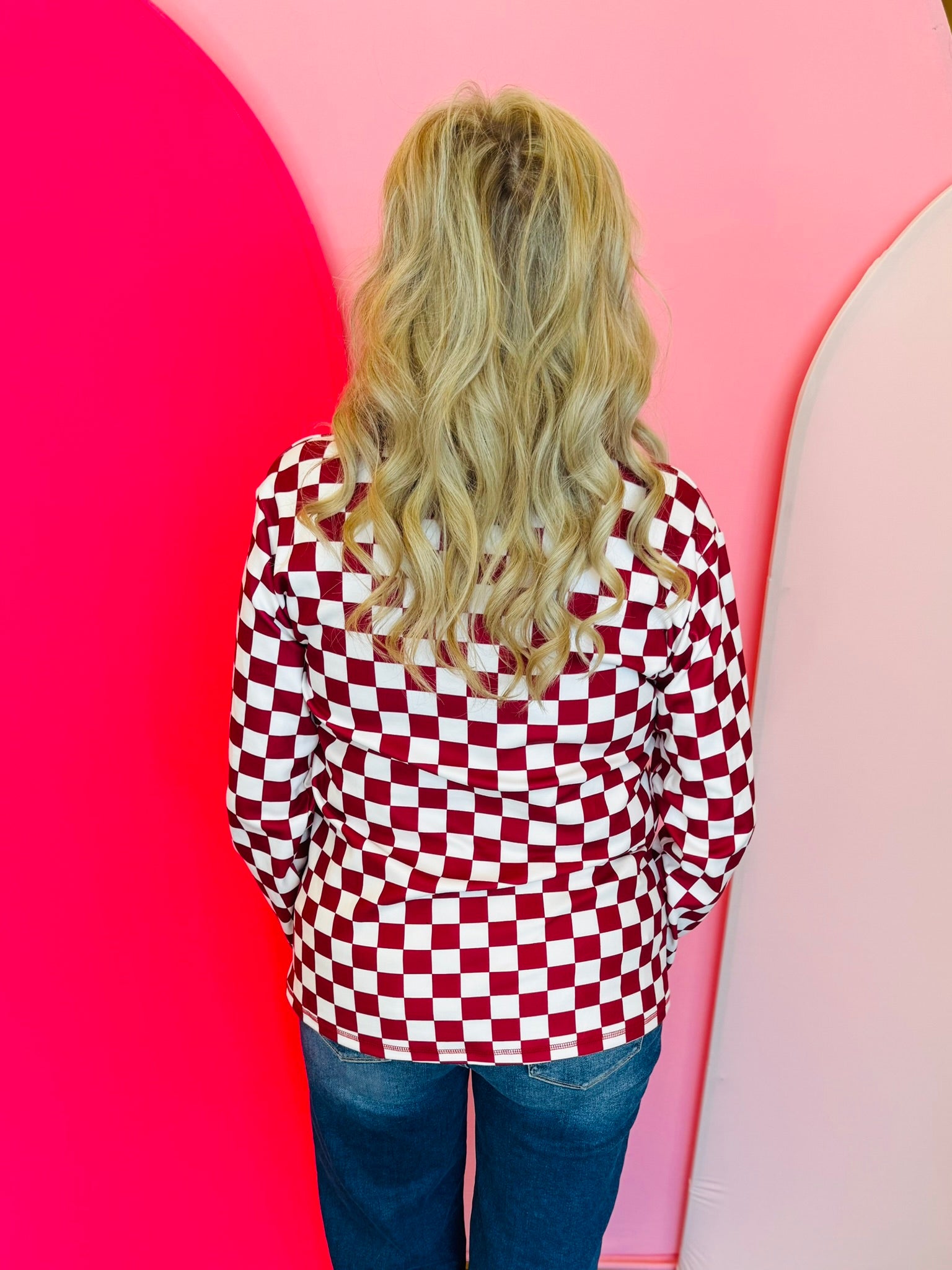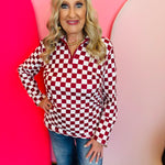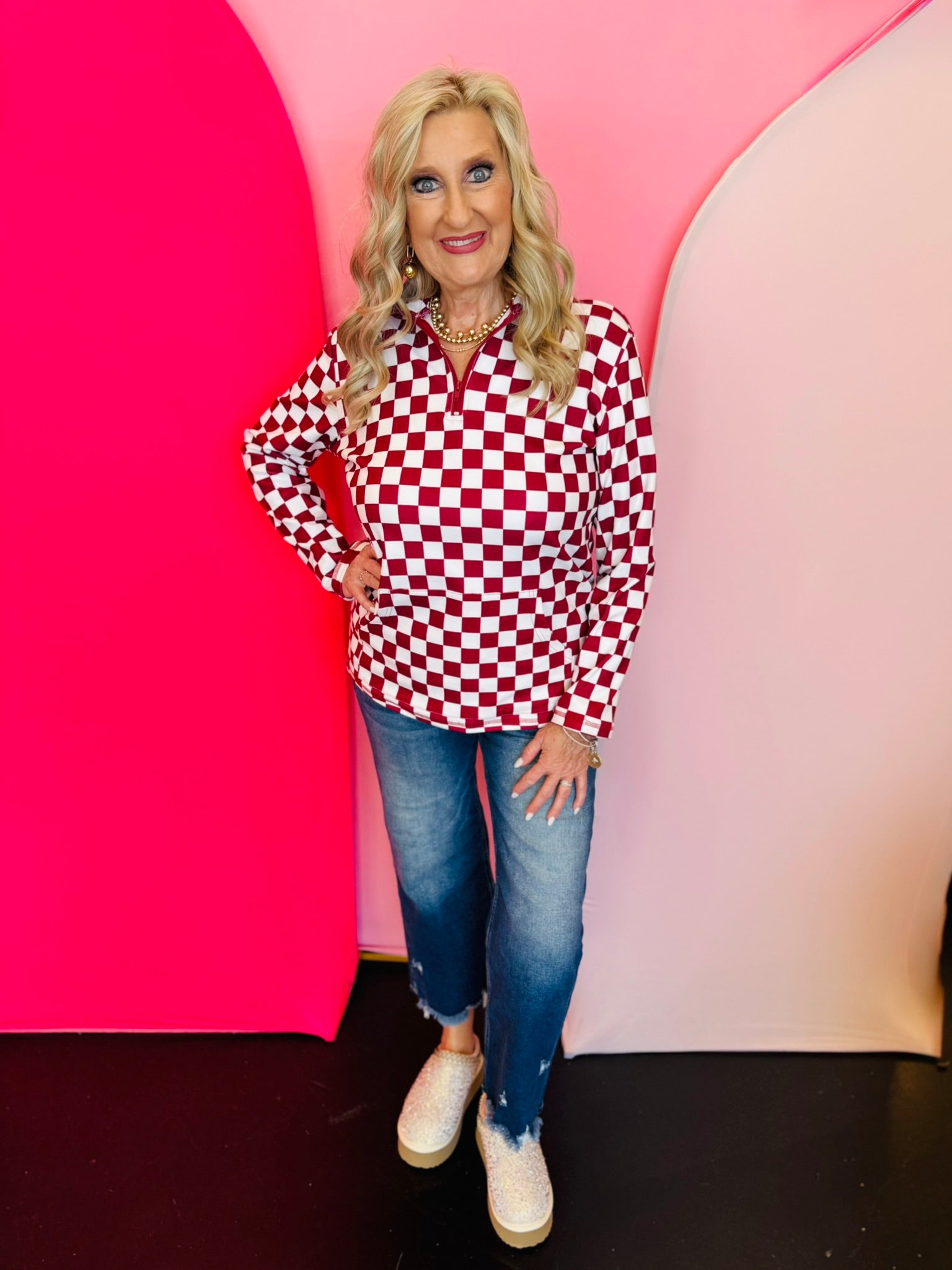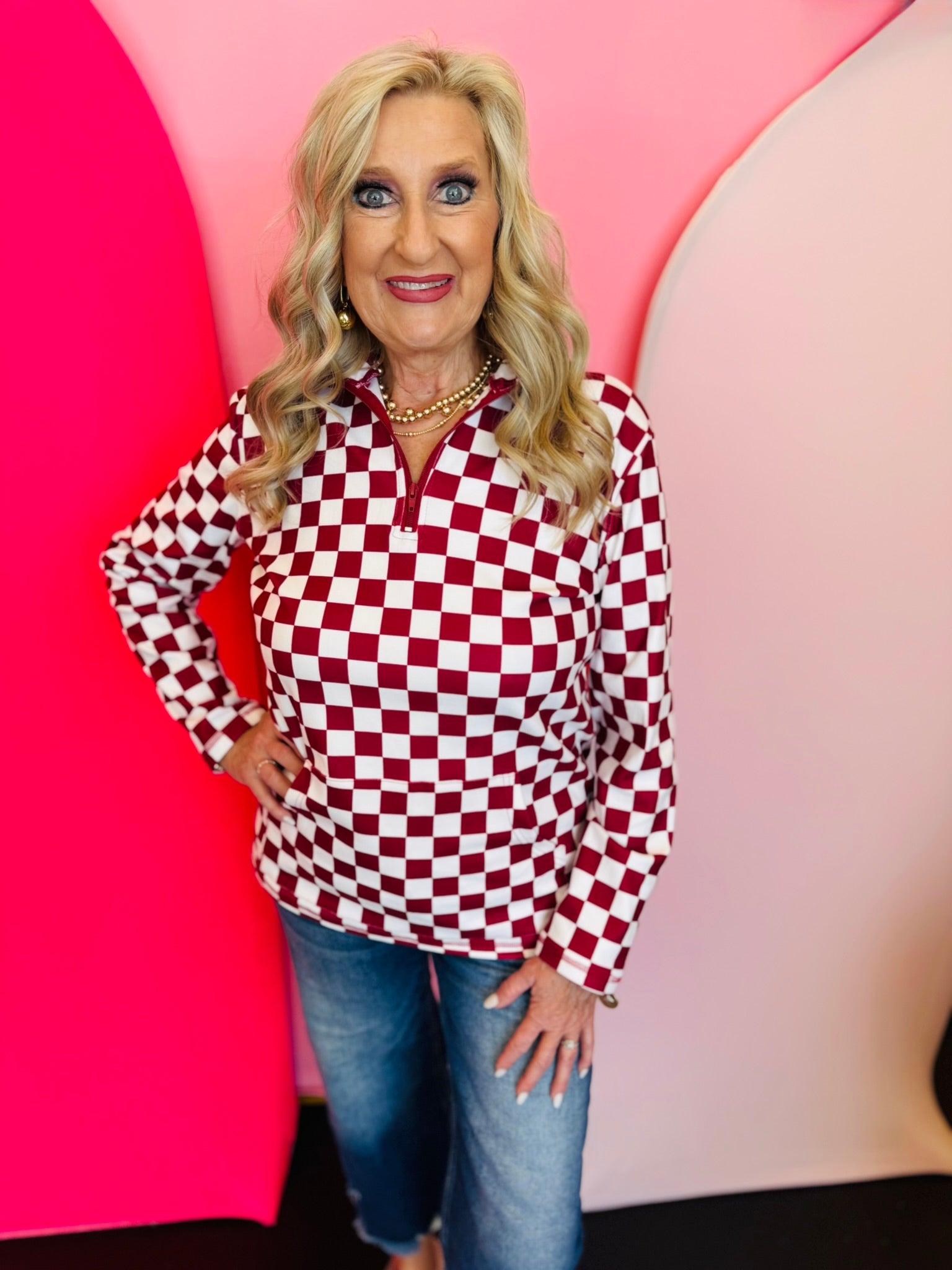 Maroon and white checkered quarter-zip pullover with collar and kangaroo pocket.