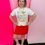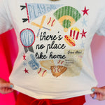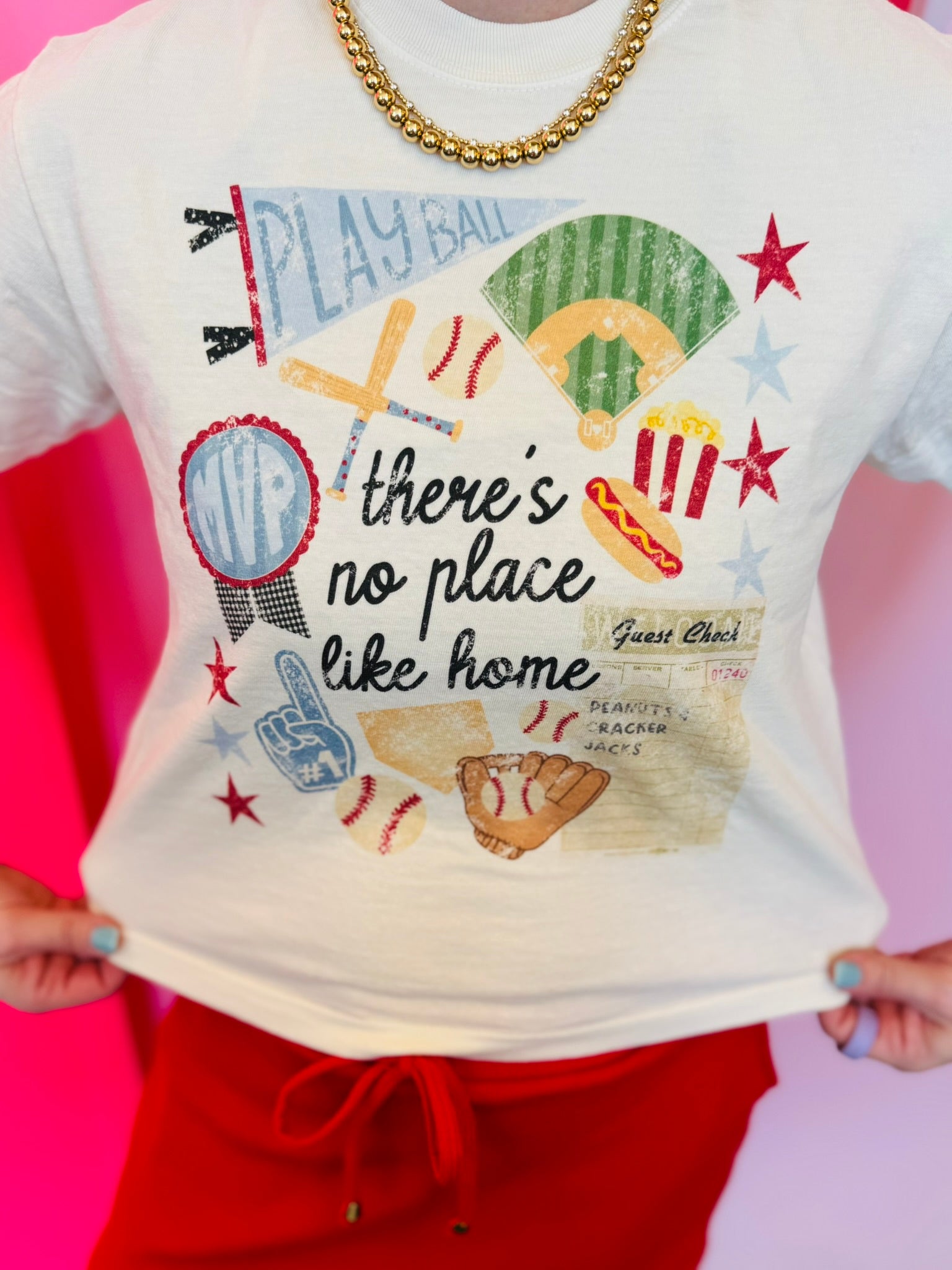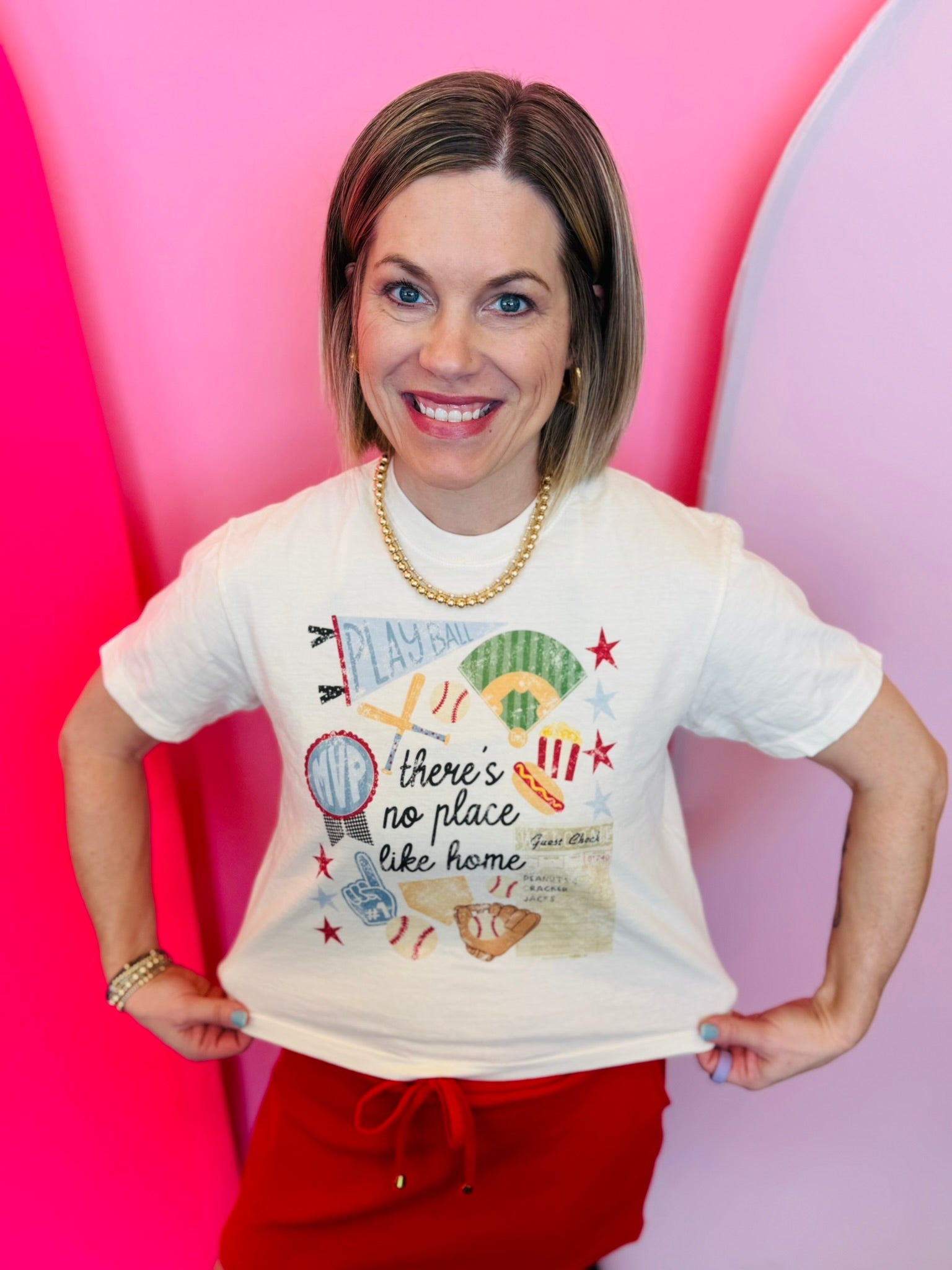 Celebrate home sweet home with the No Place Like Home Baseball Crop Tee, a playful blend of vintage Americana charm and laid-back comfort. Designed on an ivory Comfort Colors tee, this cropped style features a nostalgic baseball-inspired collage filled with classic game-day icons. From “Play Ball” pennants and foam fingers to hot dogs, baseball gloves, stars, and bold red and blue accents, every detail captures the spirit of summer ballgames and hometown pride.