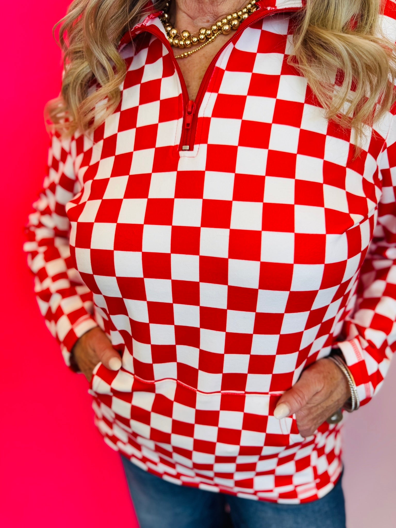 Red and white checkered quarter-zip pullover with collar and kangaroo pocket.