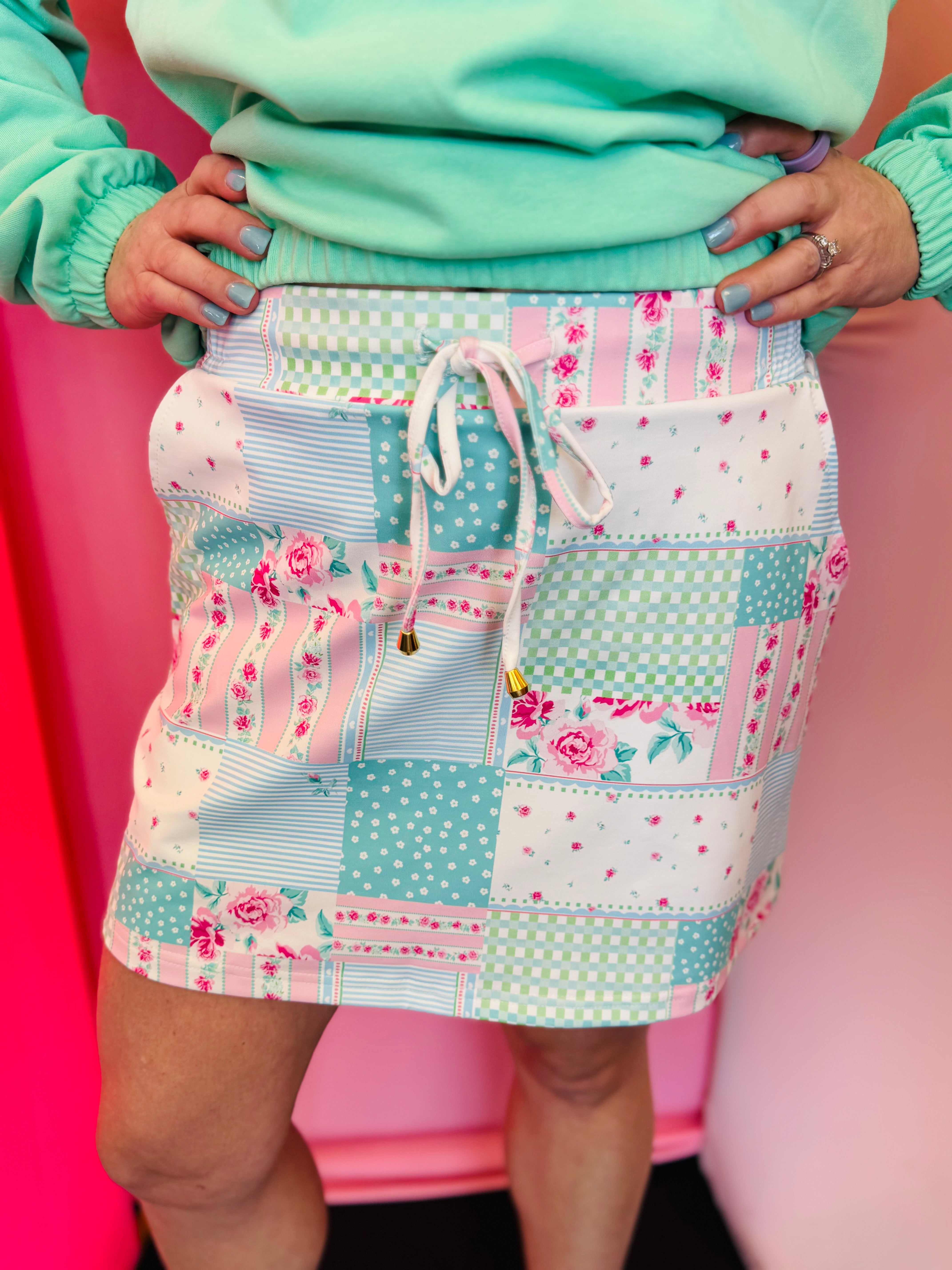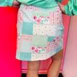 Designed in a fresh mint patchwork print, this skort features soft pastel panels in floral prints, delicate stripes, tiny polka dots, and classic gingham. The mix of mint and blush pink tones creates a light, feminine look that feels perfect for spring and beyond.