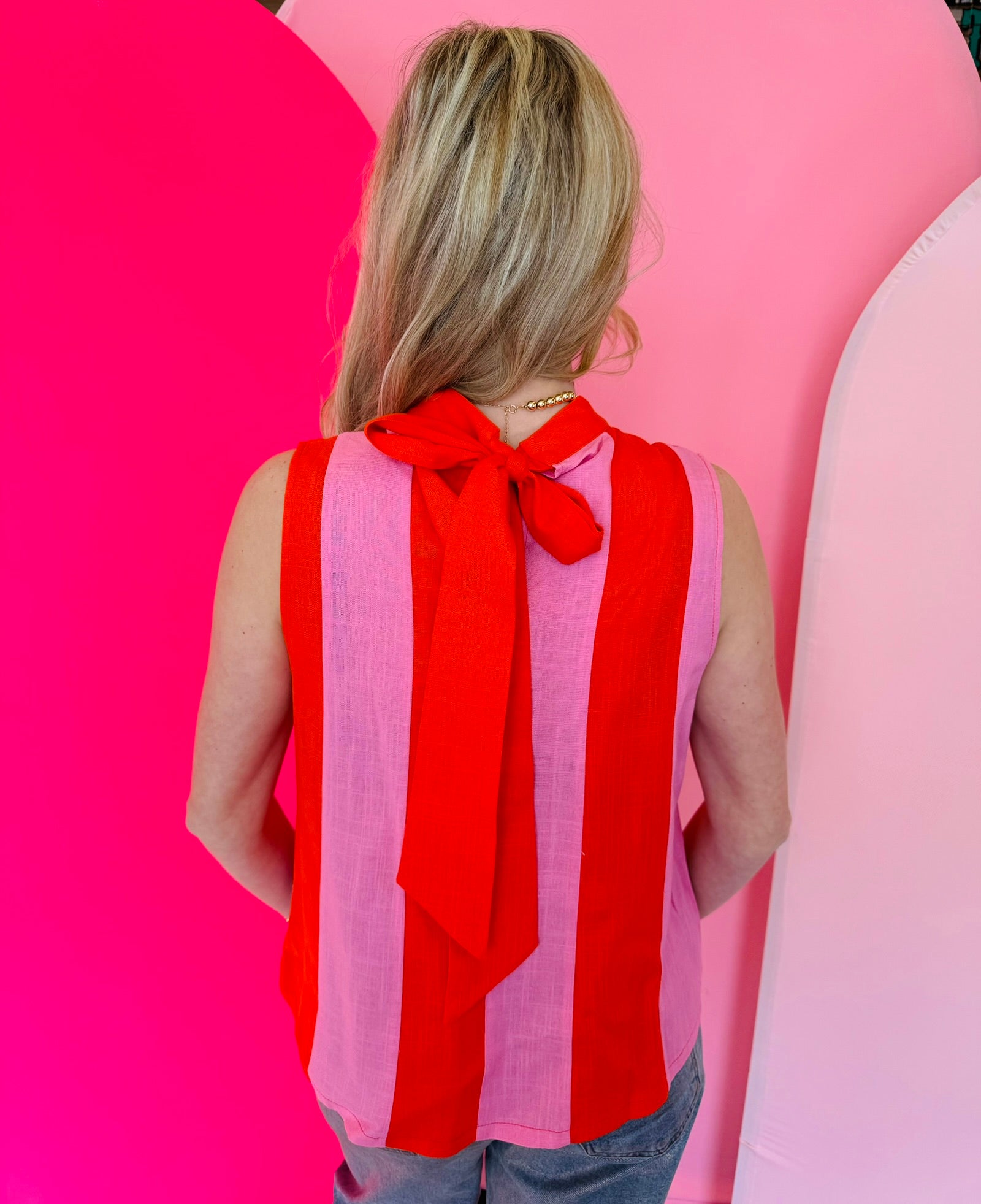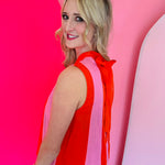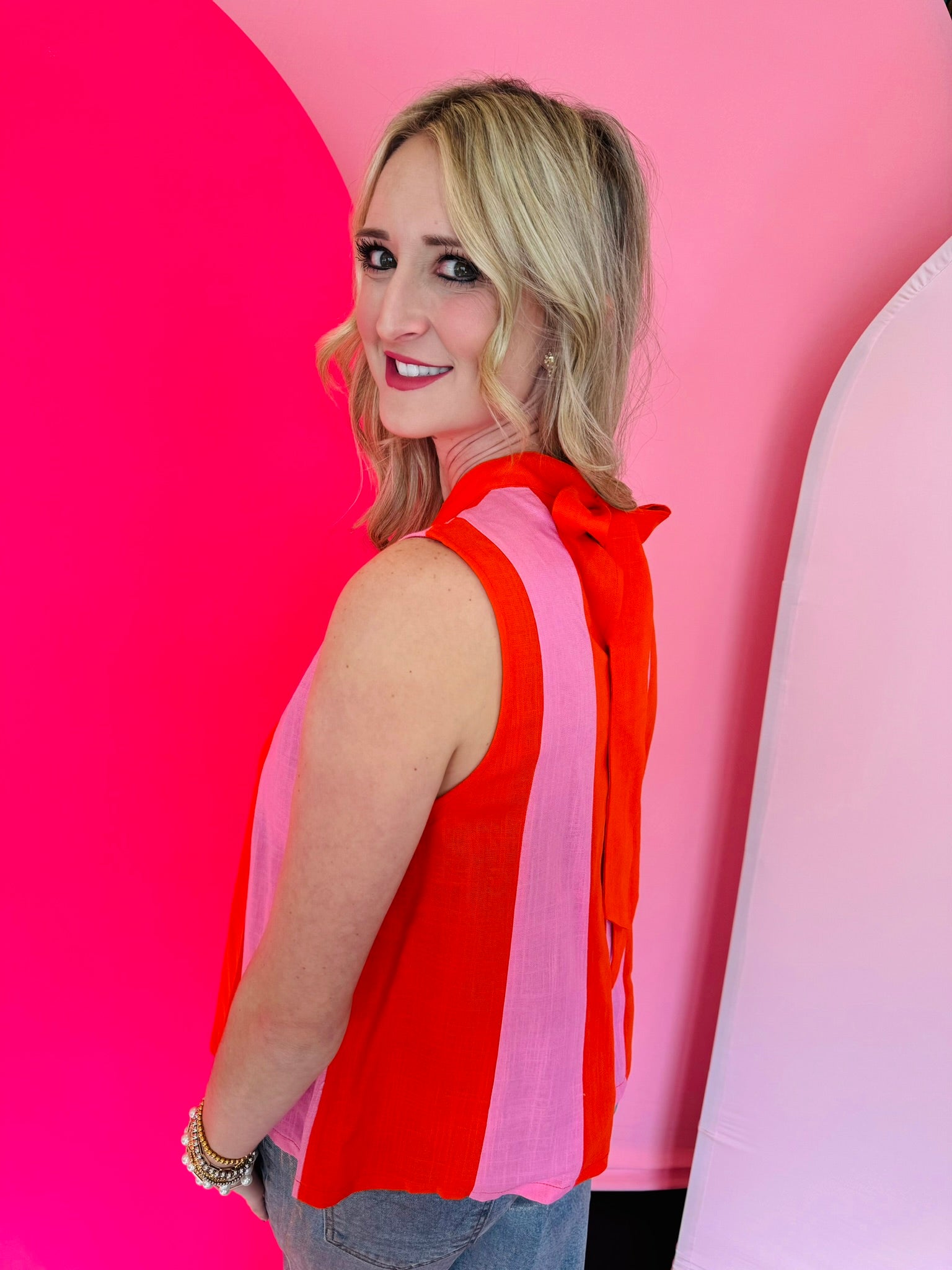 Complete your chic look with our Sleeveless Colorblock Top. Featuring pink and orange vertical stripes, the tie-back bow adds a touch of playfulness. Made from a luxurious woven fabric blend of 70% rayon and 30% polyester, this top is super trendy and perfect for any occasion.