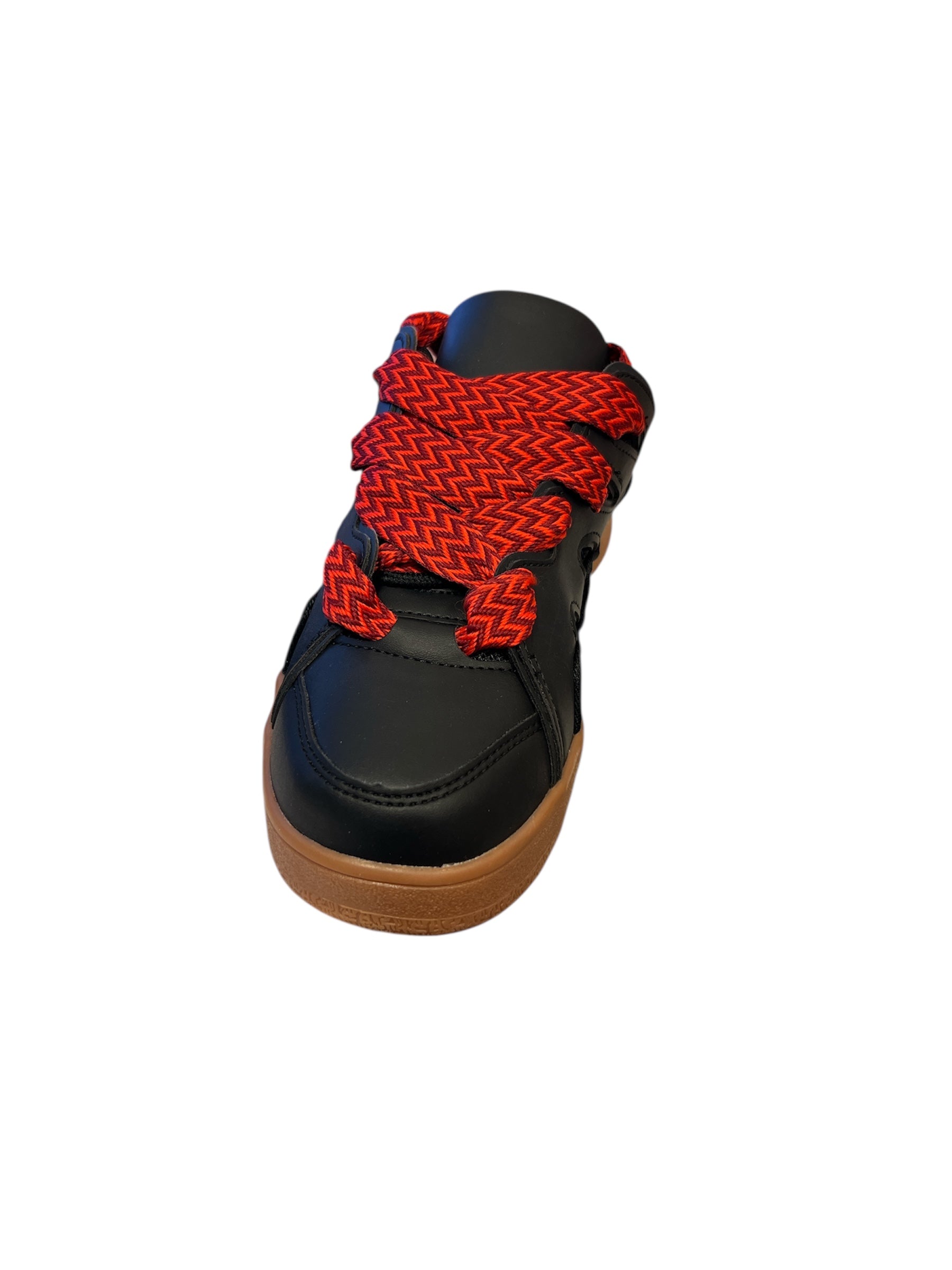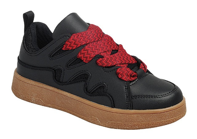 Black sneakers with chunky tan sole and oversized red woven laces.