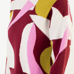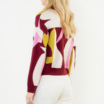 Abstract intarsia knit in burgundy, blush, and golden hues