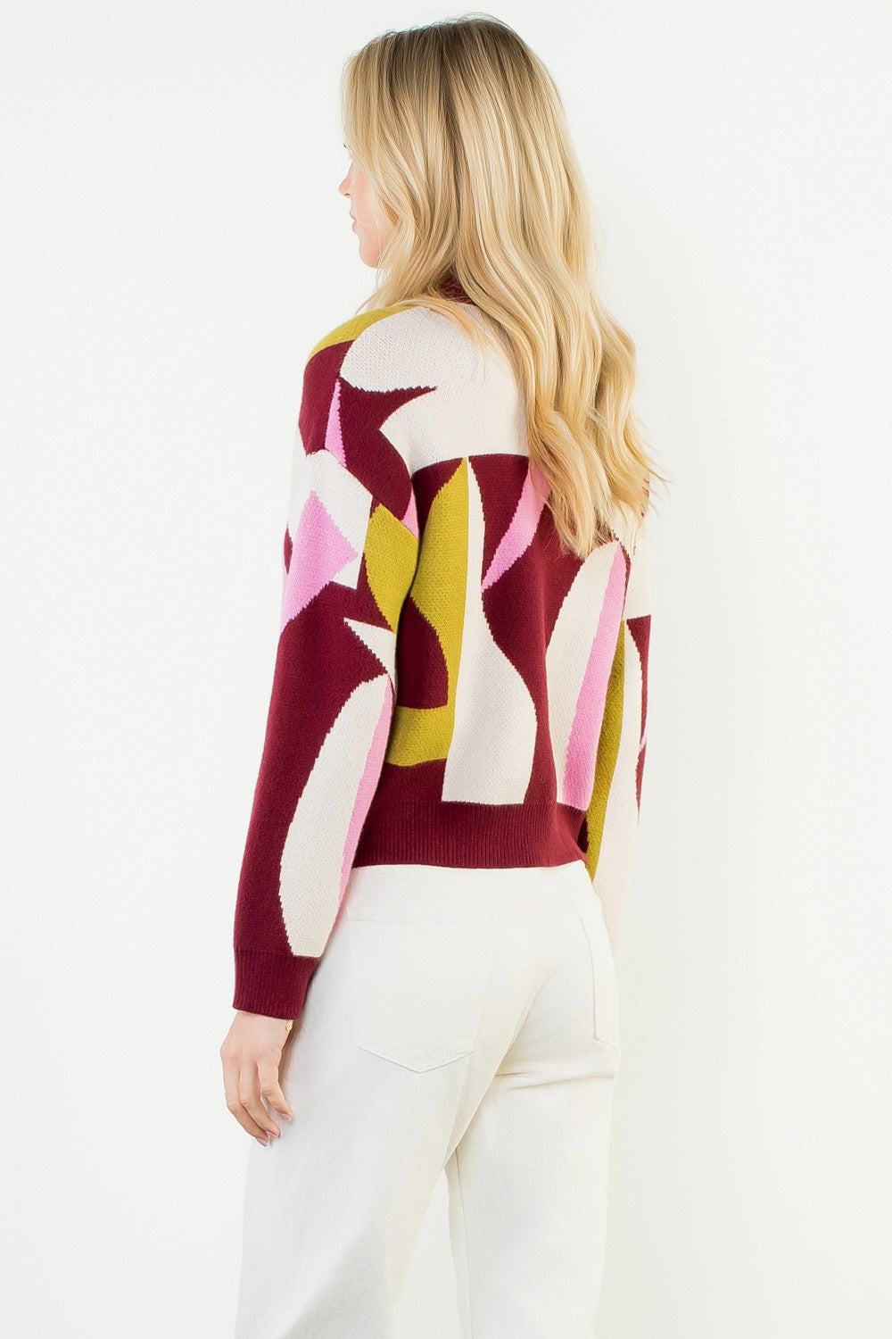 Make a sophisticated statement this season with our Abstract Bloom Mock Neck Sweater, a beautifully crafted knit that blends modern artistry with everyday comfort. Designed with an abstract intarsia pattern, this sweater features a rich burgundy base accented by soft blush and golden tones, creating a warm, painterly effect that elevates any outfit. The chic mock neckline adds refined structure, while the soft knit blend—43% viscose, 32% nylon, and 25% polyester—offers incredible comfort, stretch, and durability. Perfectly balanced between cozy and polished, this sweater pairs effortlessly with denim, tailored trousers, or skirts for work, dinner, or weekend outings. Lightweight enough for transitional weather yet warm enough for cooler days, it’s a versatile, boutique-worthy piece that brings contemporary art-inspired style to your wardrobe.