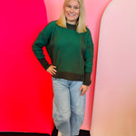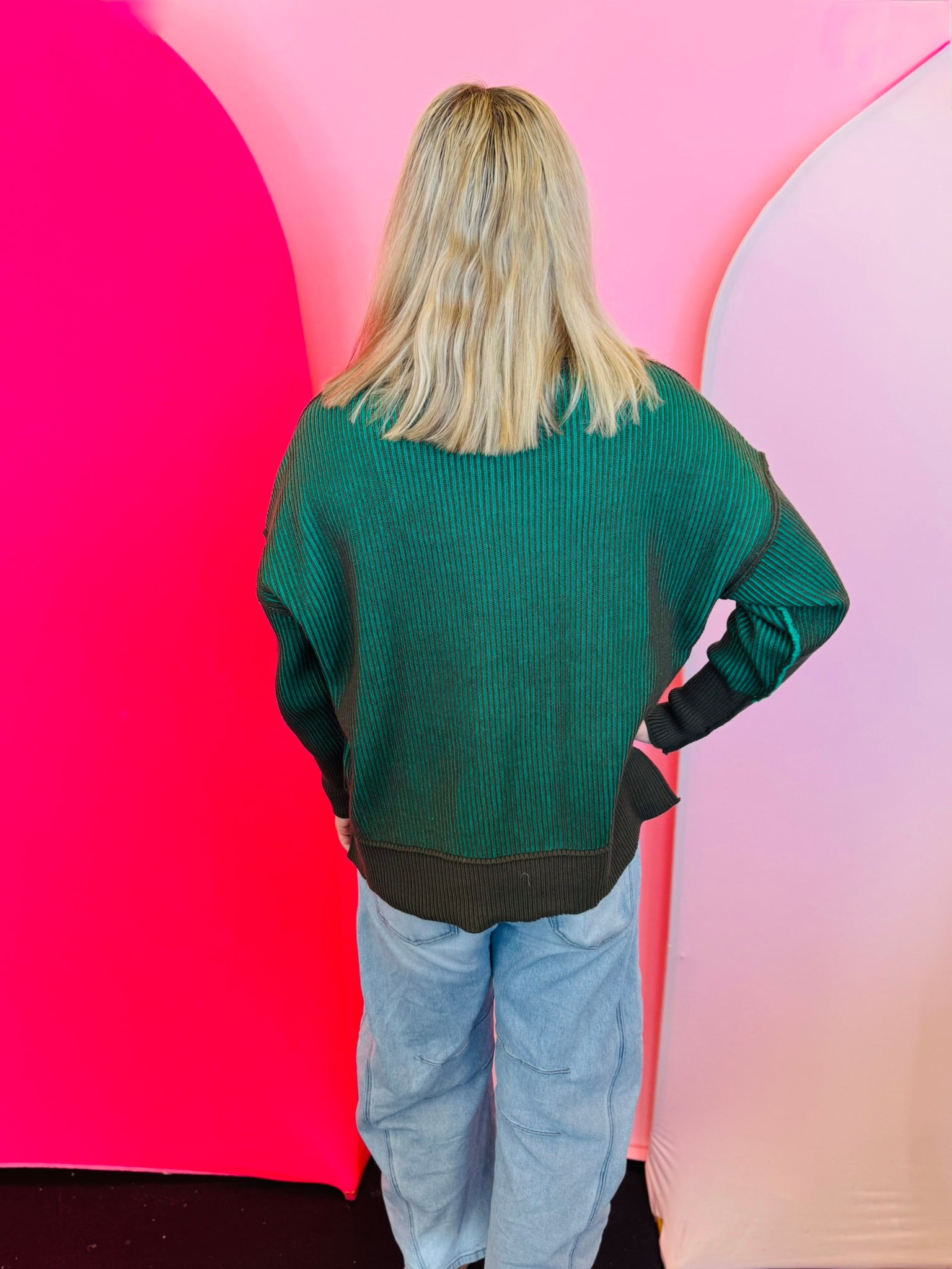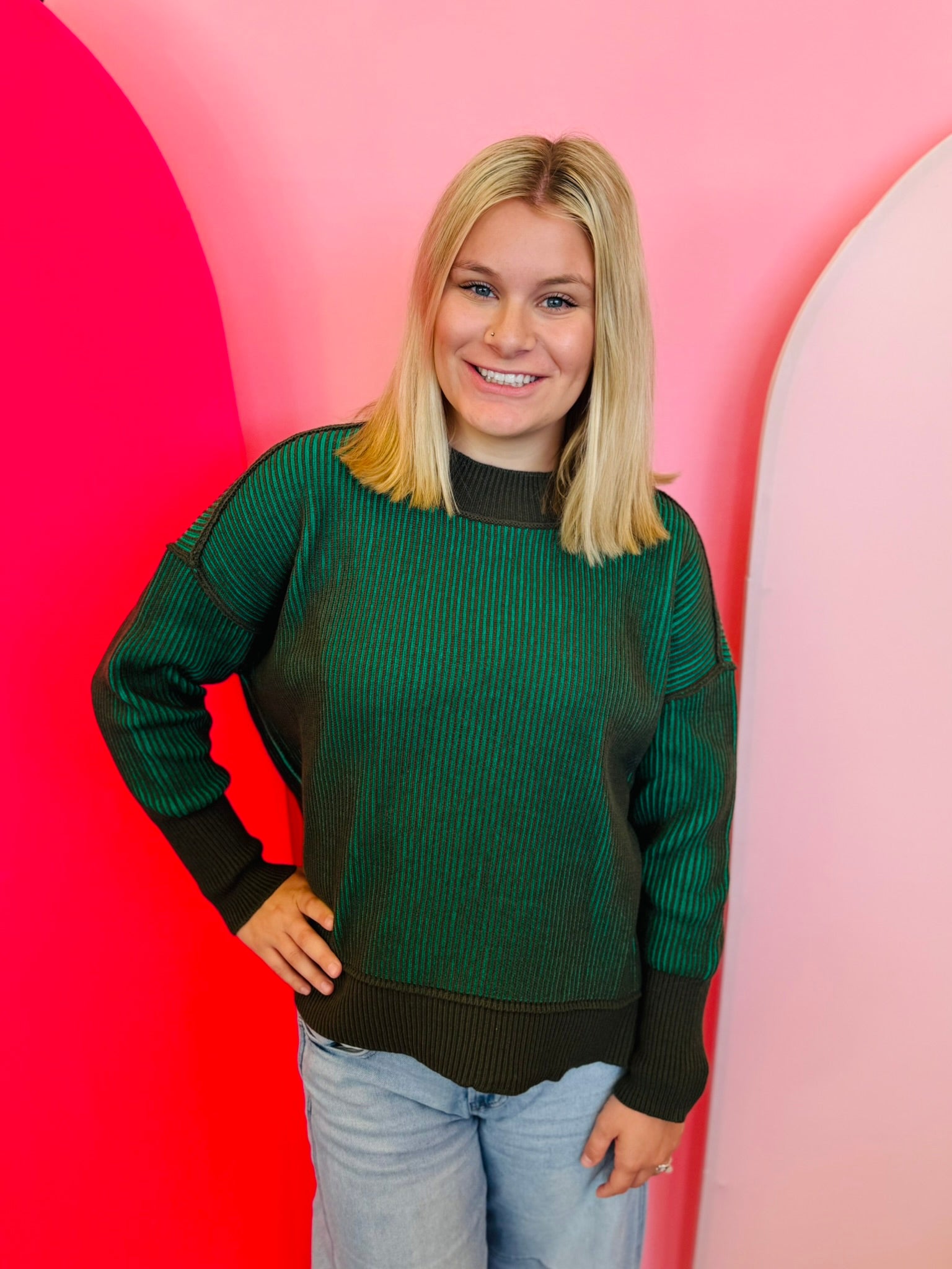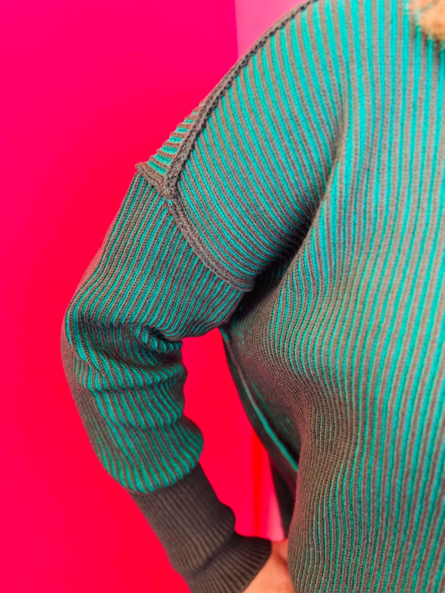 Bring effortless sophistication to your wardrobe with our Dark Olive Two-Tone Sweater, a rich blend of deep olive and soft contrasting tones that create a stylish, understated statement. The textured striped knit is accented with exposed seams, giving this cozy sweater a modern, lived-in edge. Its relaxed silhouette and dropped shoulders offer easy comfort, making it an ideal choice for everyday wear or layered fall looks. A gently curved hi-low hem with side slits adds flattering movement and pairs beautifully with denim, leggings, or wide-leg trousers. Finished with contrasting ribbed trim along the neckline, cuffs, and hem, this versatile sweater delivers the perfect balance of comfort, polish, and casual chic—your new go-to for effortless style all season long.