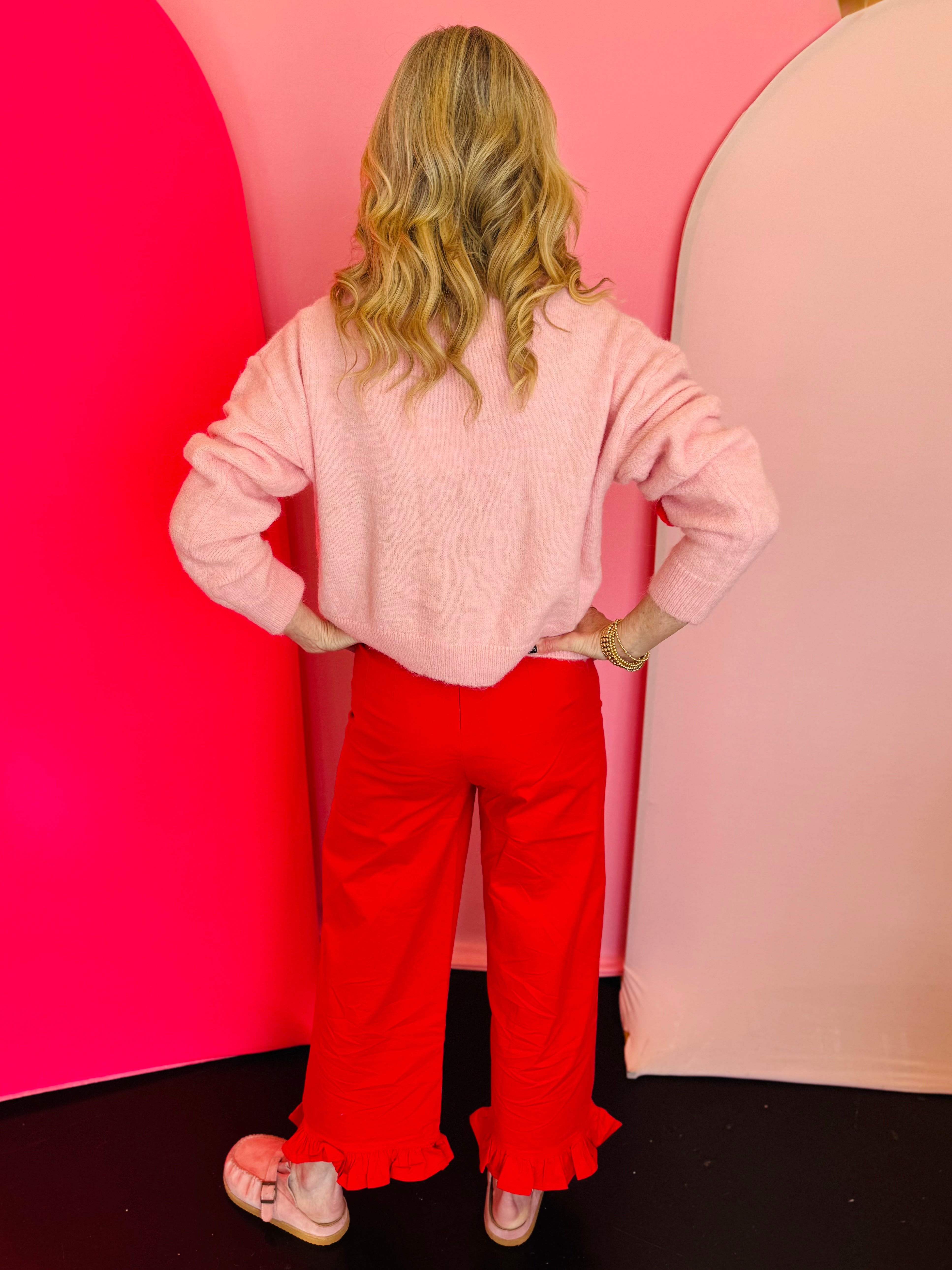 Cozy, charming, and perfect for layering, our Fuzzy Heart Button-Up Cardigan brings playful sweetness and soft texture to your everyday wardrobe. Crafted from a luxe blend of wool, polyester, acrylic, nylon, and spandex, this cardigan offers a warm yet lightweight feel with the perfect amount of stretch. The soft pink knit base is adorned with oversized fuzzy red hearts across the front and sleeves, giving the piece a standout Valentine-inspired look that’s wearable year-round. A classic button-up front allows for easy styling—wear it open over a tee or buttoned for a cozy, polished finish. Whether paired with denim, skirts, or lounge sets, this heart-print cardigan adds instant charm and boutique appeal to any outfit.