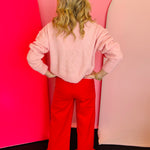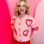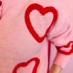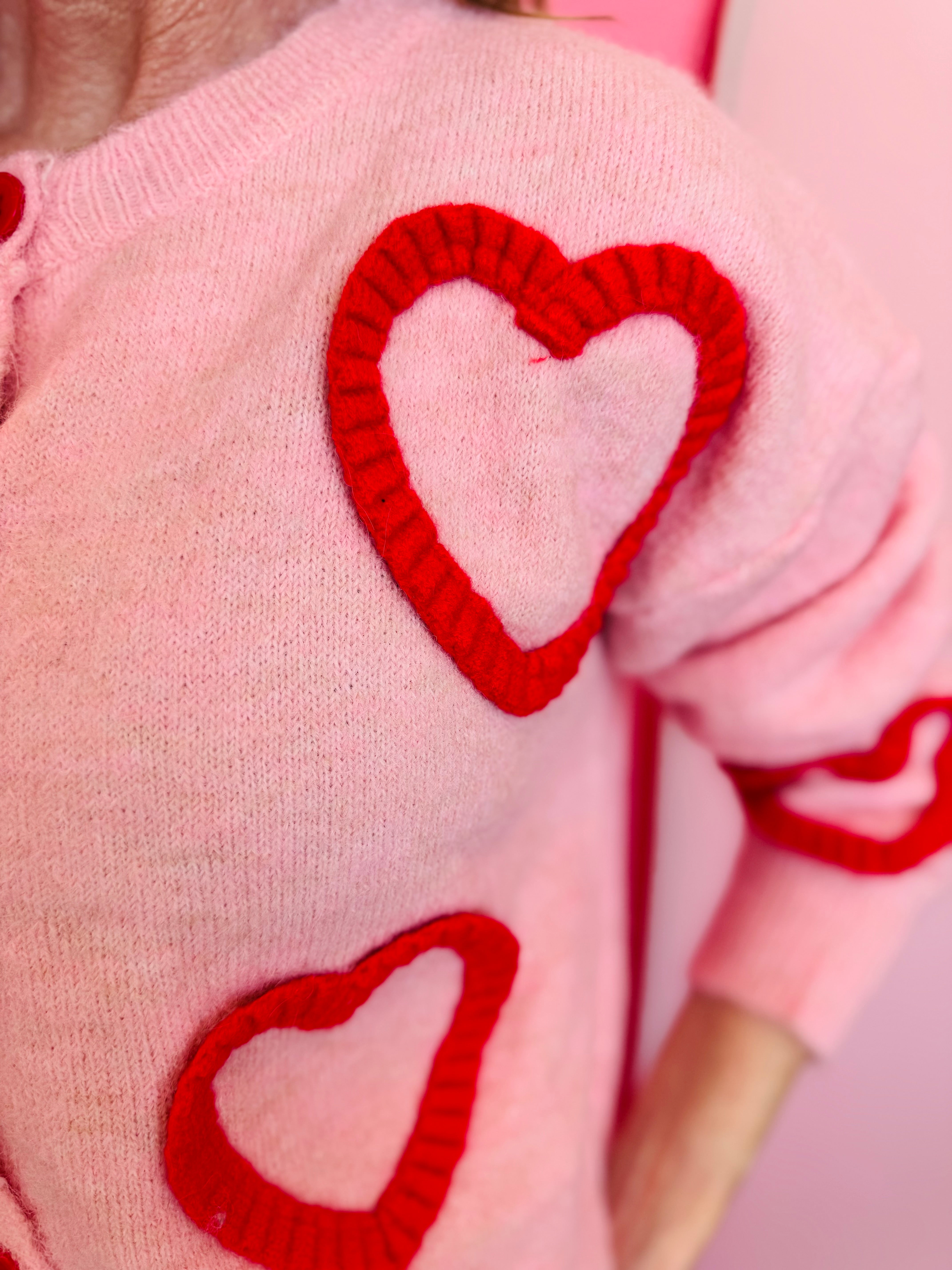 Soft pink cardigan with oversized fuzzy red heart pattern