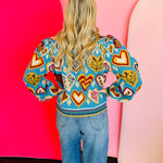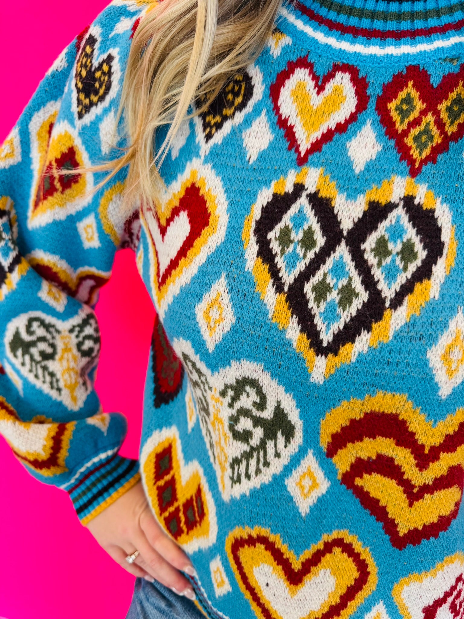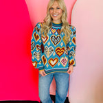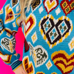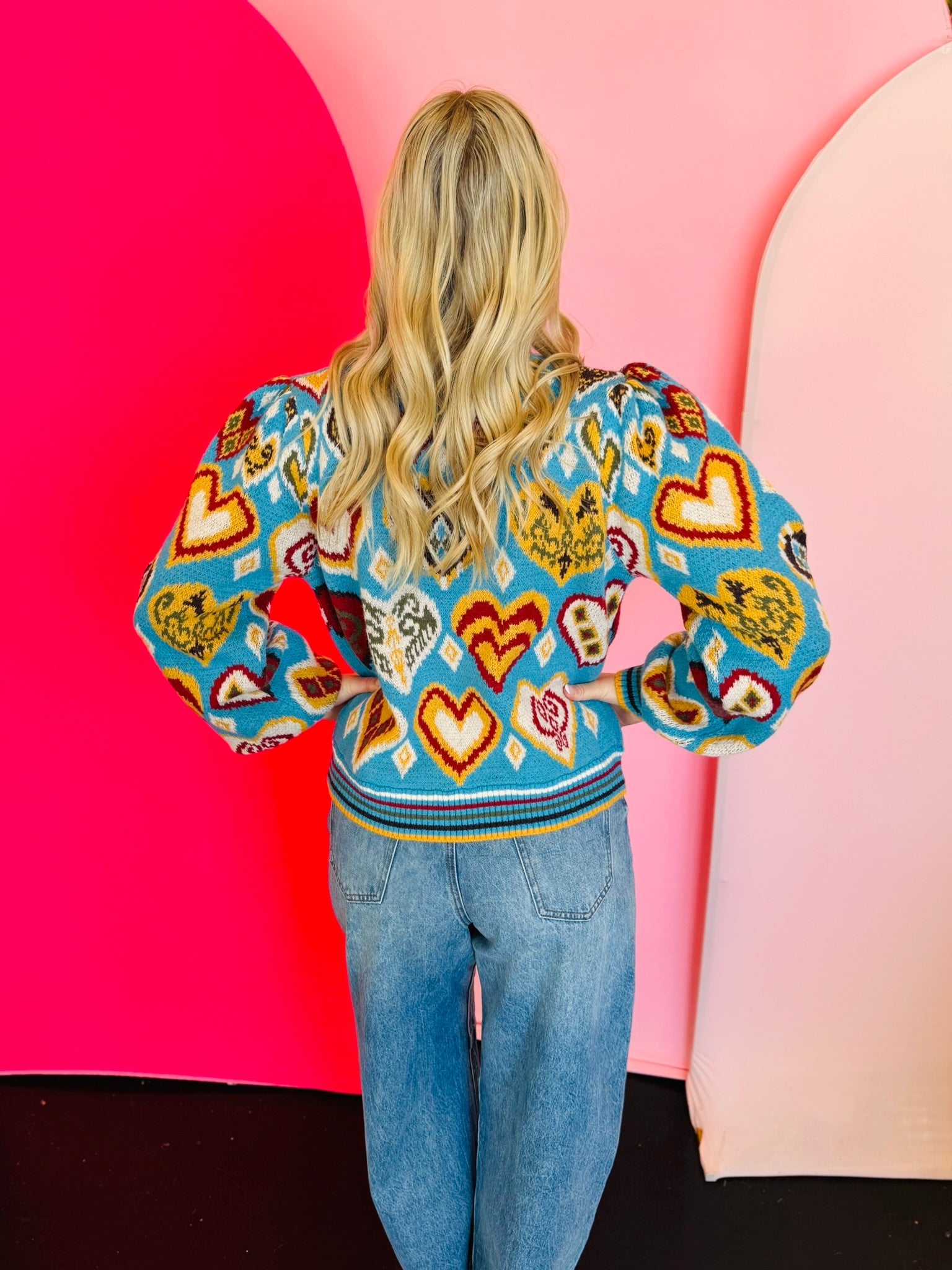 Embrace playful charm with this Sky Blue Heart Pattern Balloon Sleeve Sweater, a vibrant addition to any wardrobe. This delightful pullover features a cheerful mix of colorful heart and geometric knit patterns, creating a truly eye-catching design. Its ribbed striped mock neckline adds a touch of classic style, while the long balloon sleeves with ribbed striped cuffs offer a trendy, comfortable fit. The ribbed striped hem completes the look, ensuring a flattering, relaxed silhouette. Perfect for adding a pop of color and personality to your ensemble, this sweater is ideal for casual outings or cozy days.