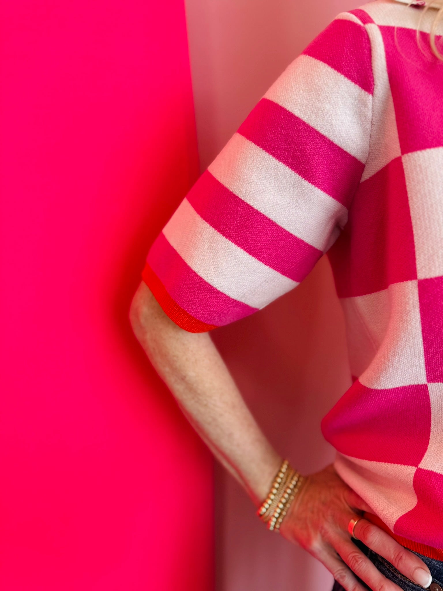 Add a playful pop of color to your everyday wardrobe with our Pink Check Collared Sweater Top. Designed with a bold pink and ivory check pattern, this sweater brings a fresh, youthful twist to classic knitwear. The soft collared neckline and subtle V-split detail create a polished, sporty-inspired look that’s perfect for both casual and dressed-up styling.