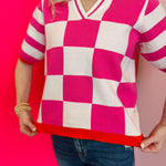 Pink checkered short sleeve collared sweater top with ribbed hem