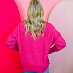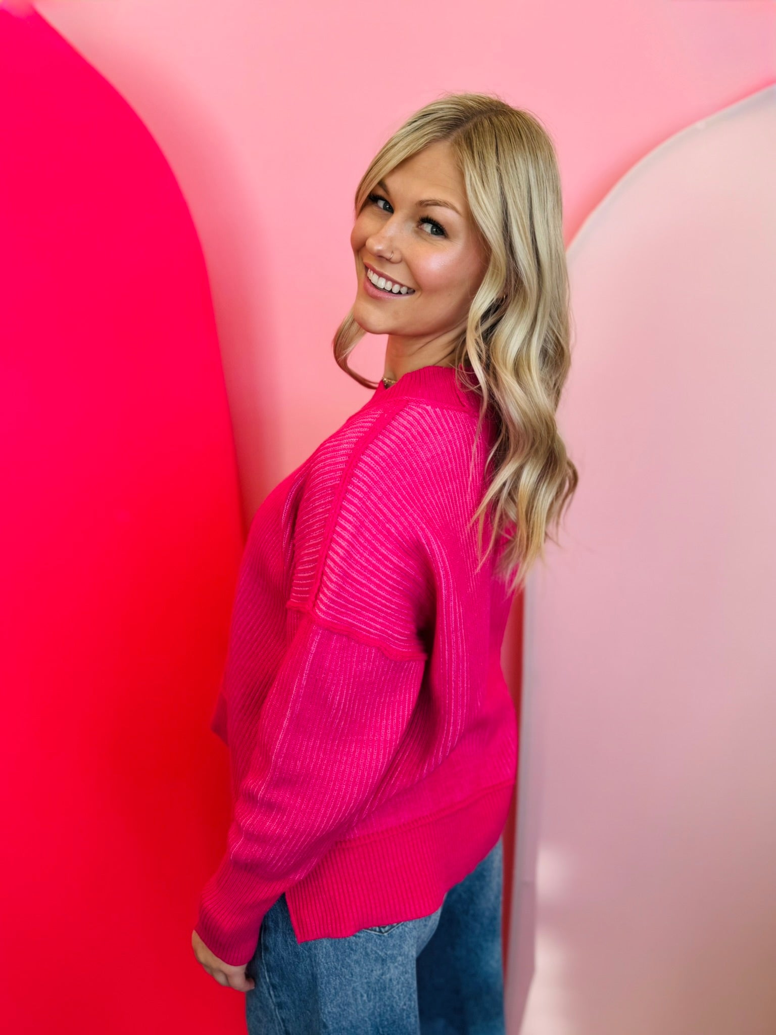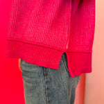 Make a bold style statement with our Hot Pink Two-Tone Sweater, a vibrant blend of bright pink shades designed to bring energy and confidence to your wardrobe. The playful striped knit is highlighted by exposed seams, giving this sweater a trendy, modern look while still keeping it soft, cozy, and easy to wear. Its relaxed silhouette and dropped shoulders create a comfortable drape that flatters every body type. A stylish hi-low hem with side slits adds movement and pairs beautifully with your favorite denim, leggings, or a sleek skirt. Finished with contrasting ribbed trim at the neckline, cuffs, and hem, this standout sweater delivers the perfect mix of lively color, comfort, and everyday chic—ideal for transitioning effortlessly from casual outings to fun seasonal events.
