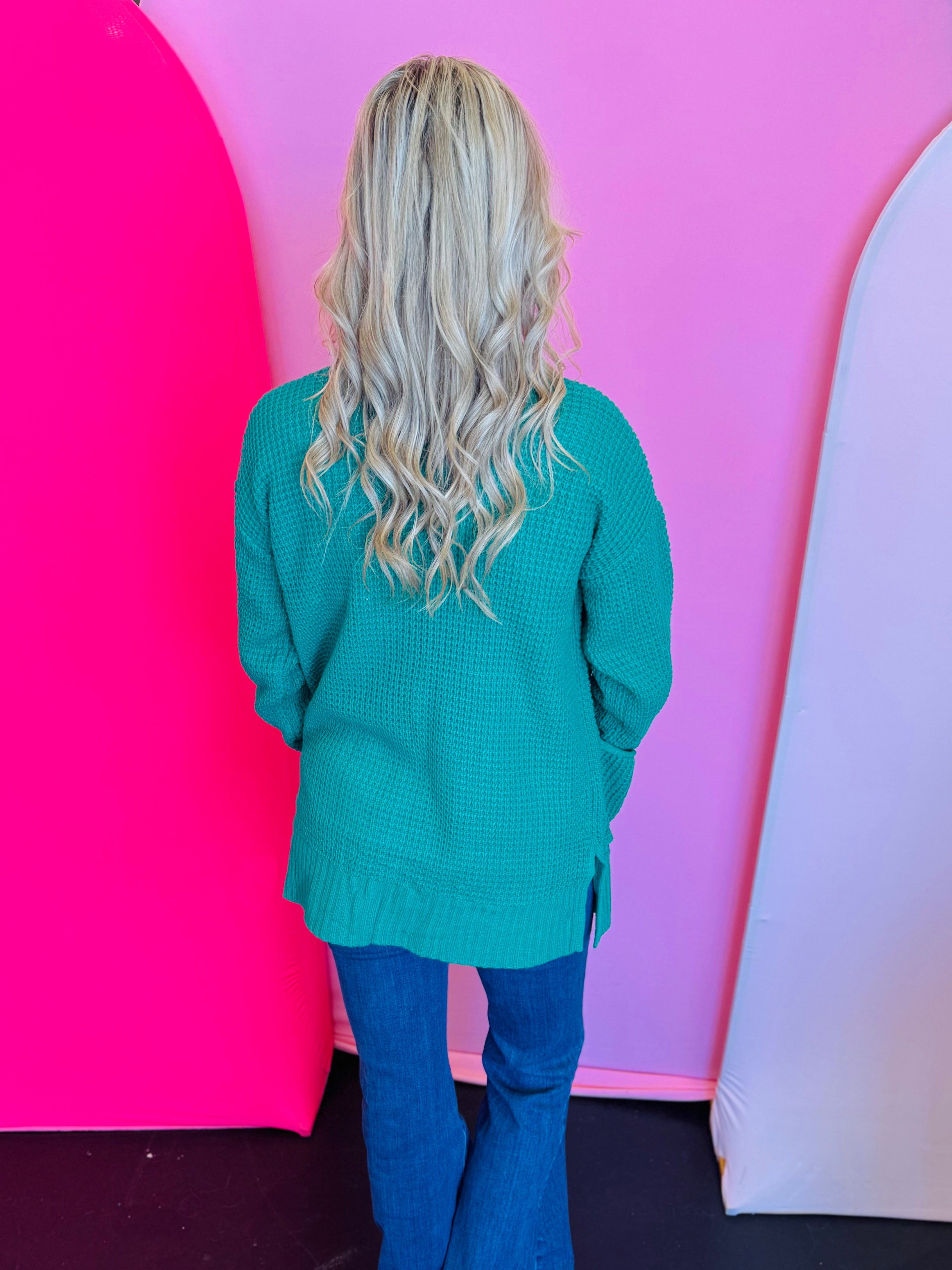 Brighten your layers with our Kelly Green Waffle Knit Cardigan, the perfect blend of cozy comfort and timeless style. Crafted from 100% acrylic, this low-gauge, midweight open cardigan sweater offers a soft, textured feel with a classic waffle knit pattern that keeps you warm without weighing you down. Designed for a relaxed fit, it features front pockets for added convenience and an open-front silhouette that makes layering effortless. With a total body length of 28" and chest width of 42" (approx., size small), it’s the ideal everyday piece for pairing with jeans, leggings, or dresses. Whether you’re lounging at home or heading out, this kelly green cardigan adds a pop of color and cozy charm to your fall or spring wardrobe.