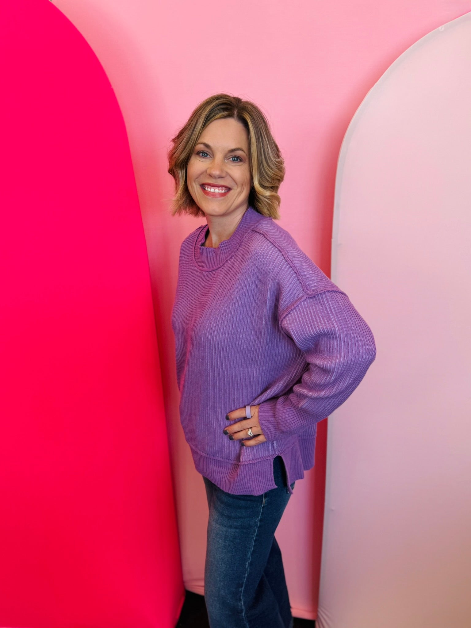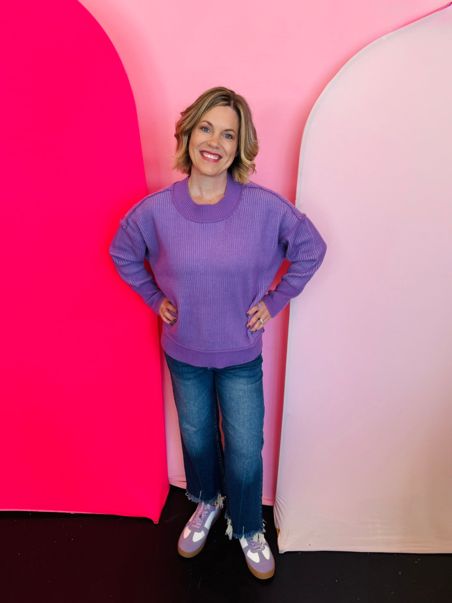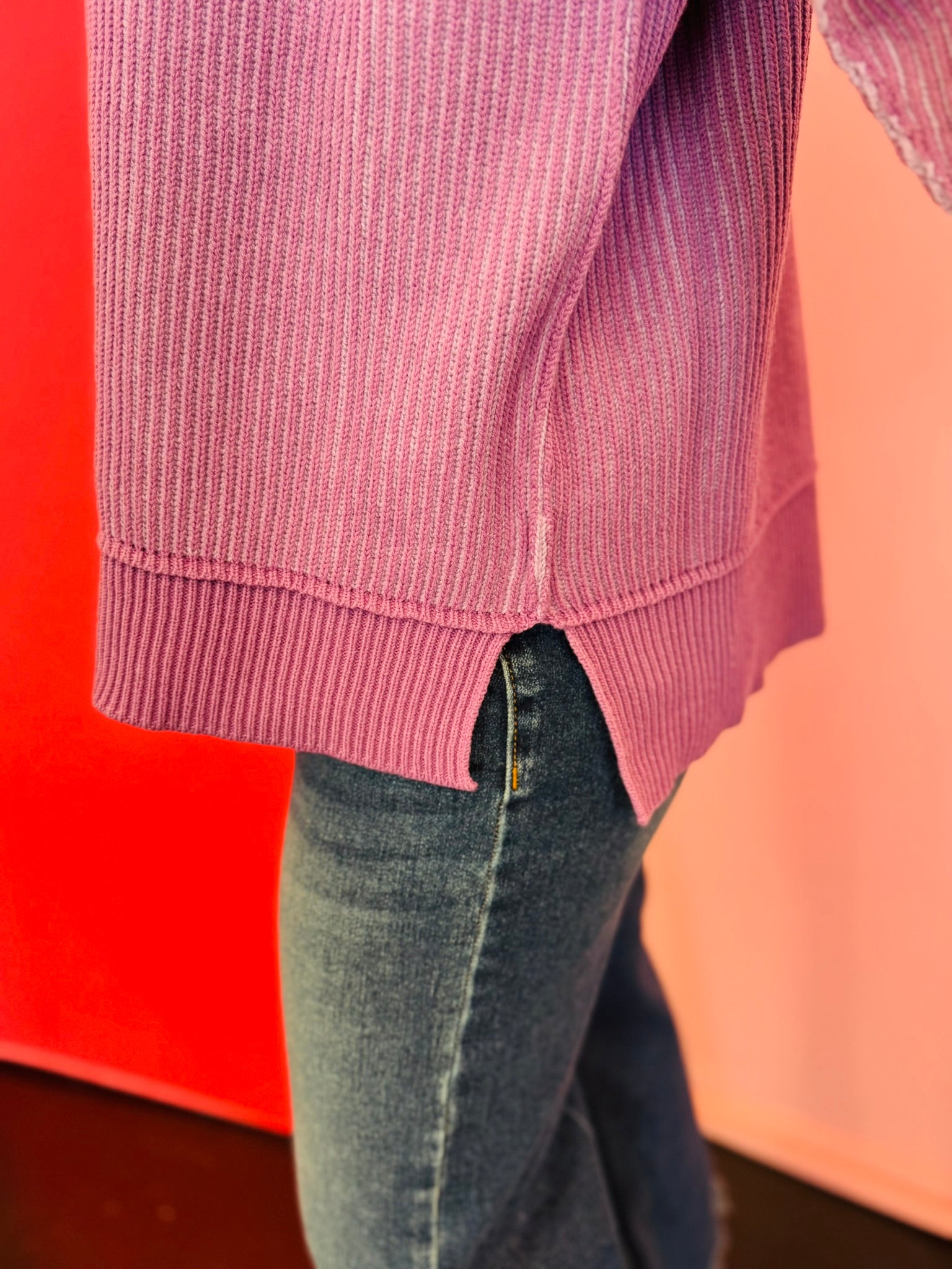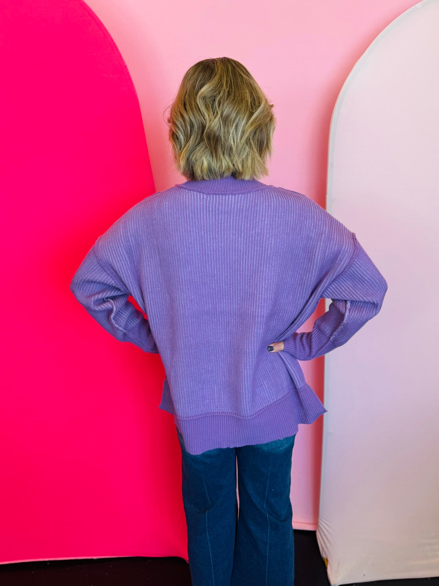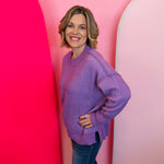 Elevate your everyday style with our Lavender Two-Tone Sweater, a dreamy blend of soft violet and lavender hues designed to bring effortless charm to your wardrobe. The striped knit design showcases exposed seams that add a touch of modern edge, giving this sweater standout appeal without sacrificing comfort. Its relaxed silhouette and dropped shoulders create an easy, laid-back fit that feels cozy from morning to night. A chic hi-low hem with subtle side slits offers beautiful movement and makes it perfect for pairing with jeans, leggings, or even a sleek skirt. Finished with contrasting ribbed trim along the neckline, cuffs, and hem, this versatile piece delivers a polished yet comfortable look you’ll reach for all season long.