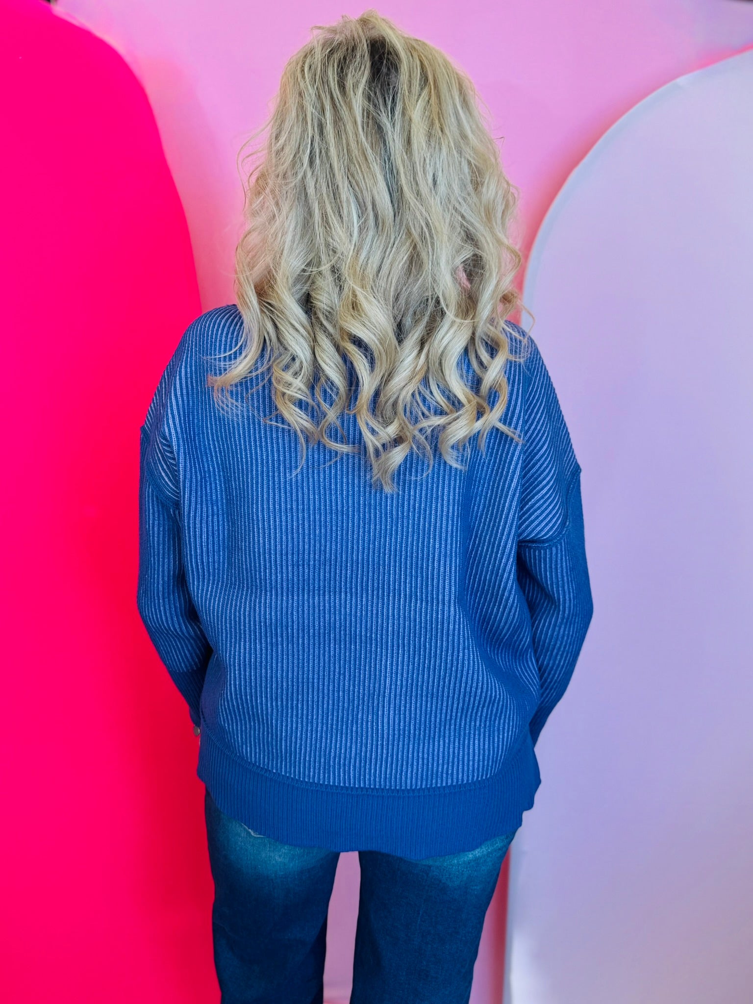 Refresh your wardrobe with the cool, coastal charm of our Marlin Blue Two-Tone Sweater, a beautiful blend of deep marine blue and soft contrasting hues that create a calm yet captivating look. The striped knit design showcases exposed seams that add a touch of modern texture, making this sweater both stylish and effortless. Its relaxed silhouette drapes comfortably with dropped shoulders that enhance the laid-back fit, perfect for everyday wear or layered seasonal outfits. A subtle hi-low hem with side slits offers flattering movement and pairs seamlessly with denim, joggers, or casual skirts. Finished with contrasting ribbed trim at the neckline, cuffs, and hem, this versatile sweater brings together comfort, polish, and easygoing style you'll want to reach for again and again.