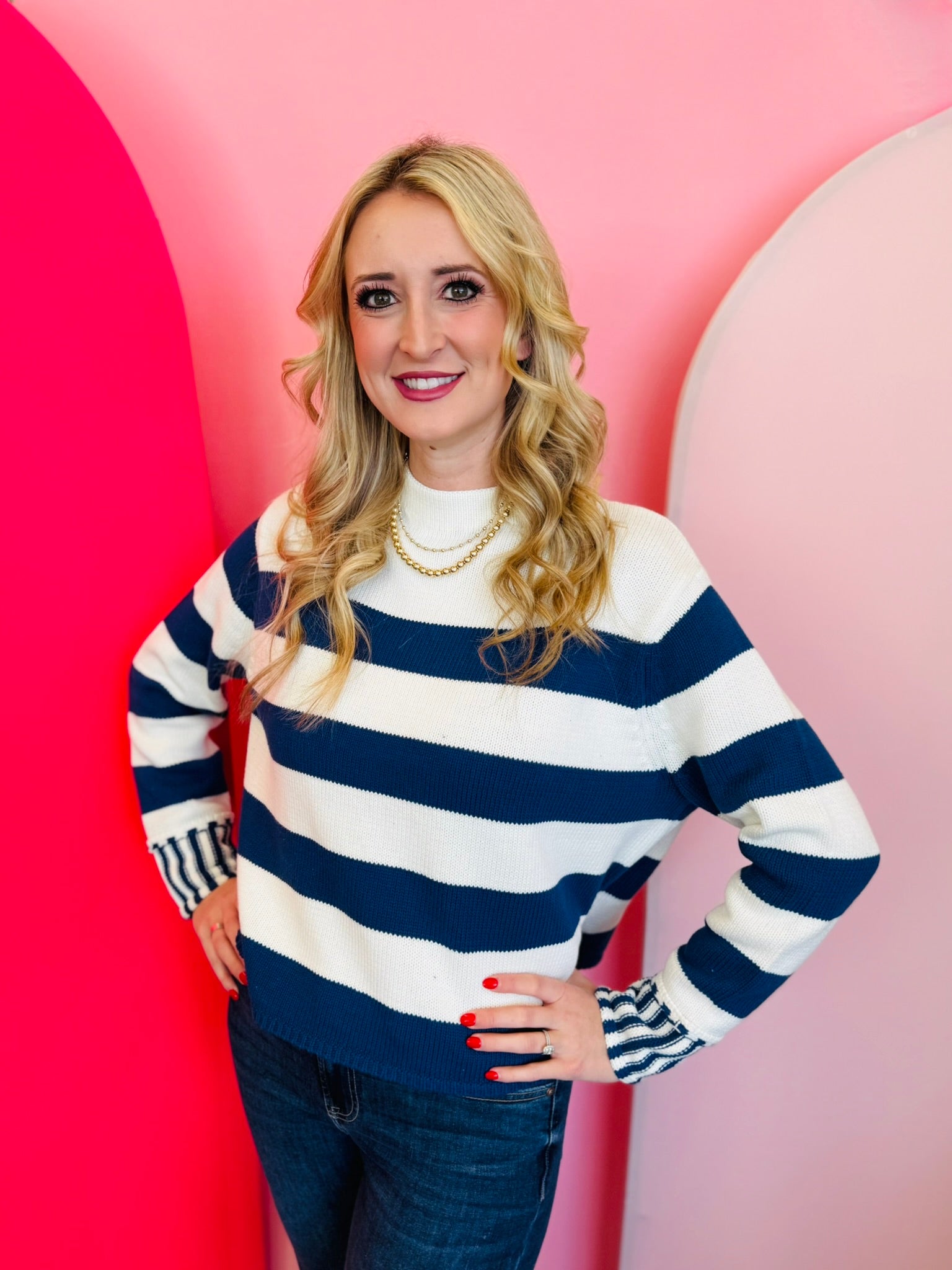 Embrace classic, effortless style with our Navy Striped Sweater, a timeless wardrobe staple crafted for everyday comfort and chic versatility. Made from 100% soft, breathable cotton, this sweater features wide navy statement stripes paired with contrasting striped cuffs for a modern, elevated finish. The relaxed, boxy silhouette provides a flattering drape that pairs beautifully with denim, trousers, skirts, or leggings. A classic crew neckline adds polish, making it easy to layer or wear solo throughout the seasons. With a total body length of approximately 21" and a 47" chest measured from size small, this striped sweater offers the perfect blend of cozy texture, quality knit construction, and refined style fit for any casual outing or workday look.
