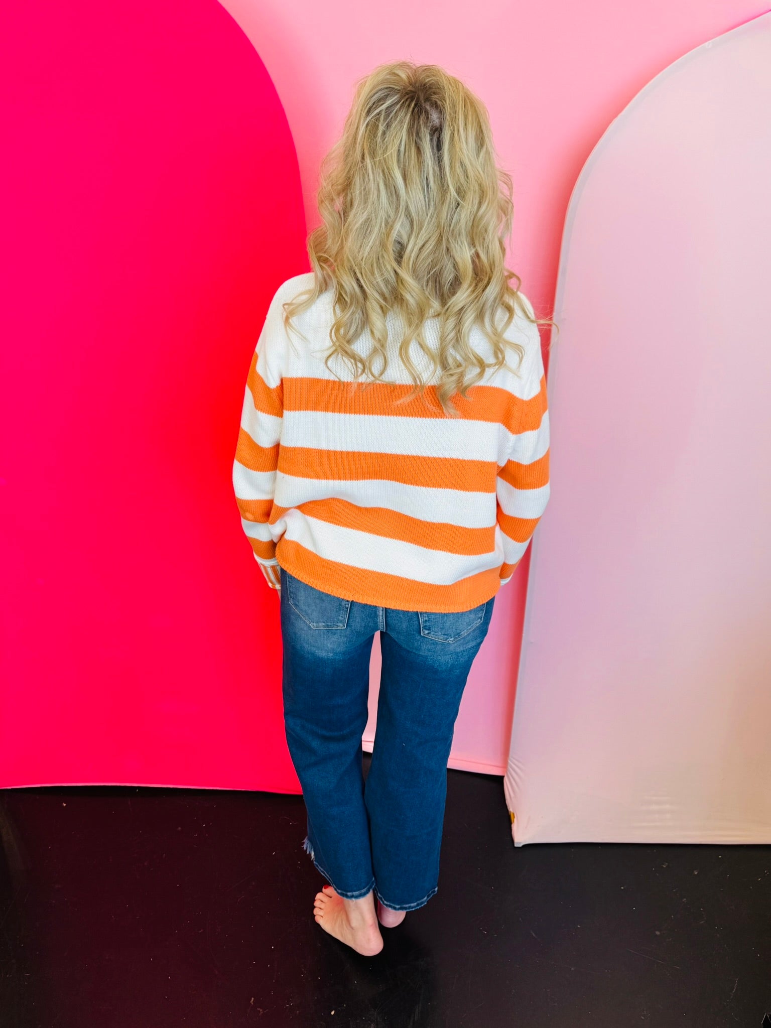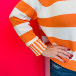 Brighten your closet with our Orange Striped Sweater, a bold and cheerful knit designed to bring vibrant color and cozy comfort to your everyday style. Made from 100% soft, breathable cotton, this sweater features wide orange statement stripes paired with contrasting striped cuffs for a fun, modern twist on a classic design. The relaxed, boxy silhouette offers an easy, flattering drape that pairs perfectly with jeans, leggings, or skirts. A timeless crew neckline adds versatile appeal, whether you choose to layer it under jackets or wear it on its own for a standout fall or spring look. With a total body length of approximately 21" and a 47" chest measured from size small, this striped sweater blends bold personality with effortless comfort.