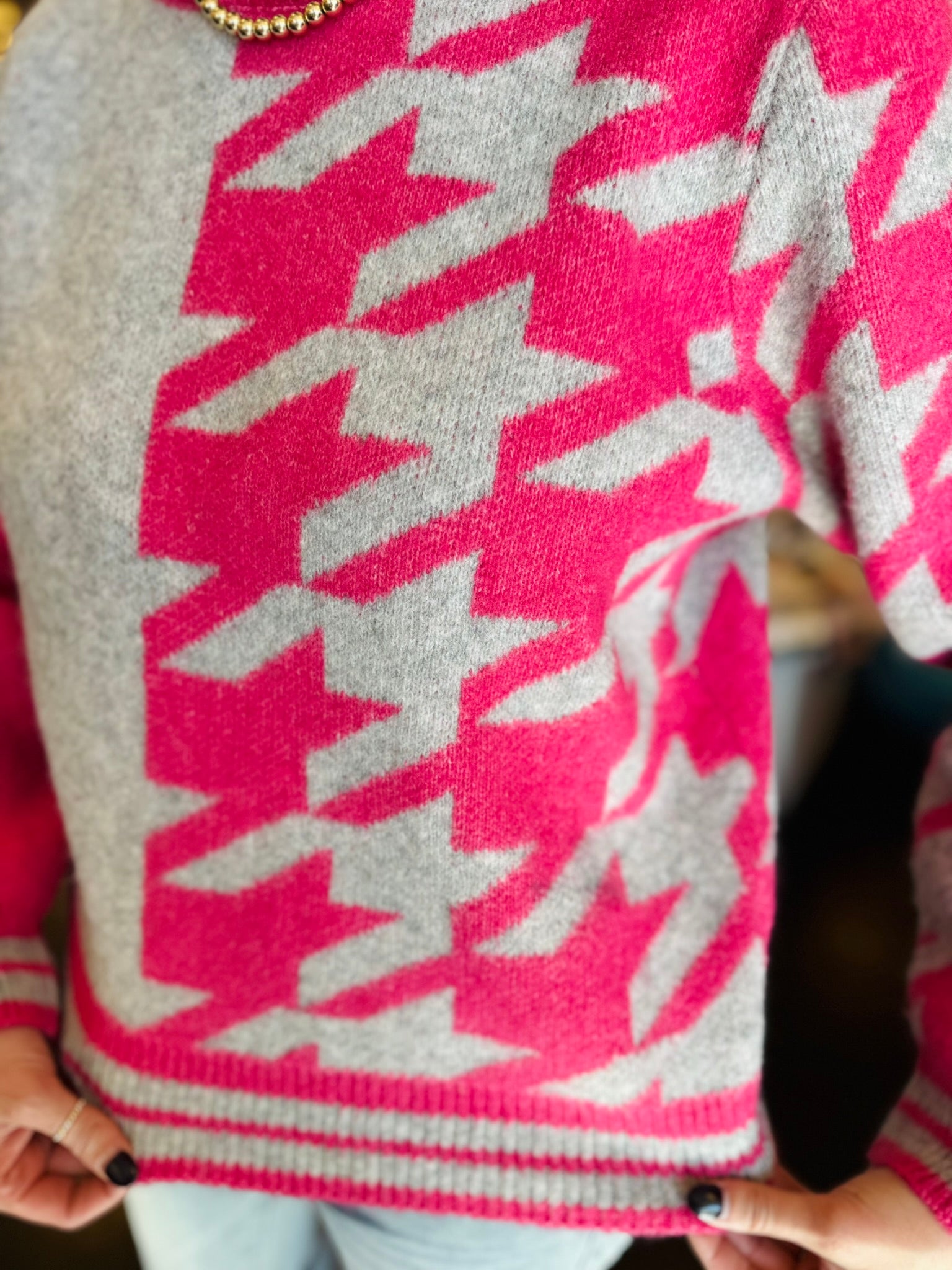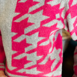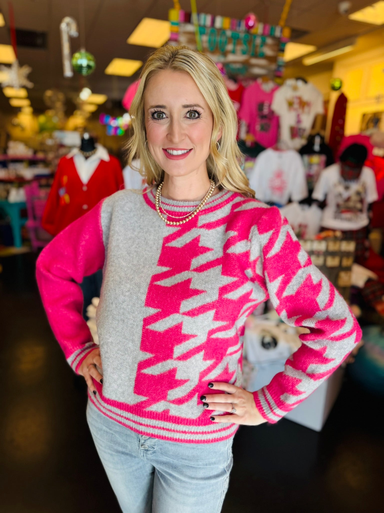 Make a cozy statement with the Pink Houndstooth Sweater! This stylish sweater top features a bold two-tone half houndstooth print that blends classic pattern with a modern twist. Designed with a rounded neckline, ribbed cuffs, and a striped bottom band, it delivers both comfort and standout style in one easy piece.